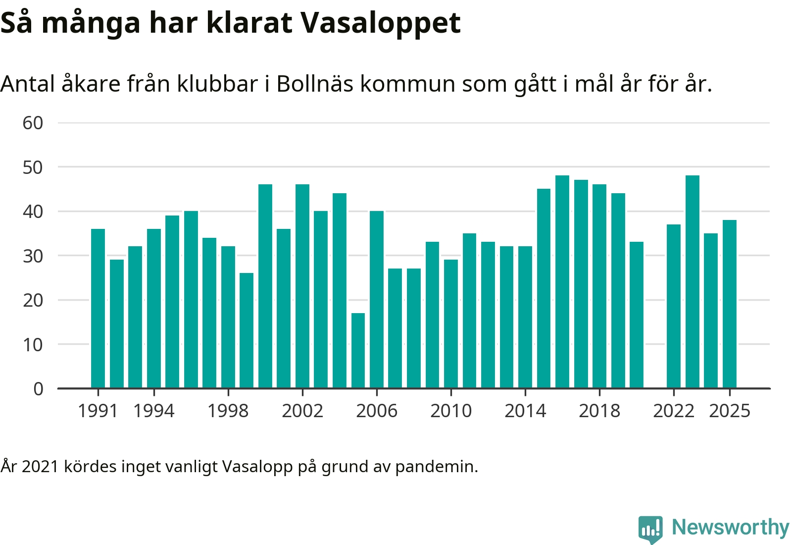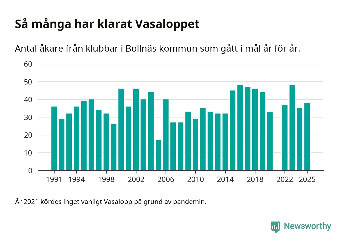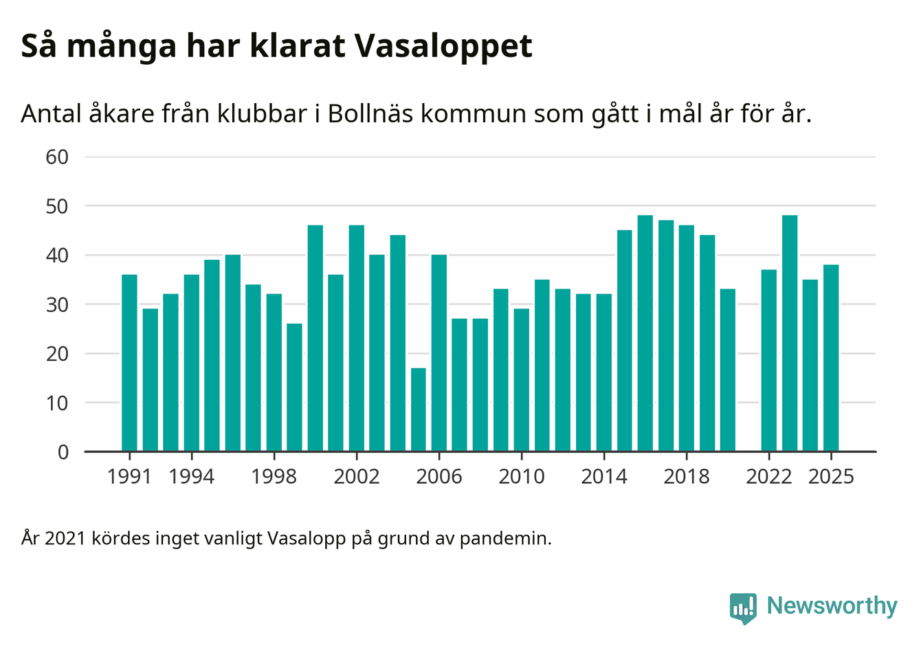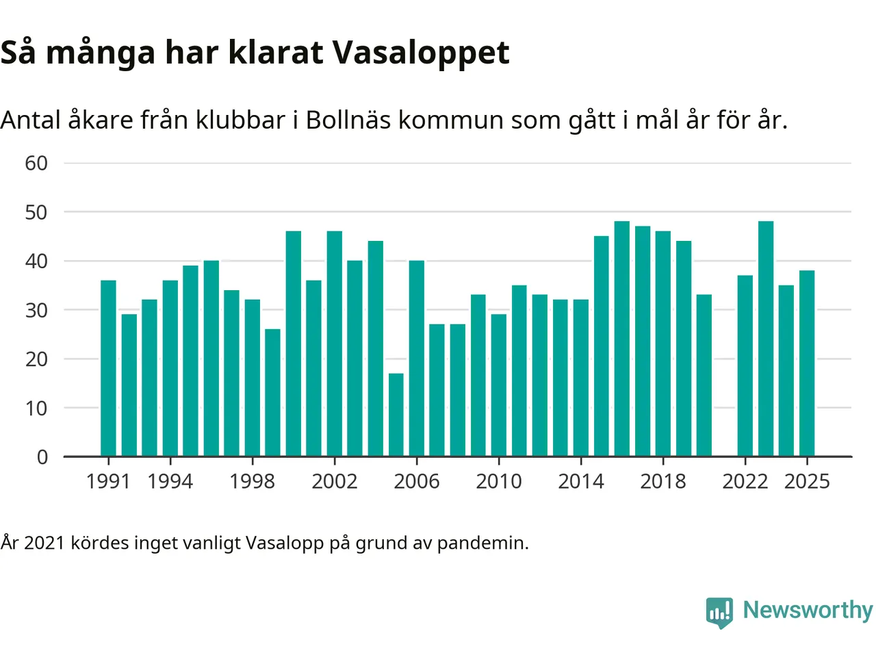 På söndag går starten för det 102:a Vasaloppet. Newsworthy har samlat in och sammanställt samtliga Vasaloppsresultat sedan 1991. Det ger en unik bild av hur skidåkare från klubbar i Bollnäs kommun har klarat sig genom åren.