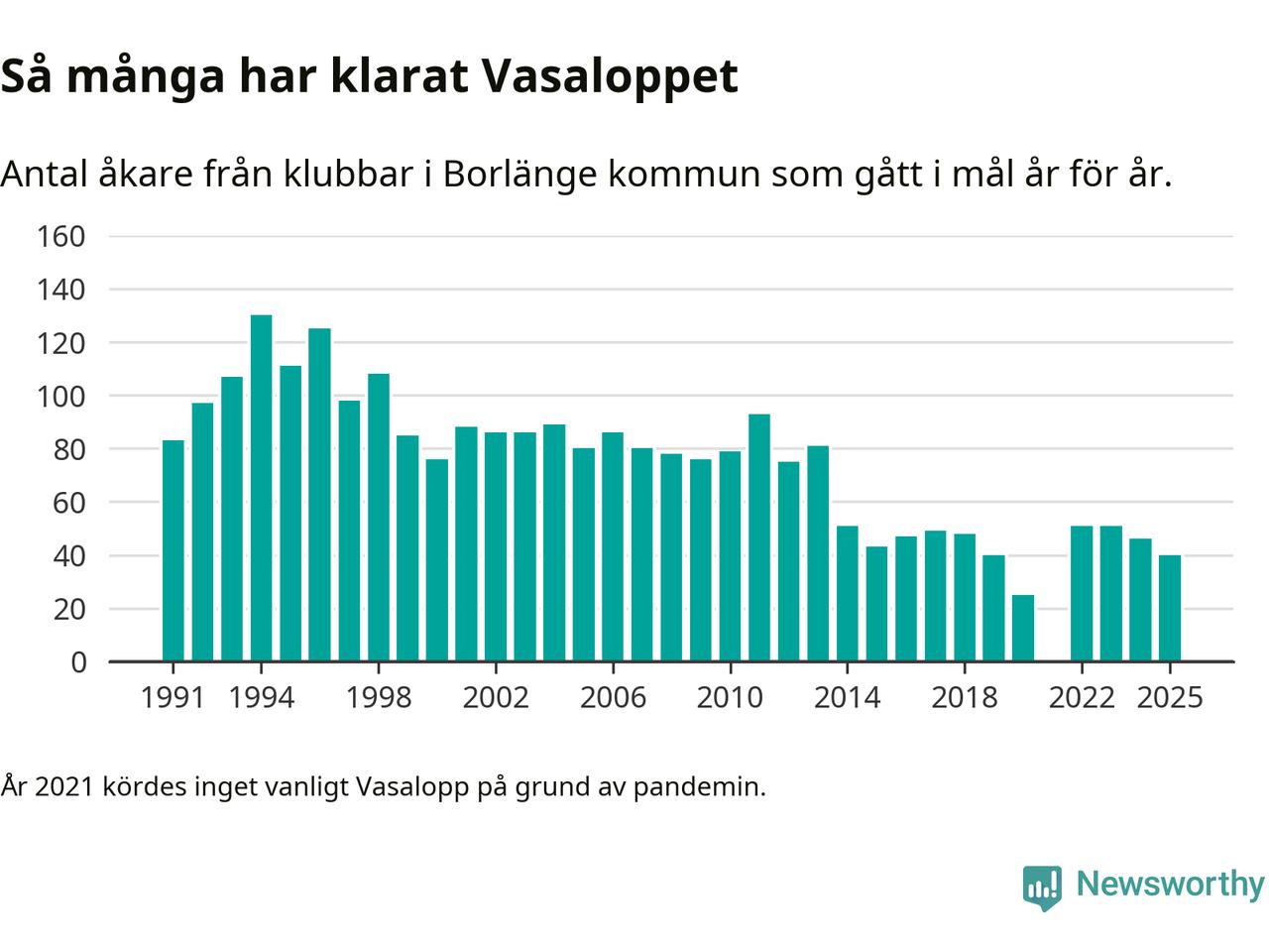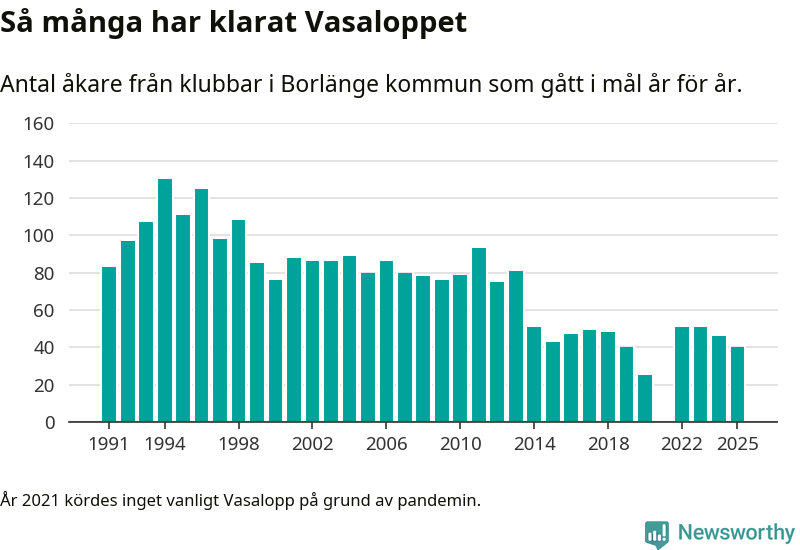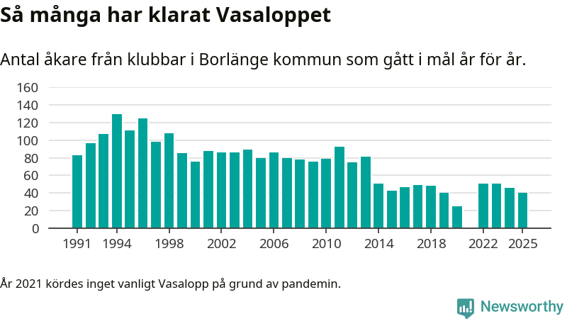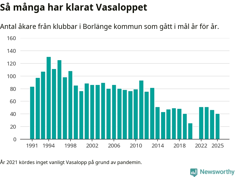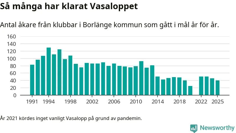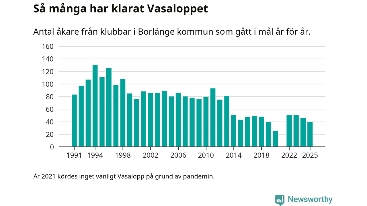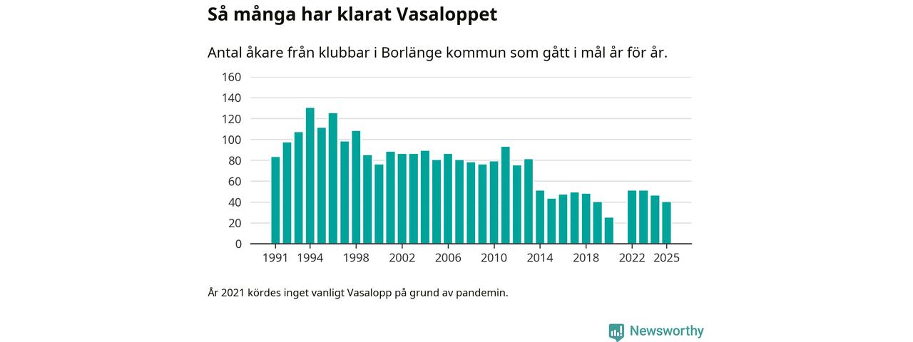 På söndag går starten för det 102:a Vasaloppet. Newsworthy har samlat in och sammanställt samtliga Vasaloppsresultat sedan 1991. Det ger en unik bild av hur skidåkare från klubbar i Borlänge kommun har klarat sig genom åren.