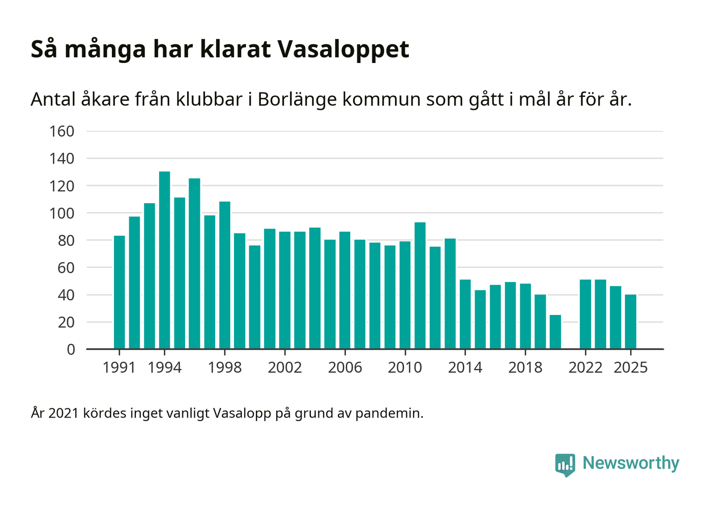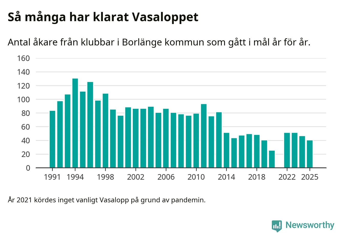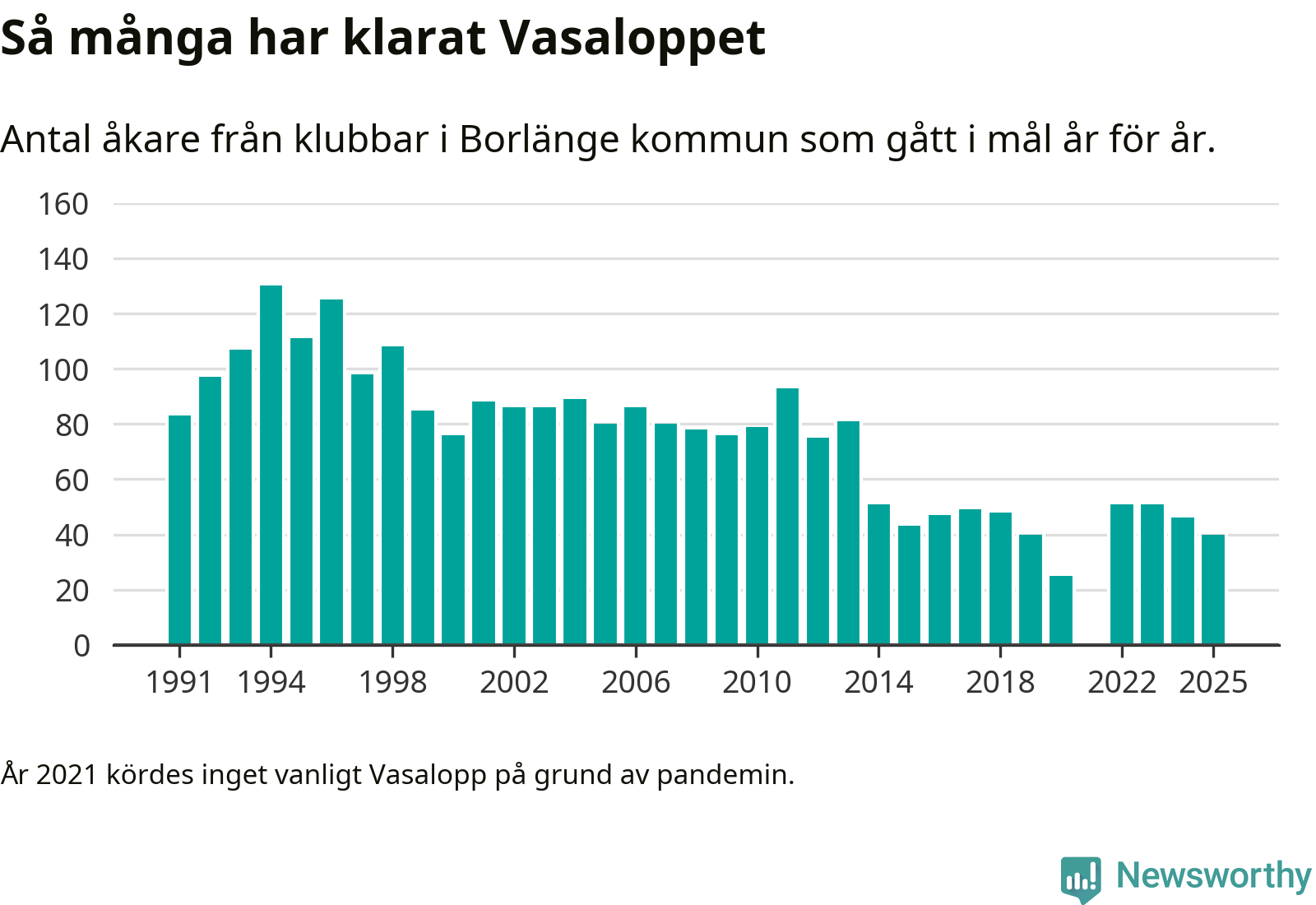 På söndag går starten för det 102:a Vasaloppet. Newsworthy har samlat in och sammanställt samtliga Vasaloppsresultat sedan 1991. Det ger en unik bild av hur skidåkare från klubbar i Borlänge kommun har klarat sig genom åren.