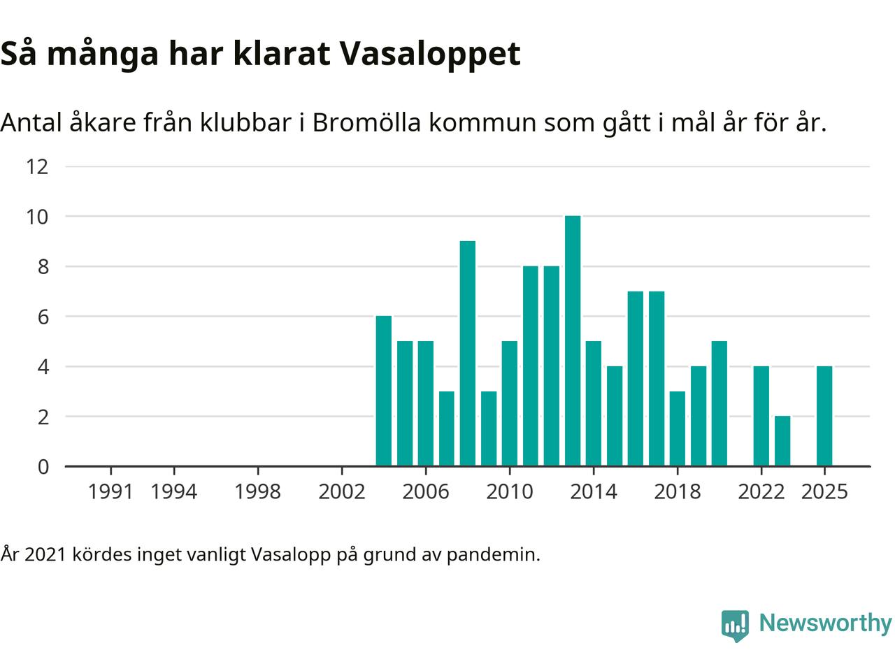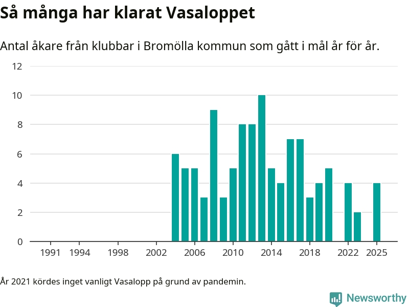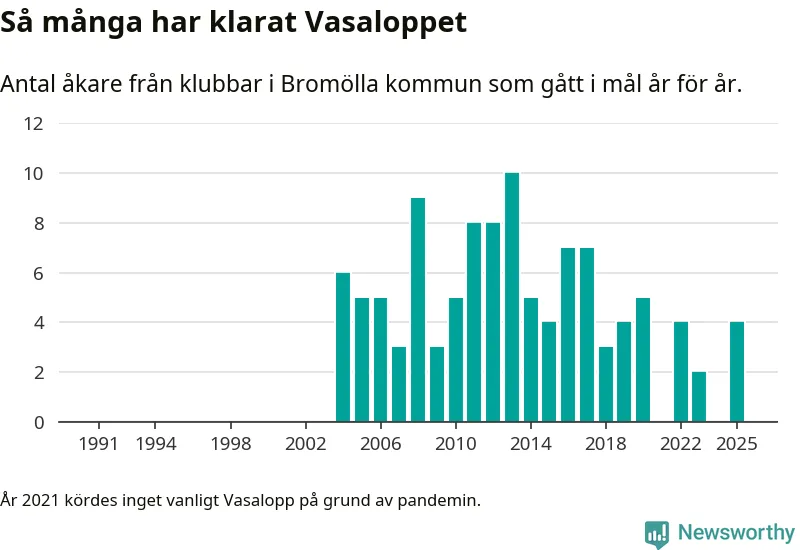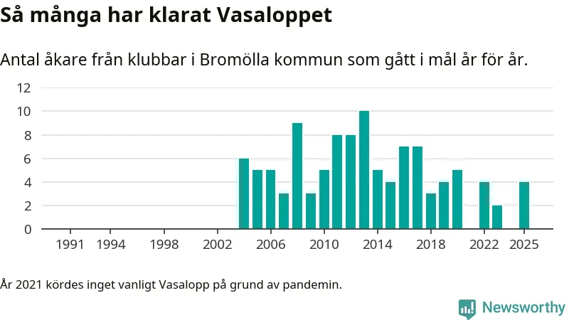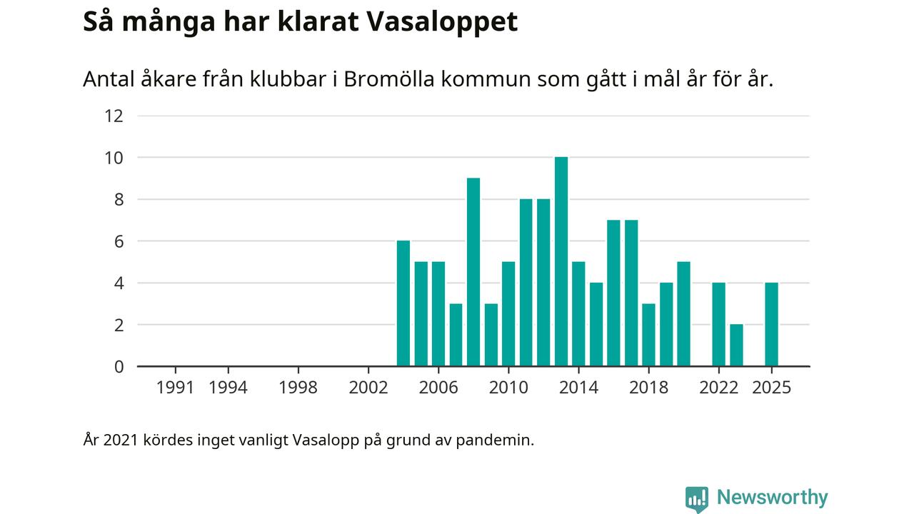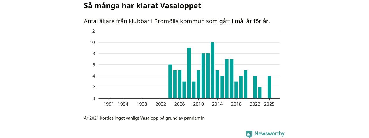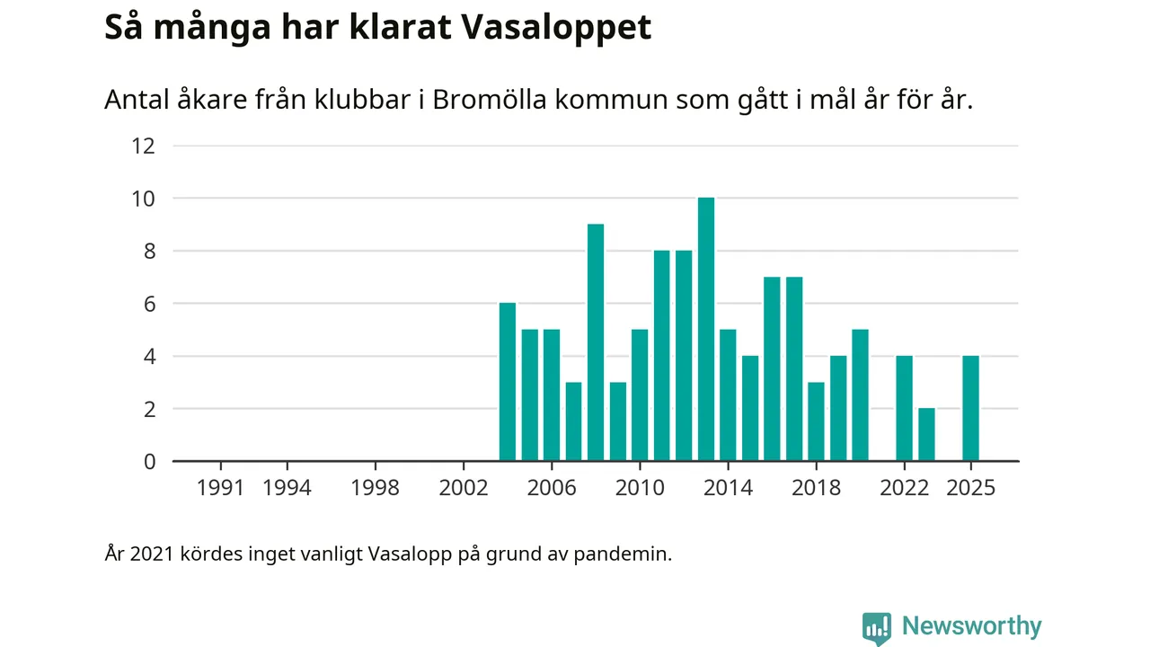 På söndag går starten för det 102:a Vasaloppet. Newsworthy har samlat in och sammanställt samtliga Vasaloppsresultat sedan 1991. Det ger en unik bild av hur skidåkare från klubbar i Bromölla kommun har klarat sig genom åren.