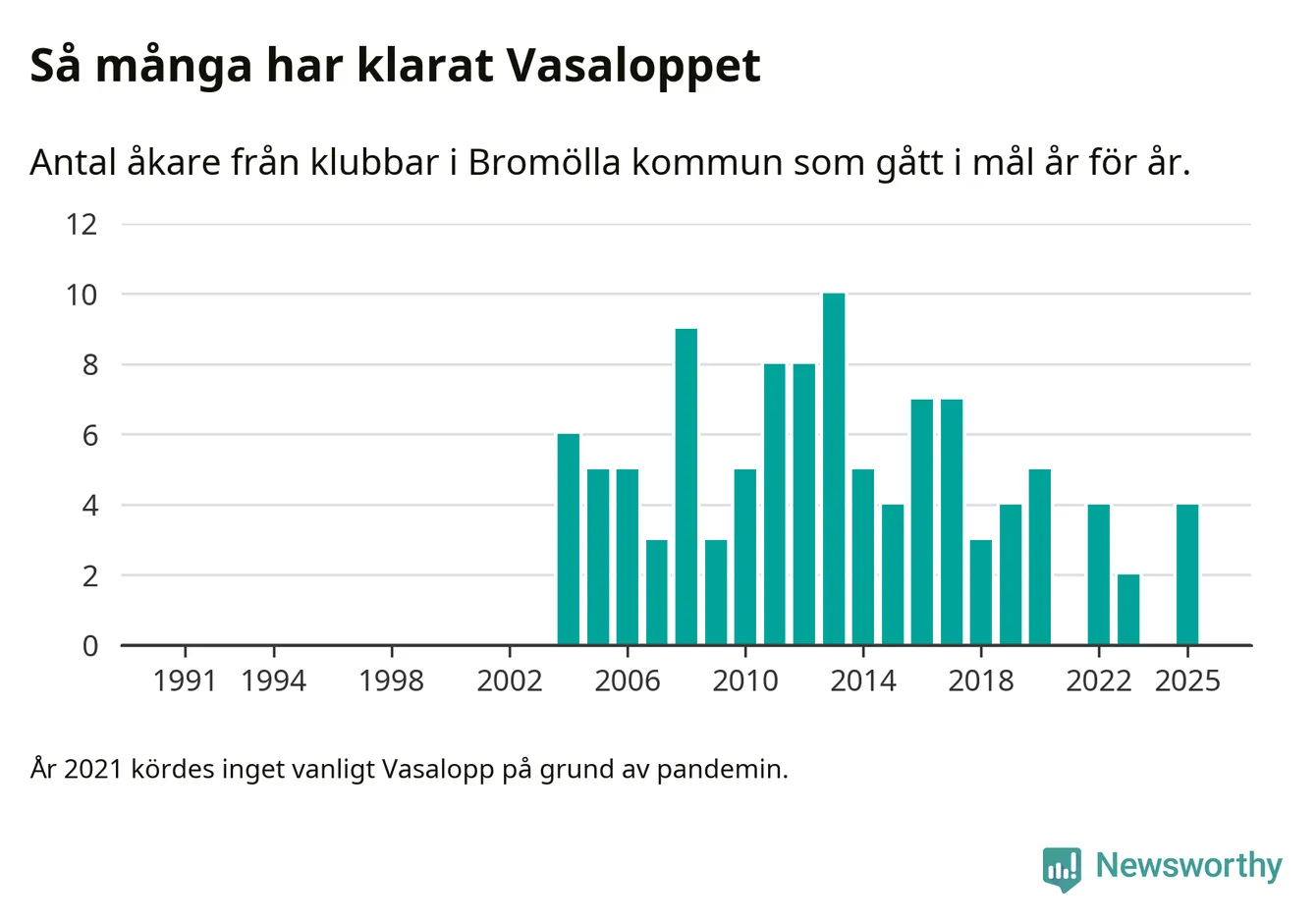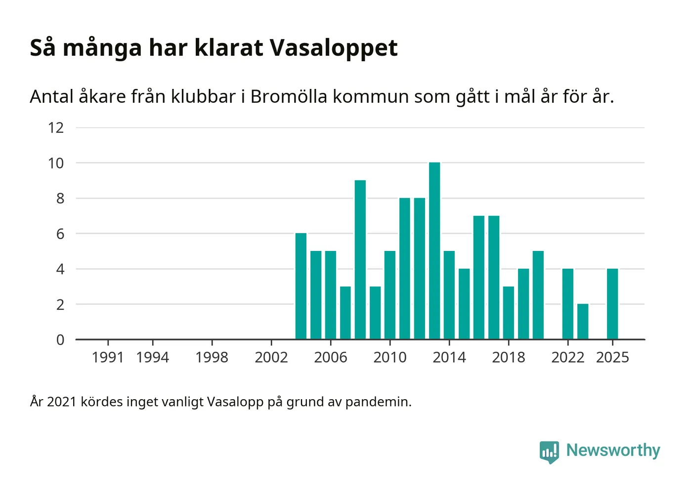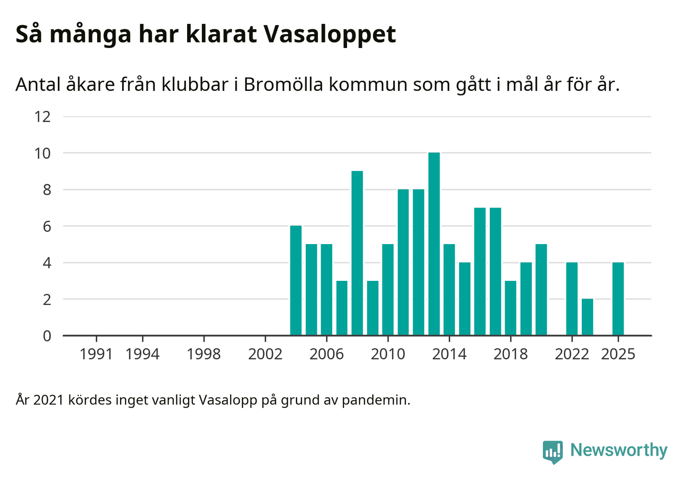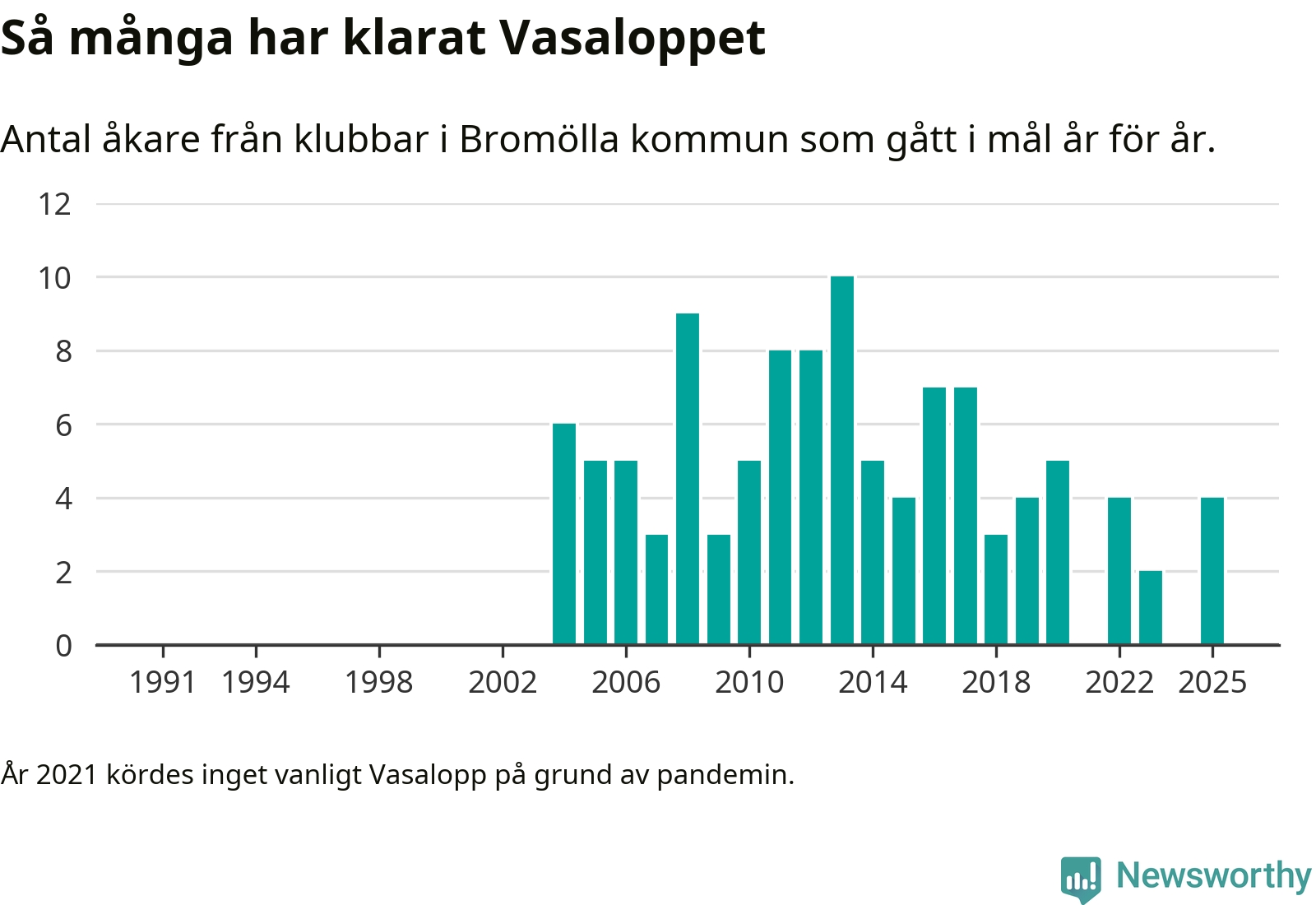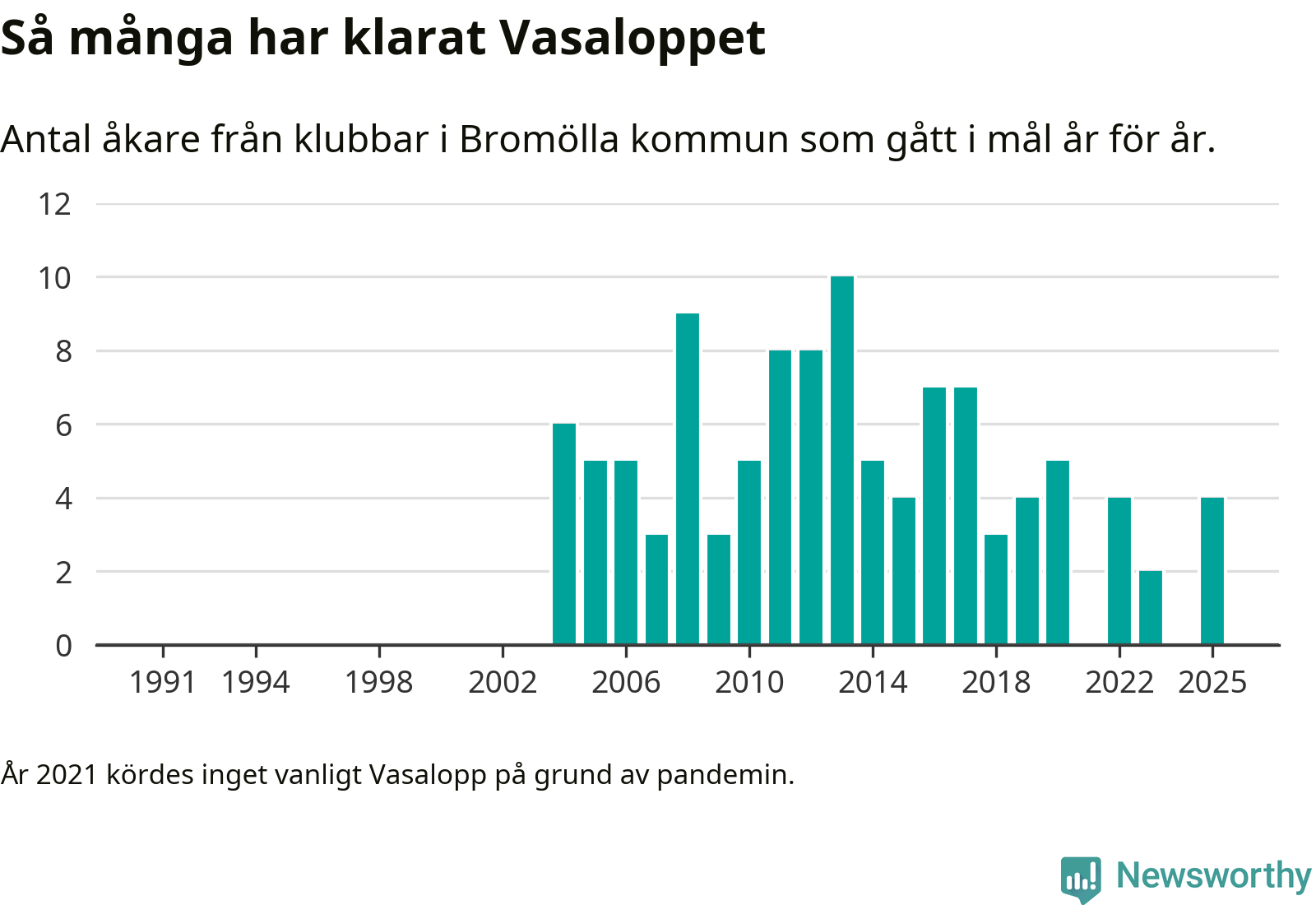 På söndag går starten för det 102:a Vasaloppet. Newsworthy har samlat in och sammanställt samtliga Vasaloppsresultat sedan 1991. Det ger en unik bild av hur skidåkare från klubbar i Bromölla kommun har klarat sig genom åren.