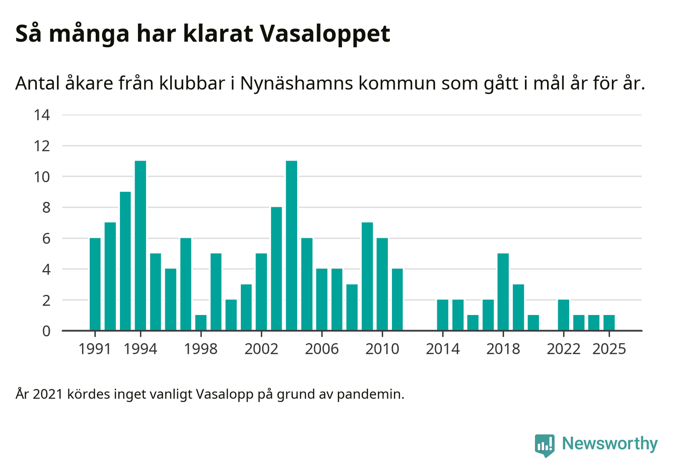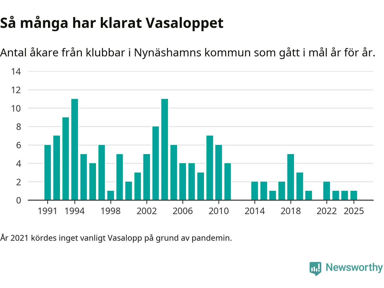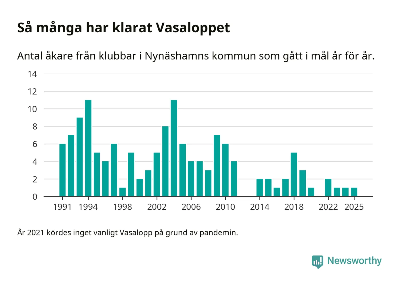 På söndag går starten för det 102:a Vasaloppet. Newsworthy har samlat in och sammanställt samtliga Vasaloppsresultat sedan 1991. Det ger en unik bild av hur skidåkare från klubbar i Nynäshamns kommun har klarat sig genom åren.