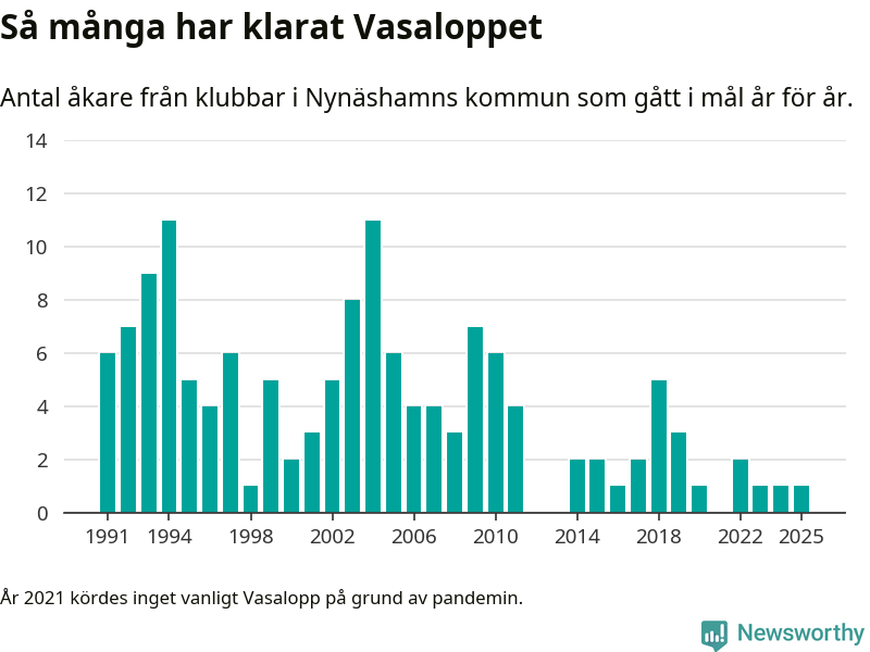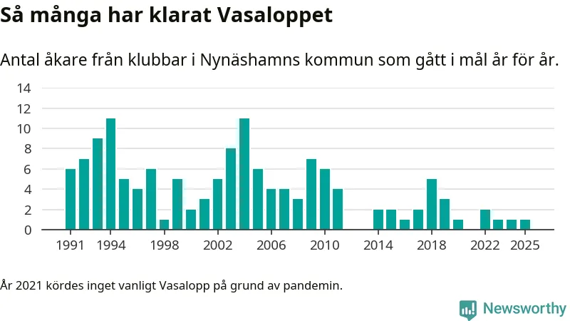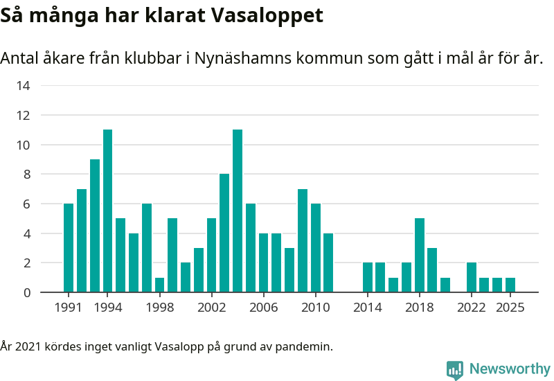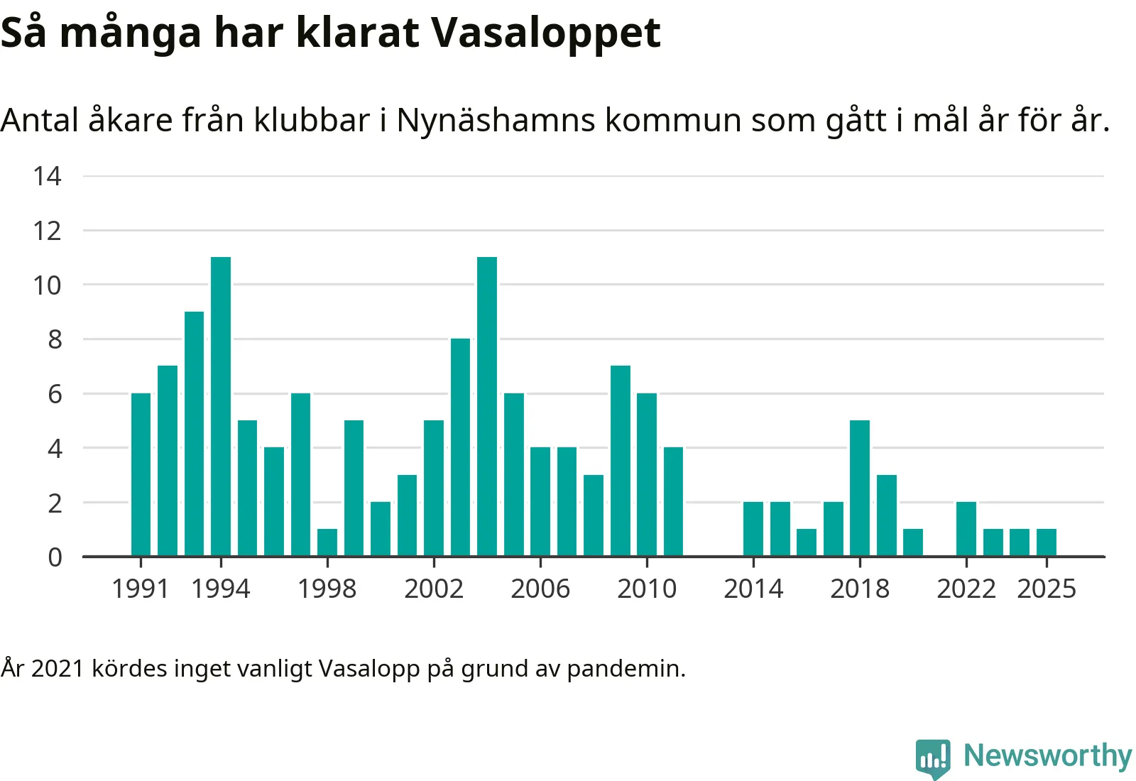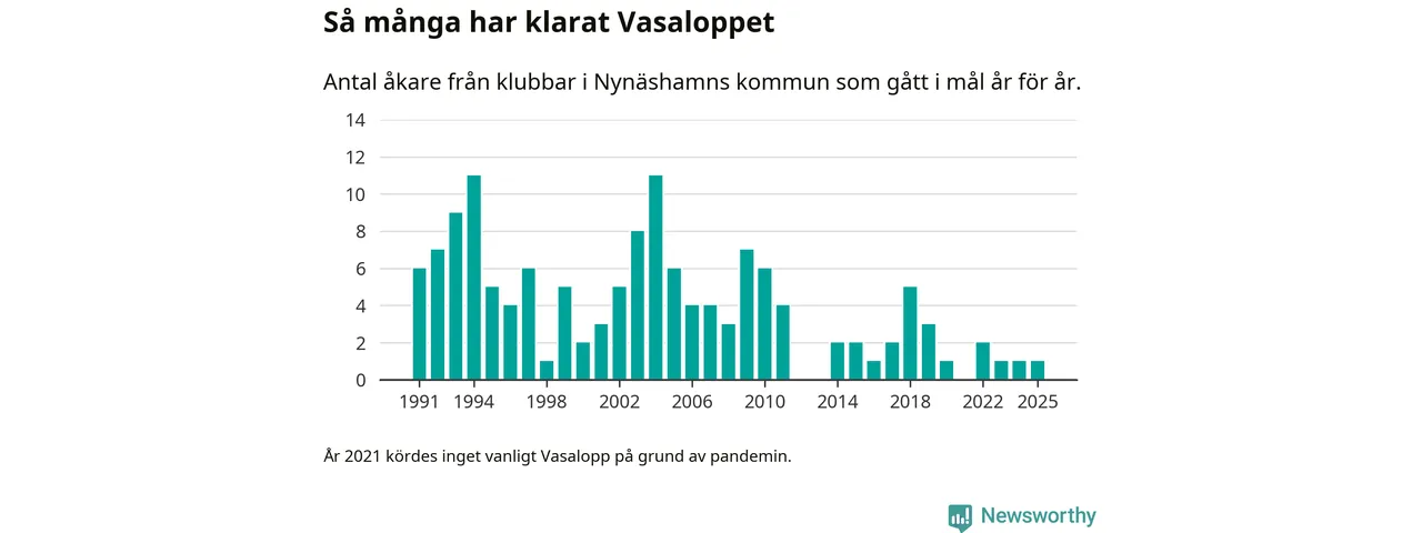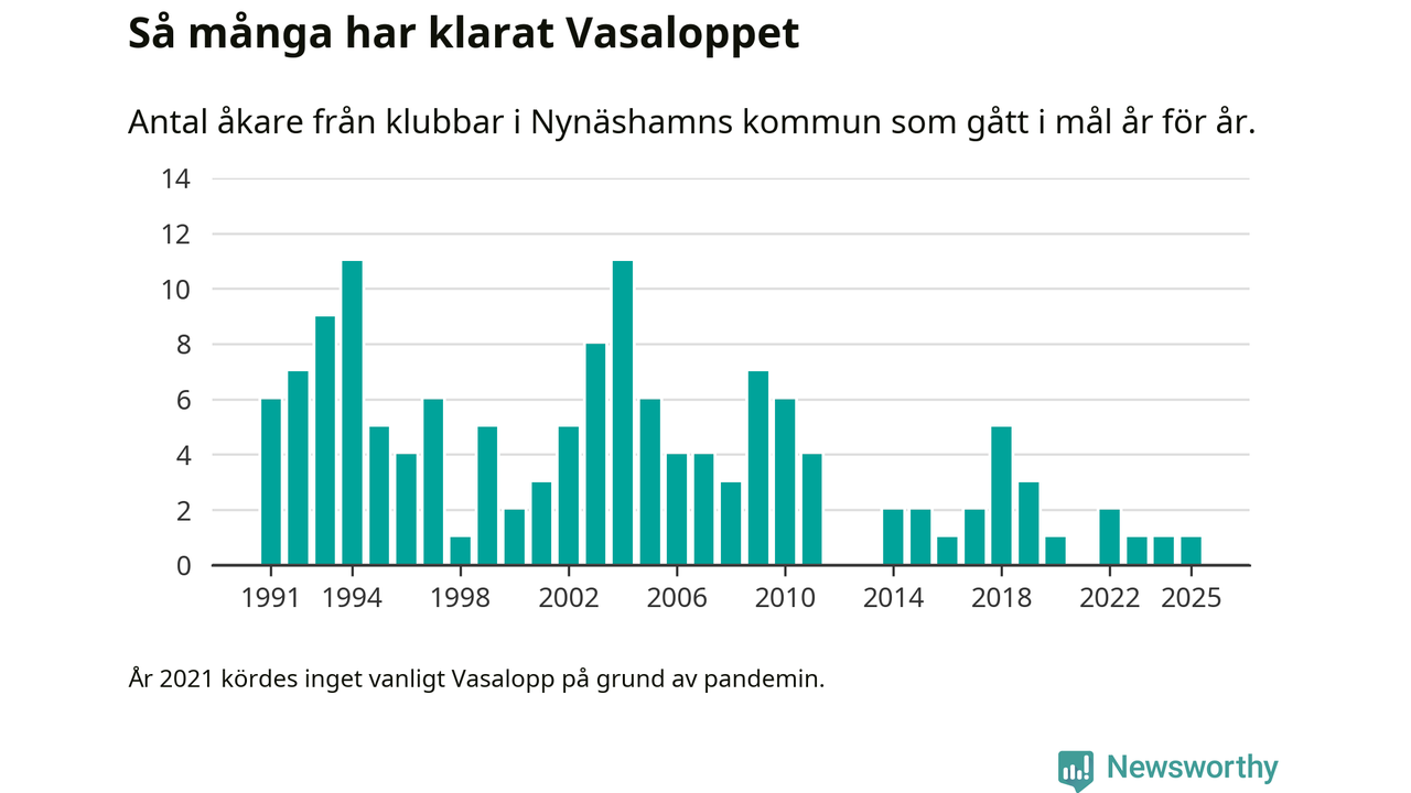 På söndag går starten för det 102:a Vasaloppet. Newsworthy har samlat in och sammanställt samtliga Vasaloppsresultat sedan 1991. Det ger en unik bild av hur skidåkare från klubbar i Nynäshamns kommun har klarat sig genom åren.