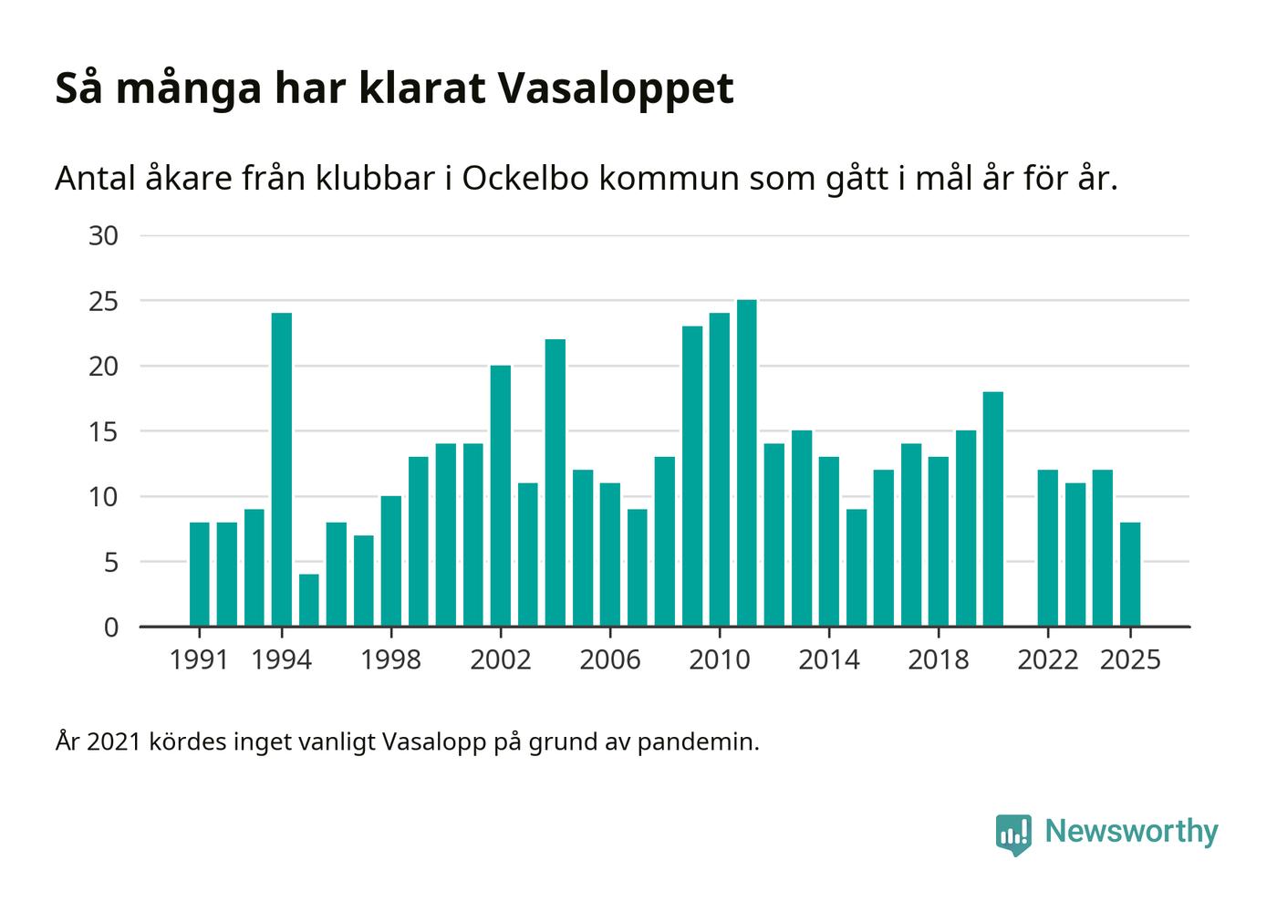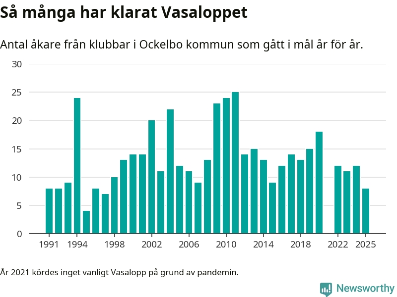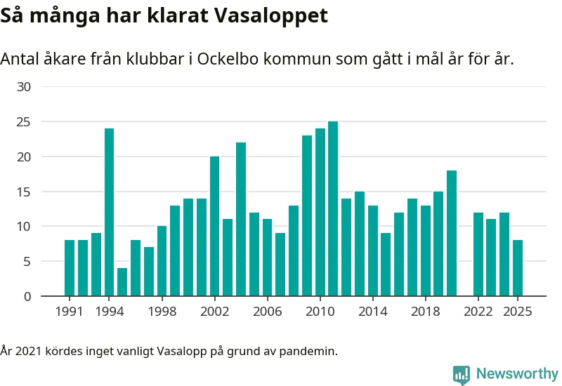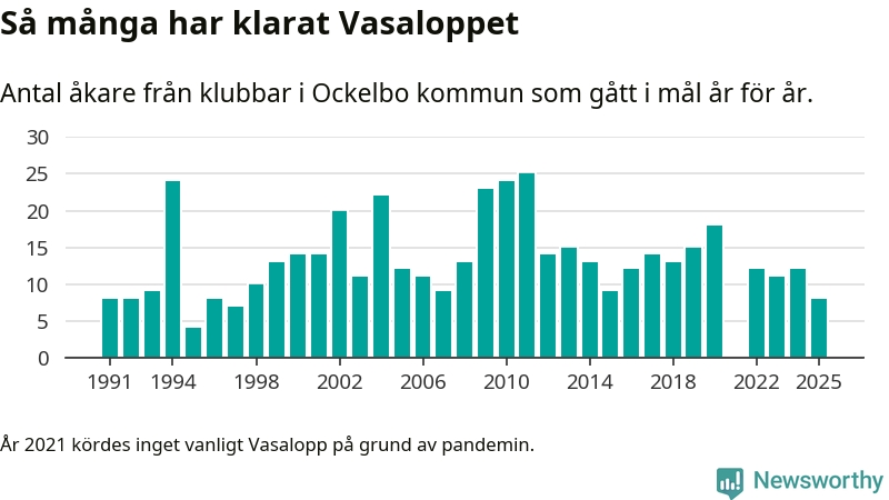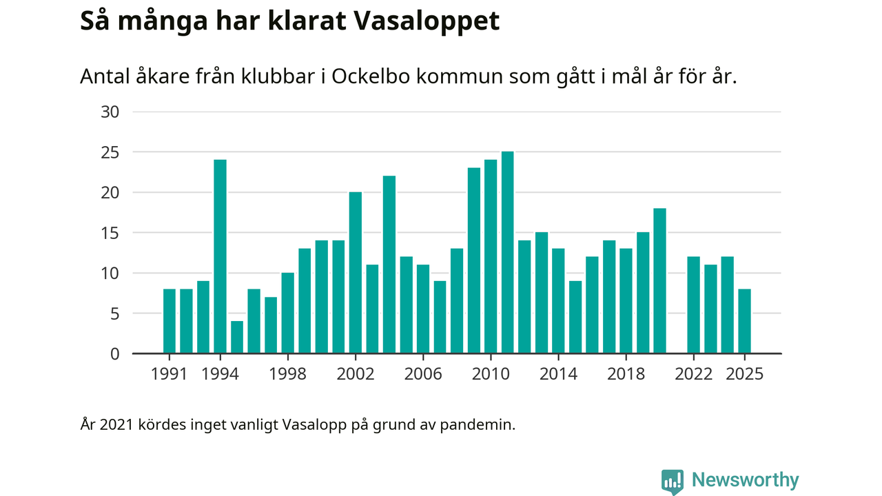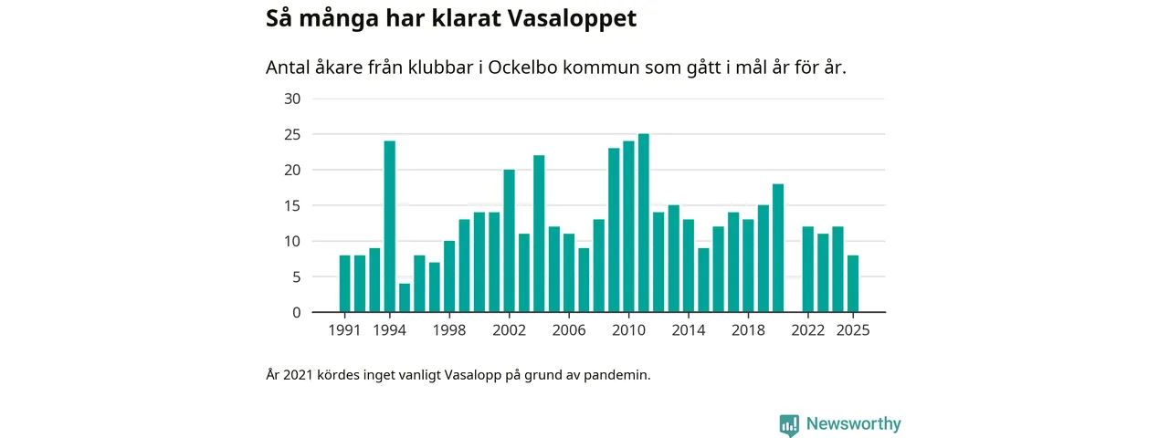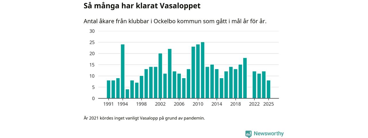 På söndag går starten för det 102:a Vasaloppet. Newsworthy har samlat in och sammanställt samtliga Vasaloppsresultat sedan 1991. Det ger en unik bild av hur skidåkare från klubbar i Ockelbo kommun har klarat sig genom åren.