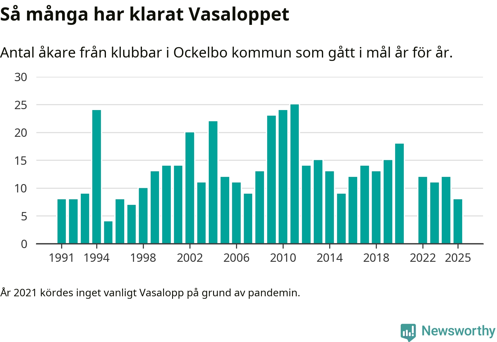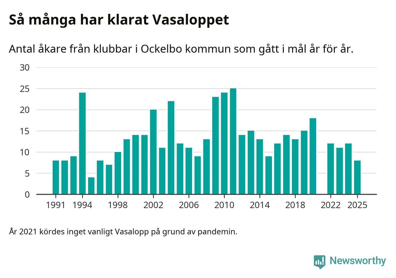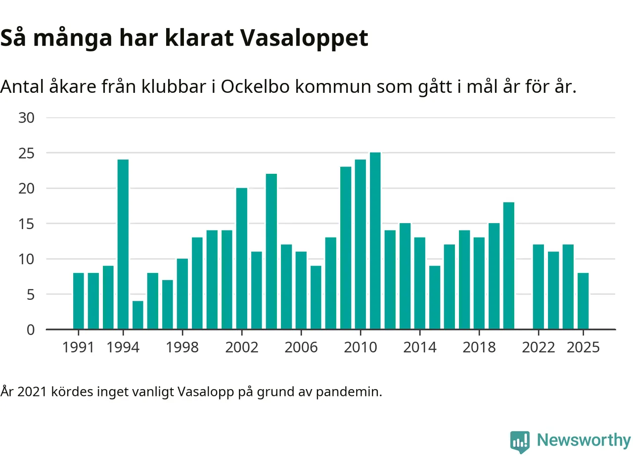 På söndag går starten för det 102:a Vasaloppet. Newsworthy har samlat in och sammanställt samtliga Vasaloppsresultat sedan 1991. Det ger en unik bild av hur skidåkare från klubbar i Ockelbo kommun har klarat sig genom åren.