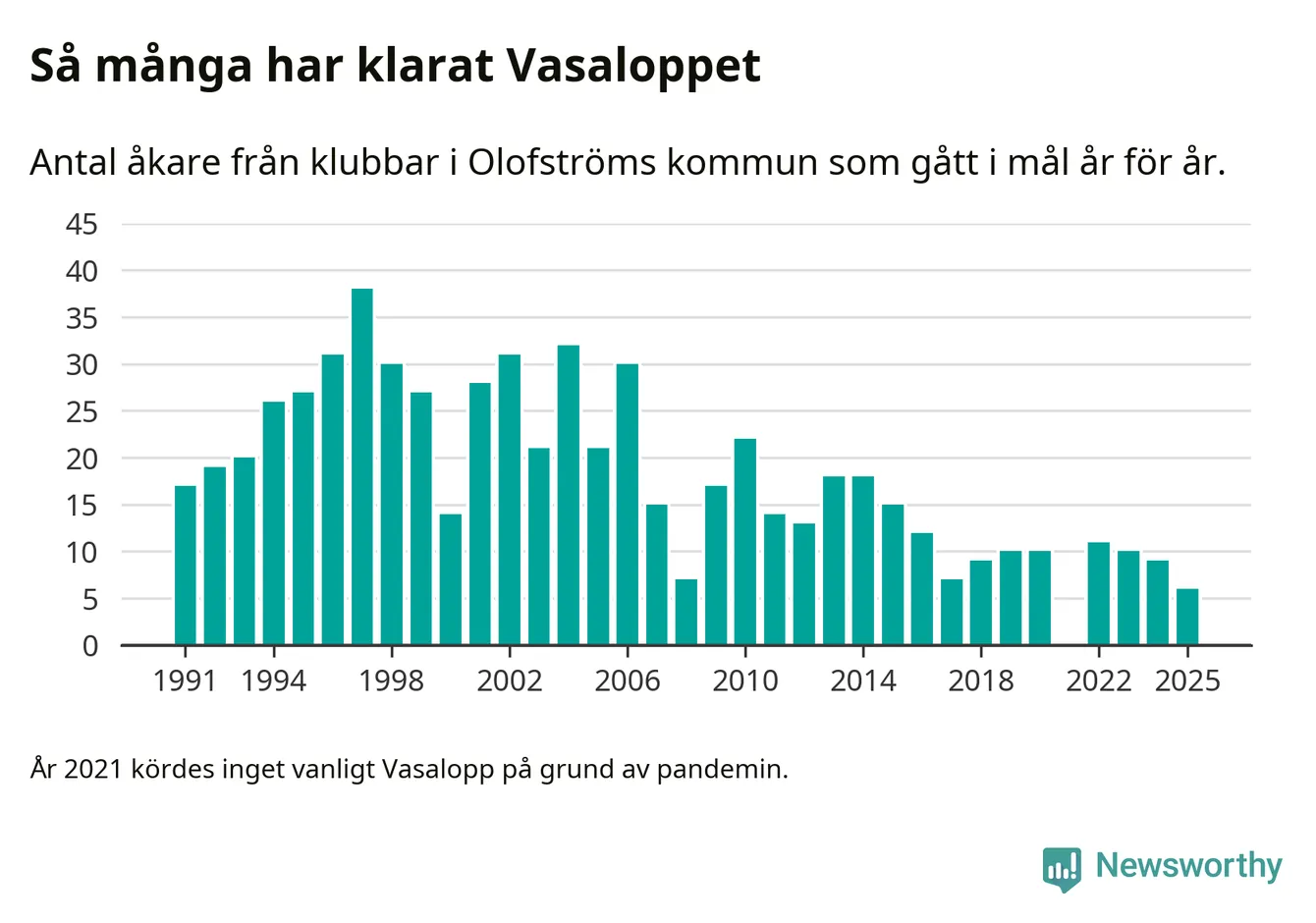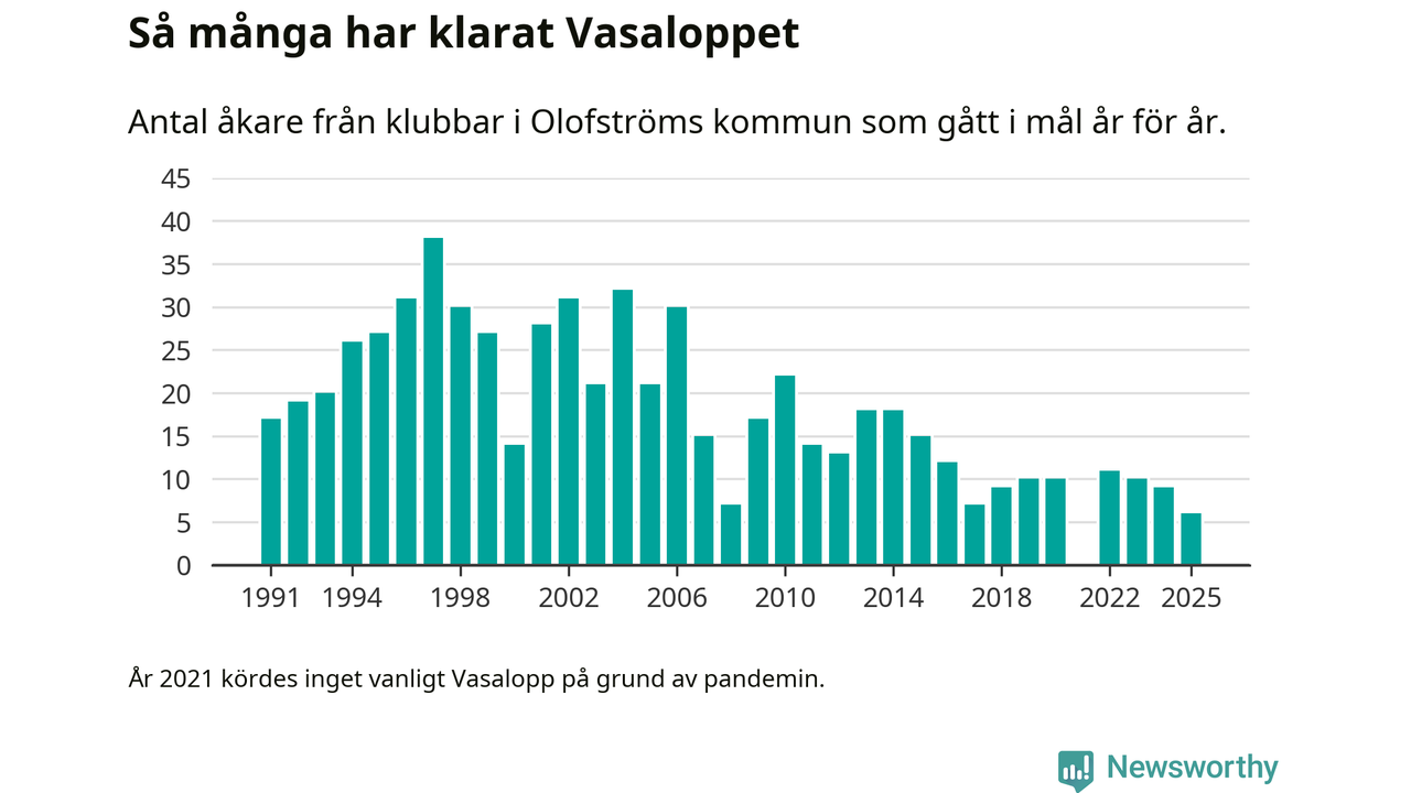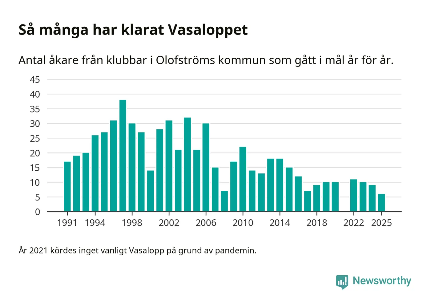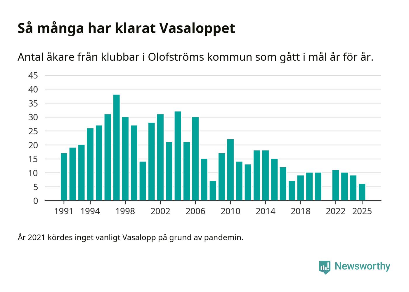 På söndag går starten för det 102:a Vasaloppet. Newsworthy har samlat in och sammanställt samtliga Vasaloppsresultat sedan 1991. Det ger en unik bild av hur skidåkare från klubbar i Olofströms kommun har klarat sig genom åren.
