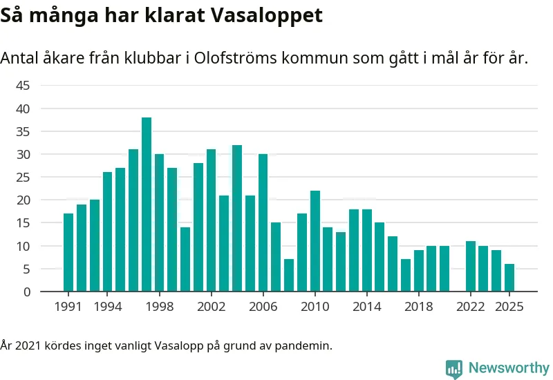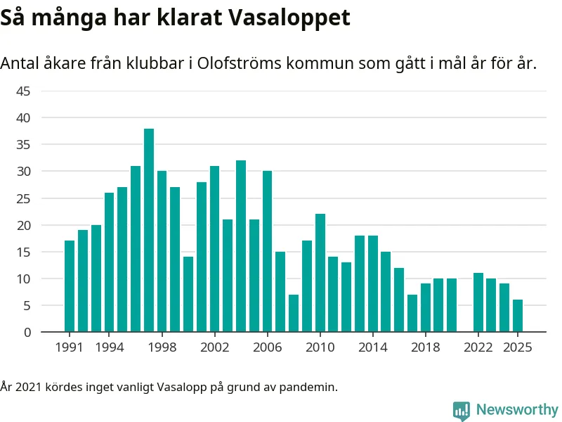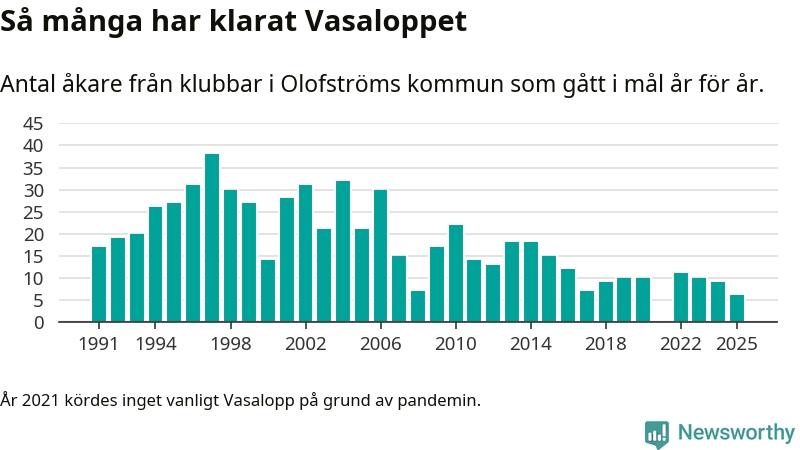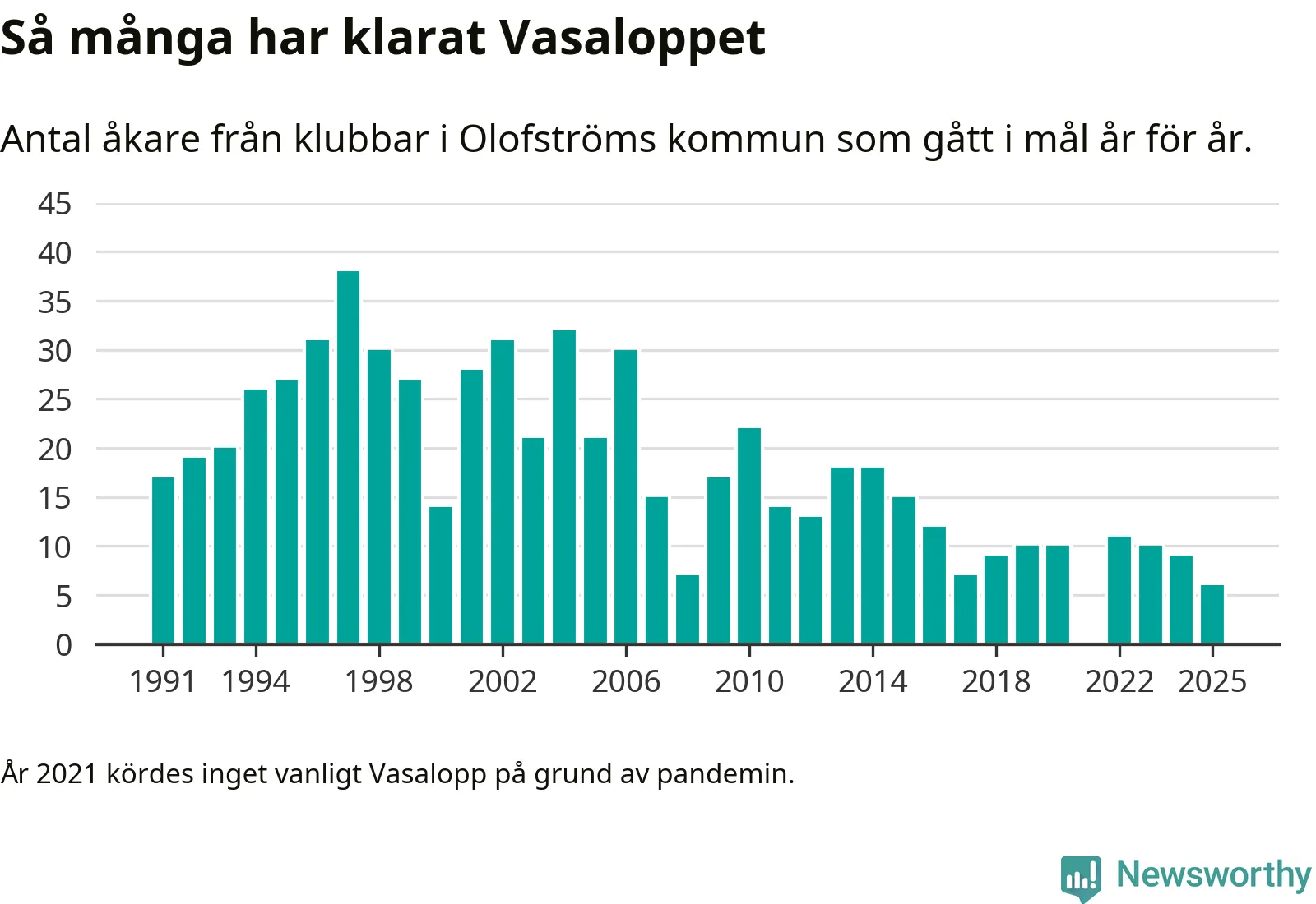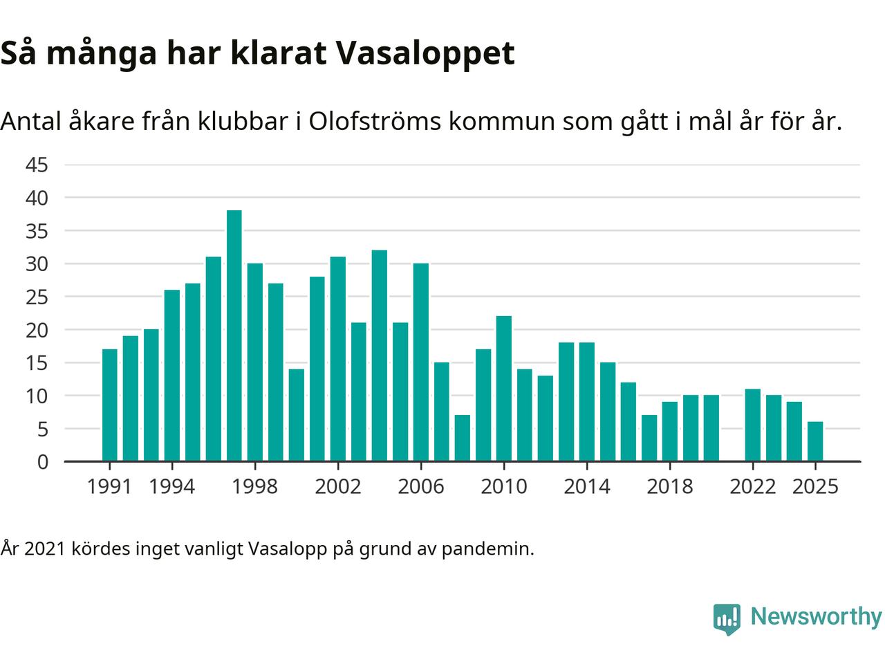 På söndag går starten för det 102:a Vasaloppet. Newsworthy har samlat in och sammanställt samtliga Vasaloppsresultat sedan 1991. Det ger en unik bild av hur skidåkare från klubbar i Olofströms kommun har klarat sig genom åren.