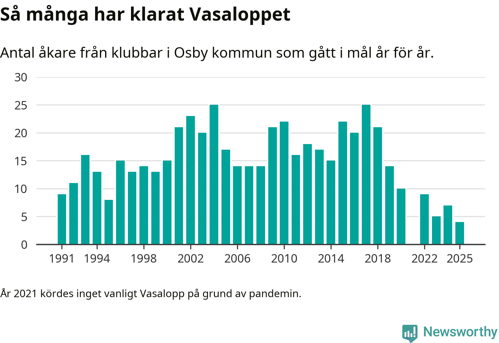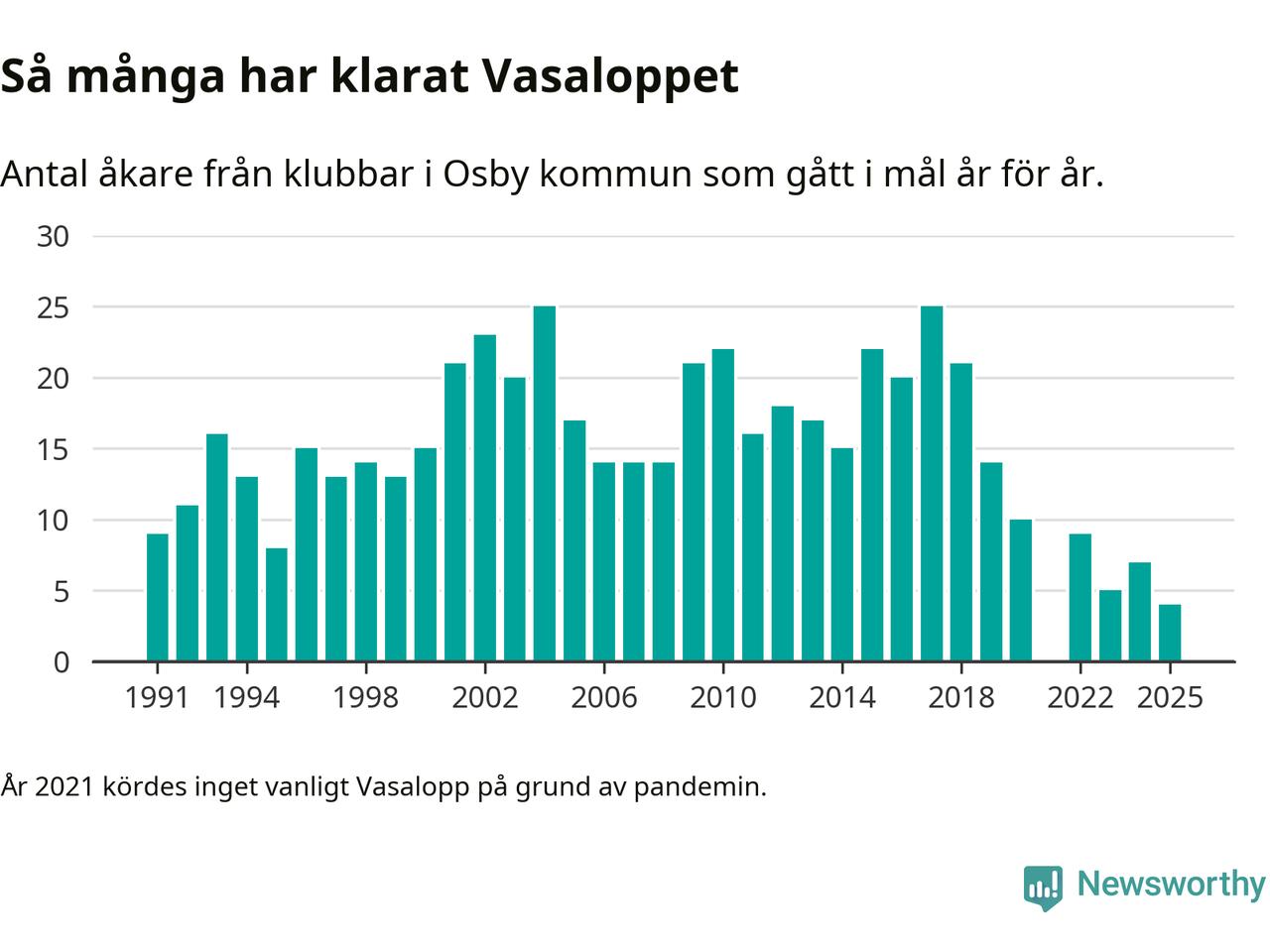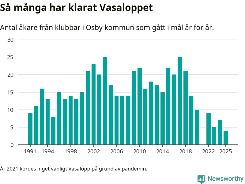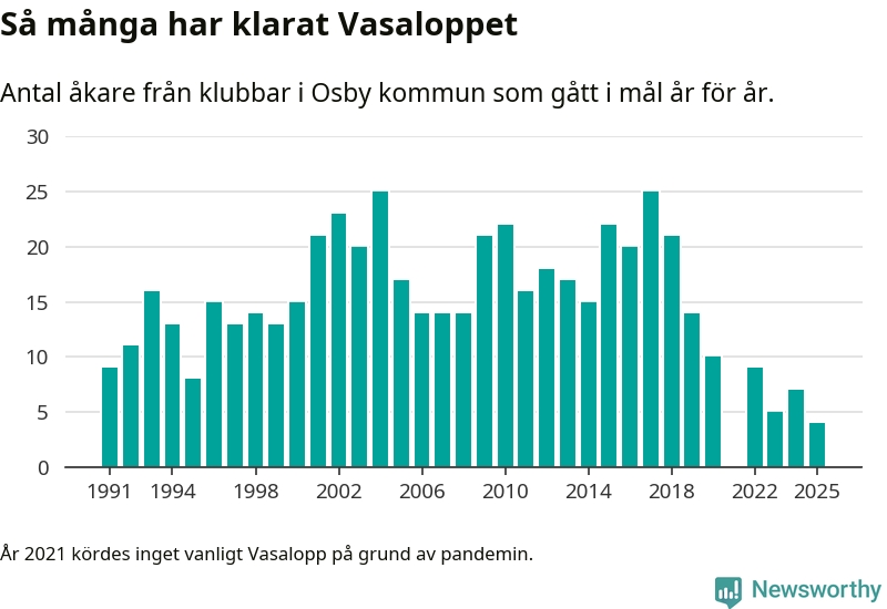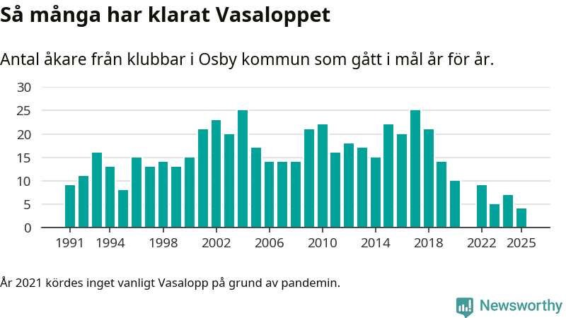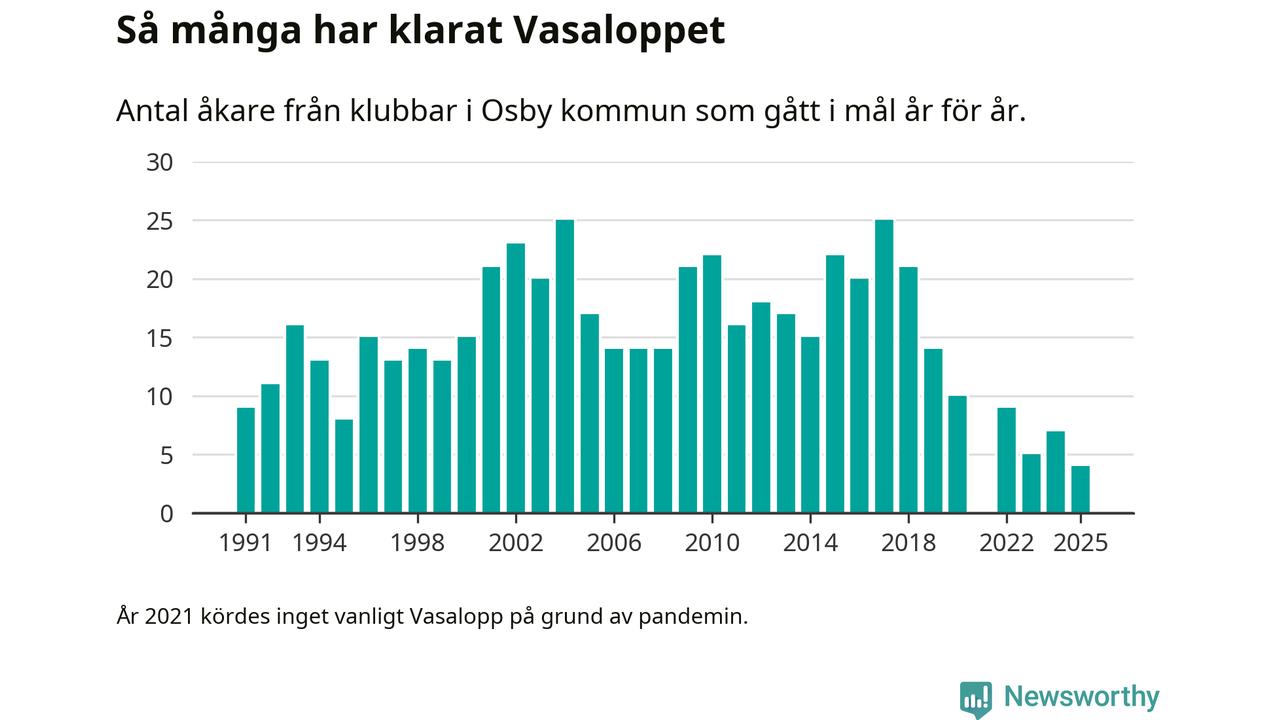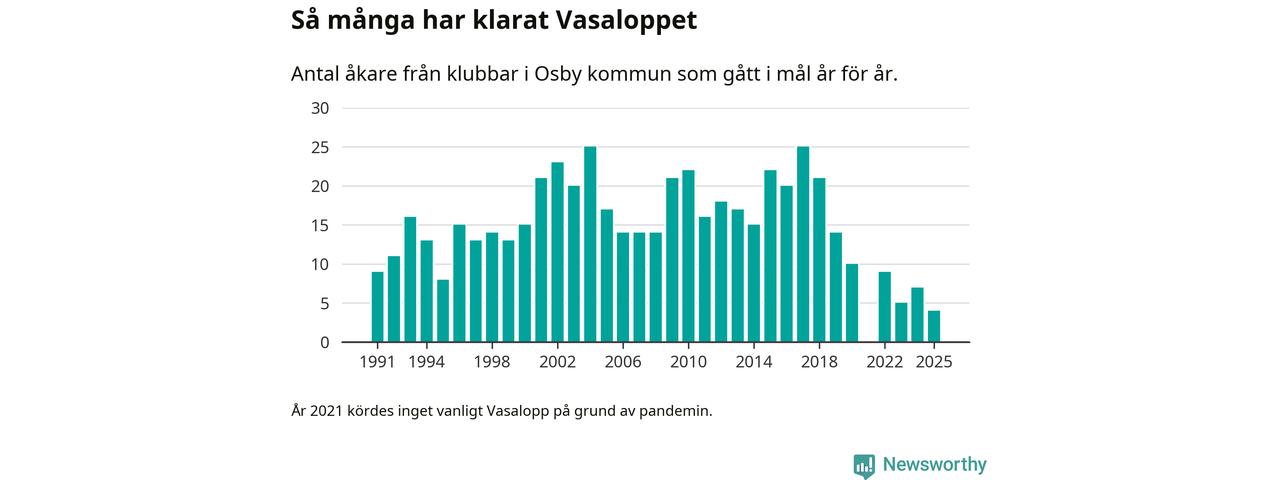 På söndag går starten för det 102:a Vasaloppet. Newsworthy har samlat in och sammanställt samtliga Vasaloppsresultat sedan 1991. Det ger en unik bild av hur skidåkare från klubbar i Osby kommun har klarat sig genom åren.