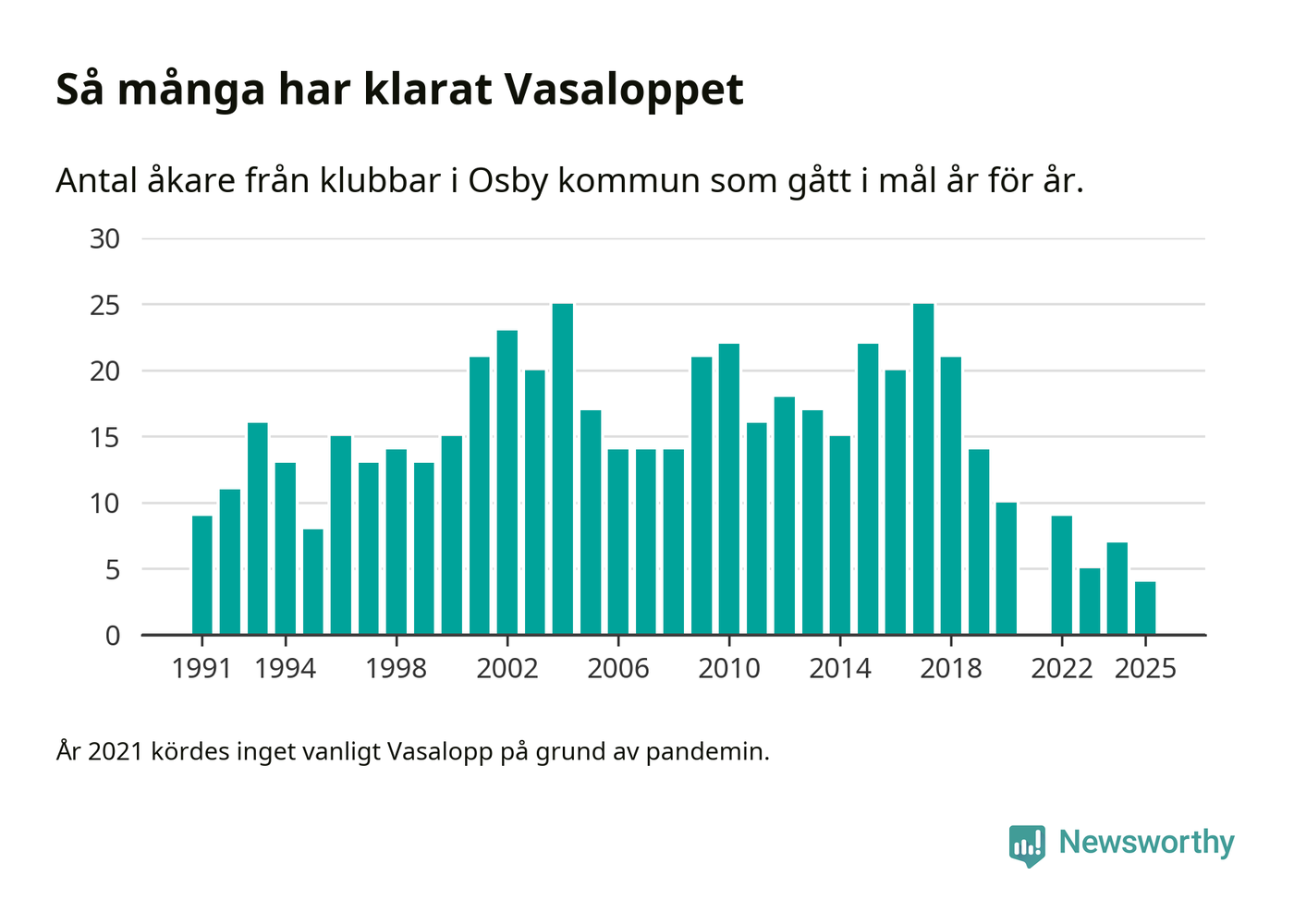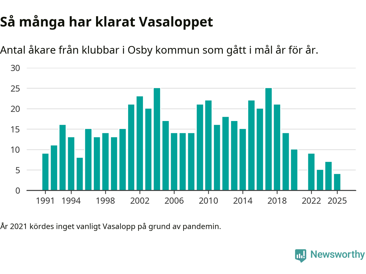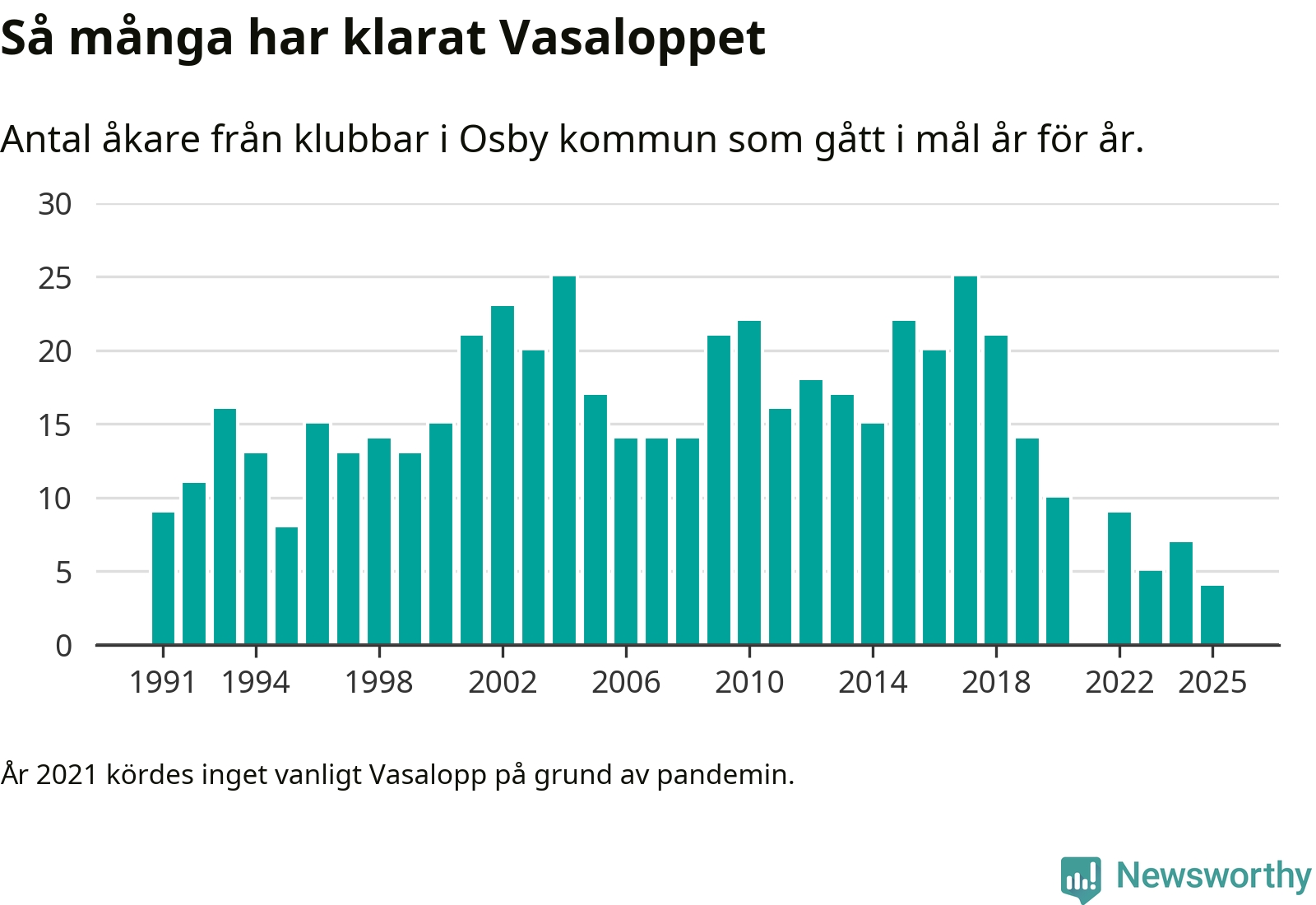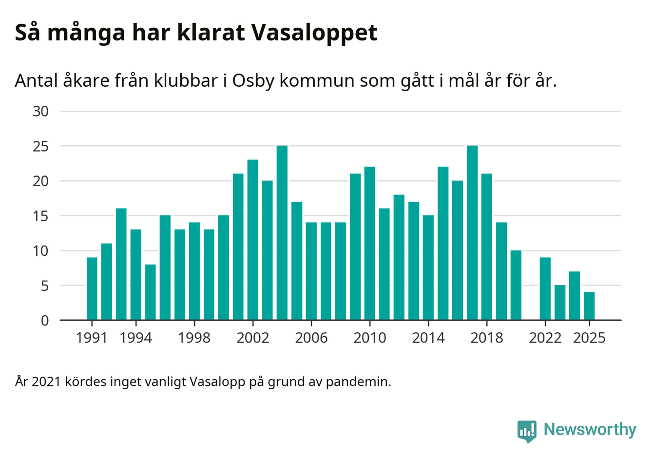 På söndag går starten för det 102:a Vasaloppet. Newsworthy har samlat in och sammanställt samtliga Vasaloppsresultat sedan 1991. Det ger en unik bild av hur skidåkare från klubbar i Osby kommun har klarat sig genom åren.