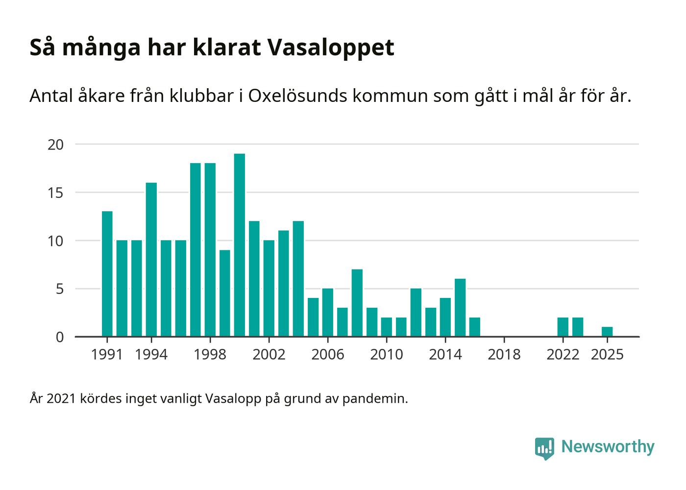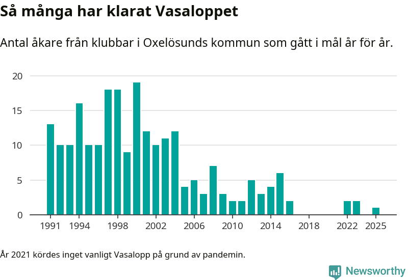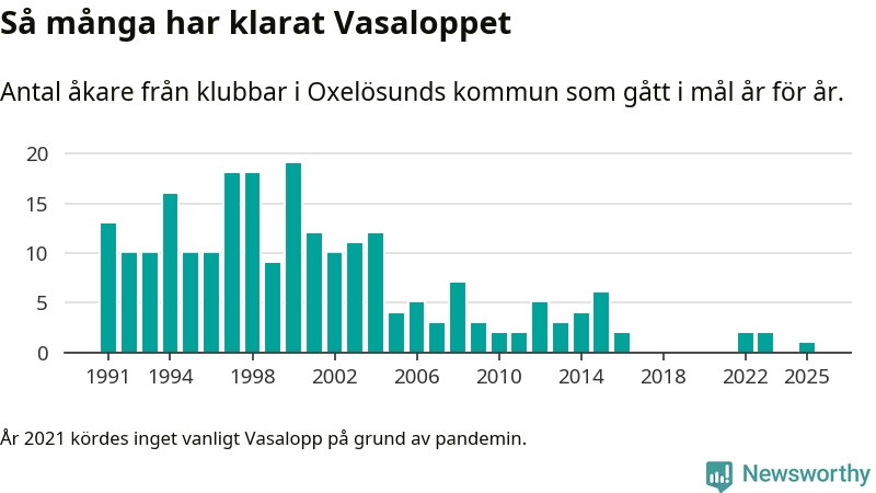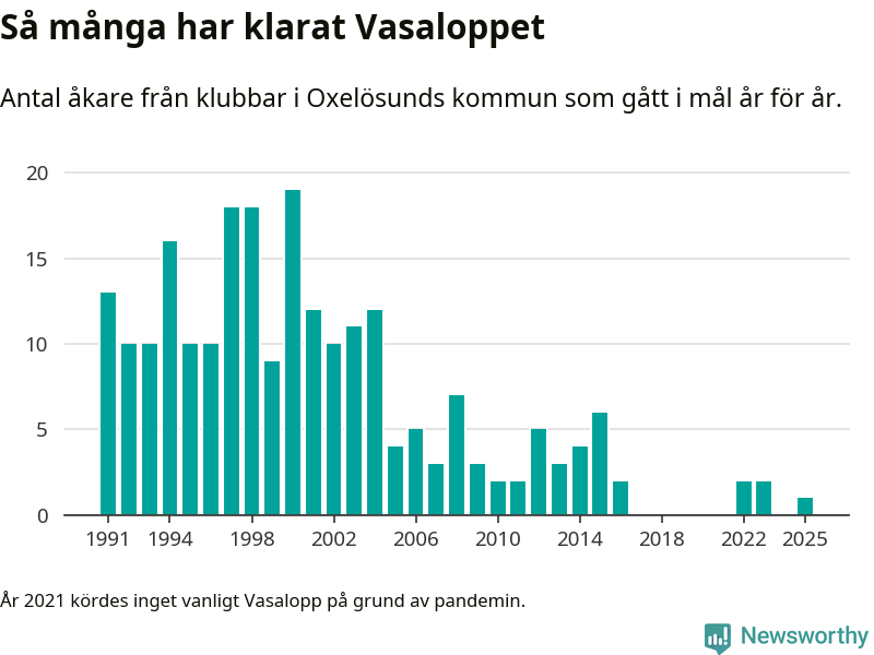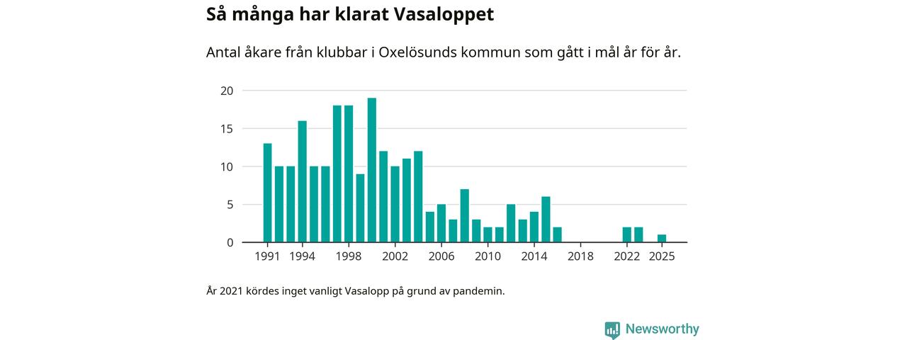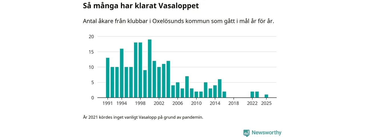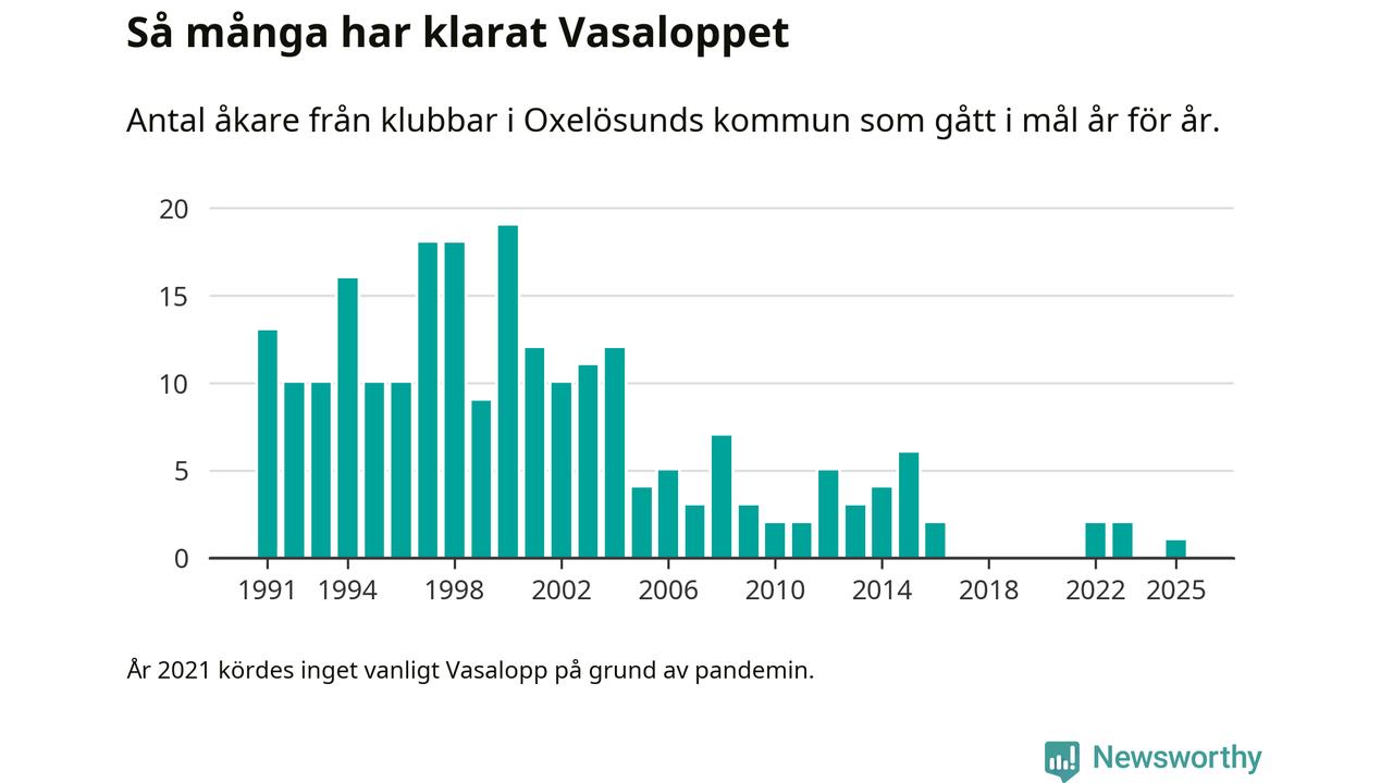 På söndag går starten för det 102:a Vasaloppet. Newsworthy har samlat in och sammanställt samtliga Vasaloppsresultat sedan 1991. Det ger en unik bild av hur skidåkare från klubbar i Oxelösunds kommun har klarat sig genom åren.