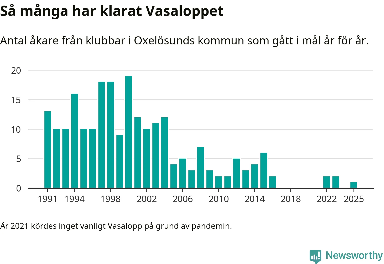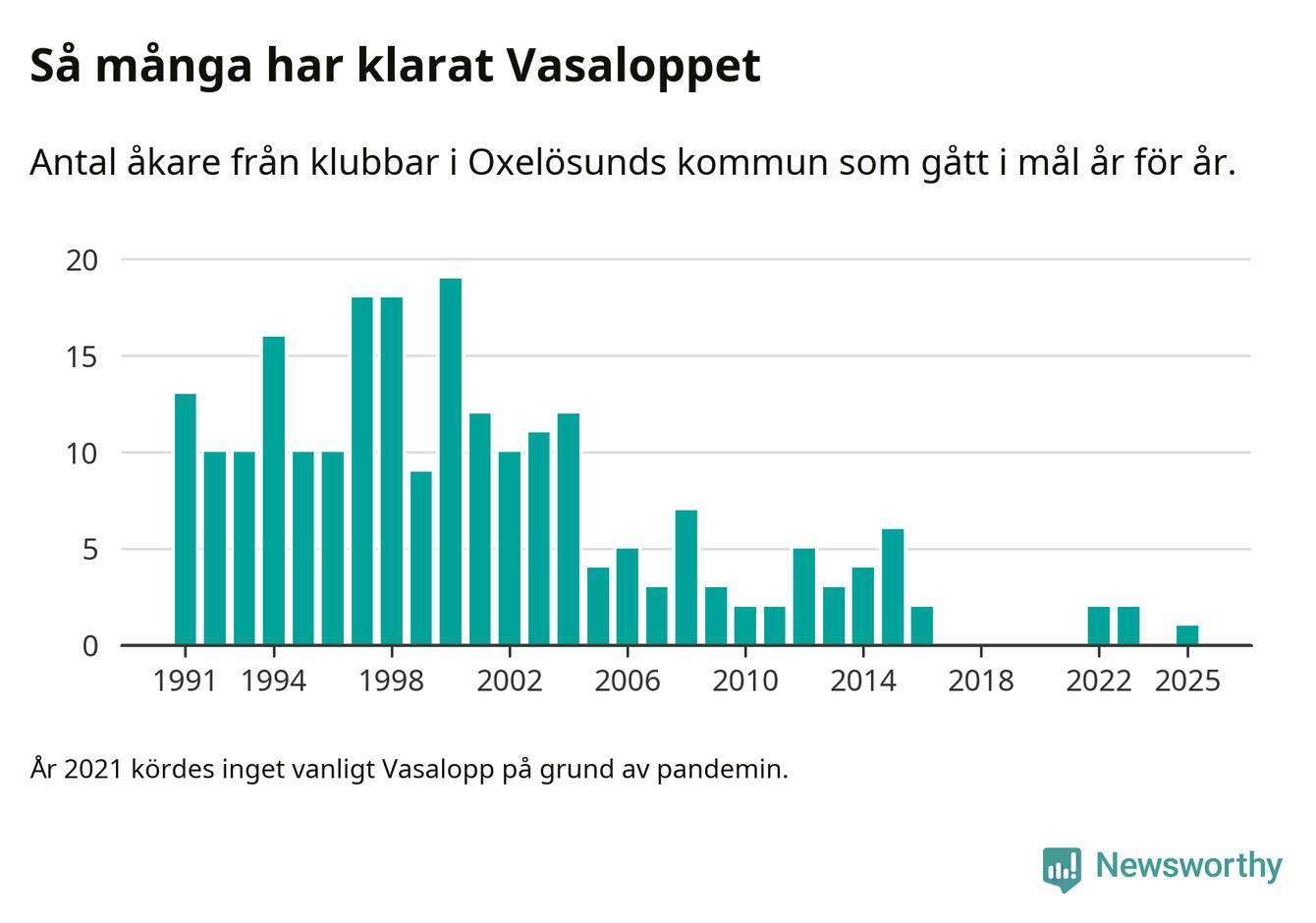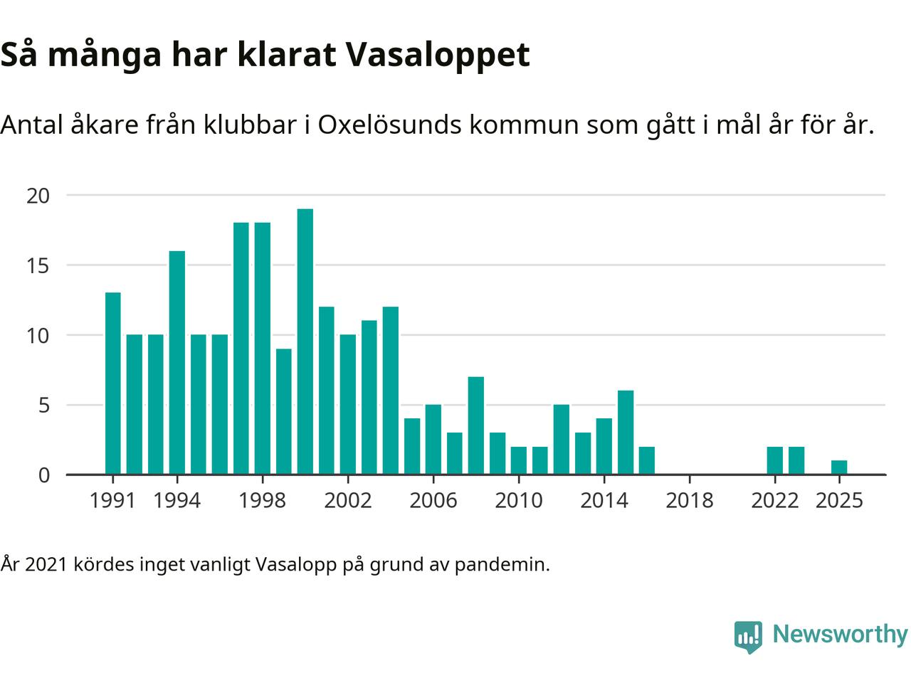 På söndag går starten för det 102:a Vasaloppet. Newsworthy har samlat in och sammanställt samtliga Vasaloppsresultat sedan 1991. Det ger en unik bild av hur skidåkare från klubbar i Oxelösunds kommun har klarat sig genom åren.