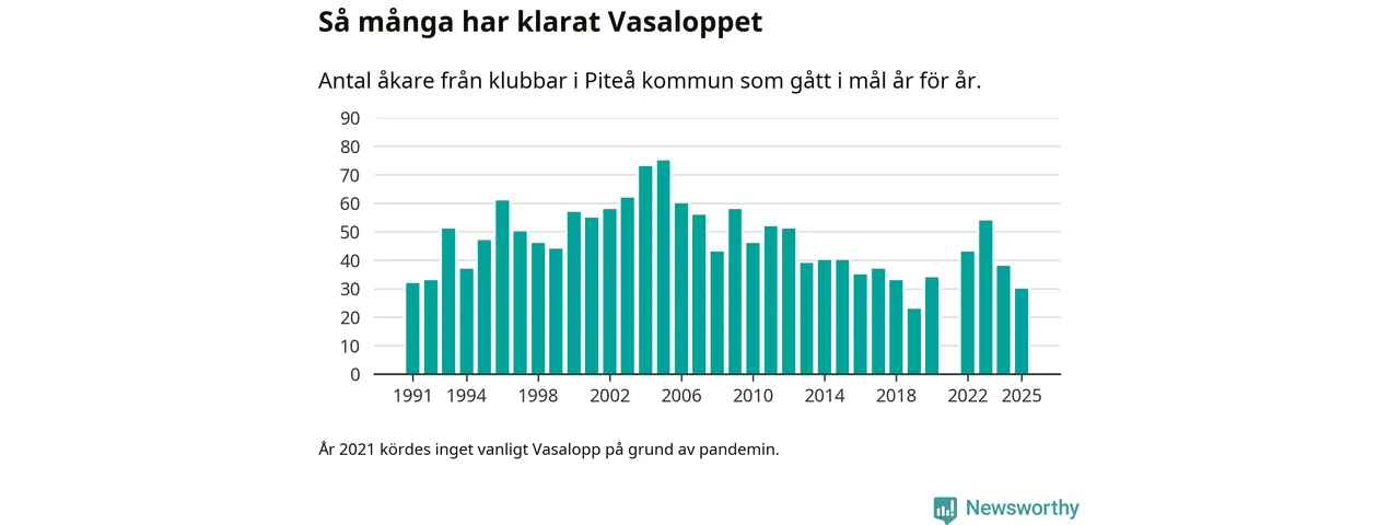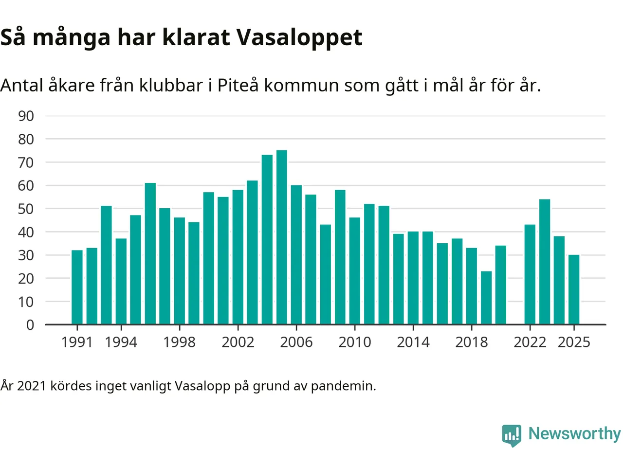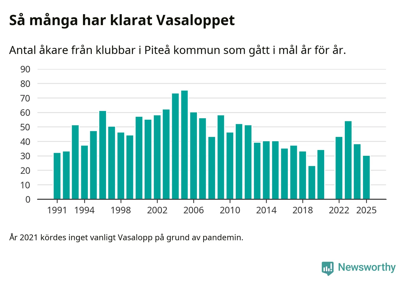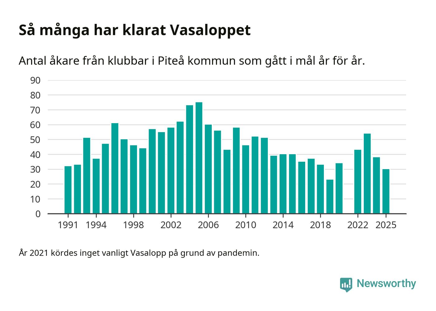 På söndag går starten för det 102:a Vasaloppet. Newsworthy har samlat in och sammanställt samtliga Vasaloppsresultat sedan 1991. Det ger en unik bild av hur skidåkare från klubbar i Piteå kommun har klarat sig genom åren.
