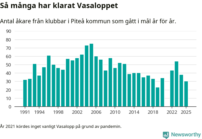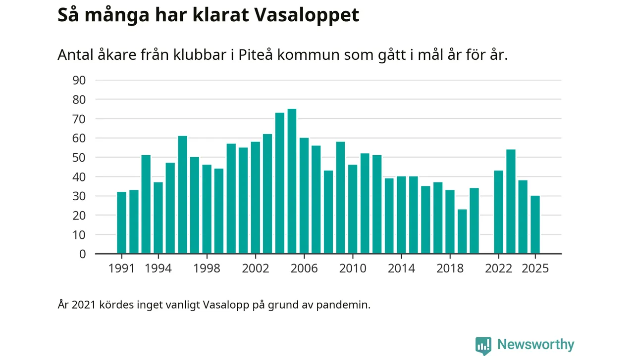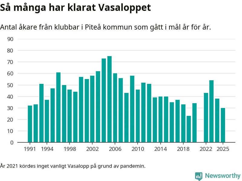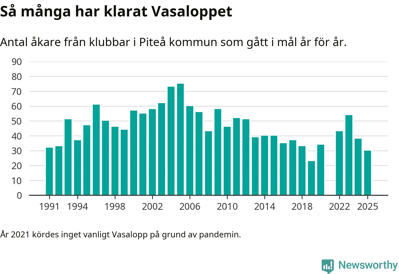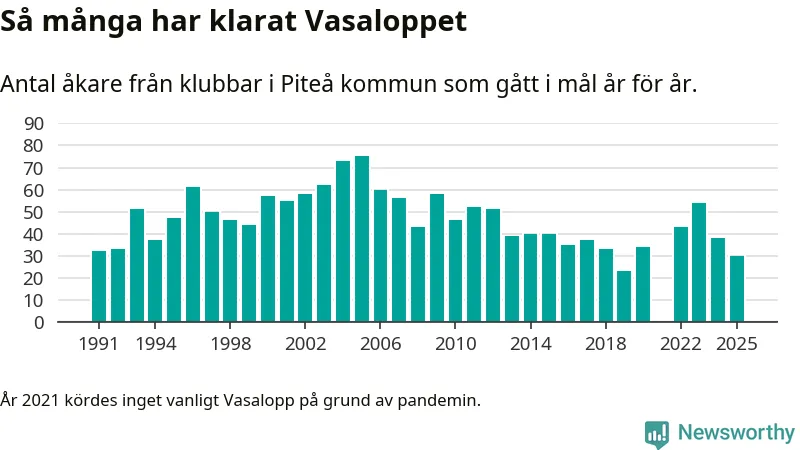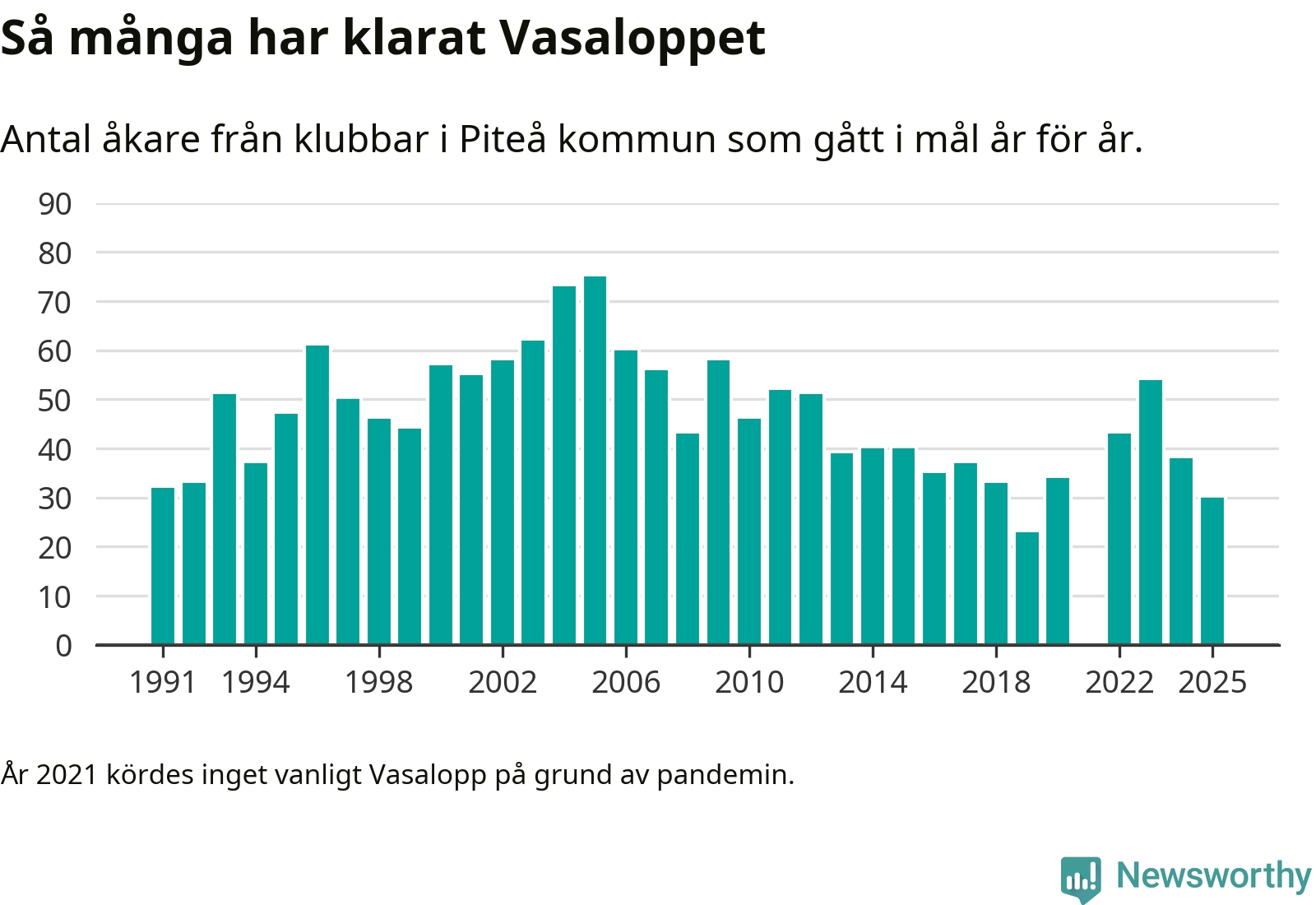 På söndag går starten för det 102:a Vasaloppet. Newsworthy har samlat in och sammanställt samtliga Vasaloppsresultat sedan 1991. Det ger en unik bild av hur skidåkare från klubbar i Piteå kommun har klarat sig genom åren.