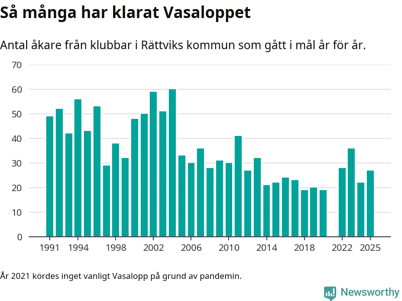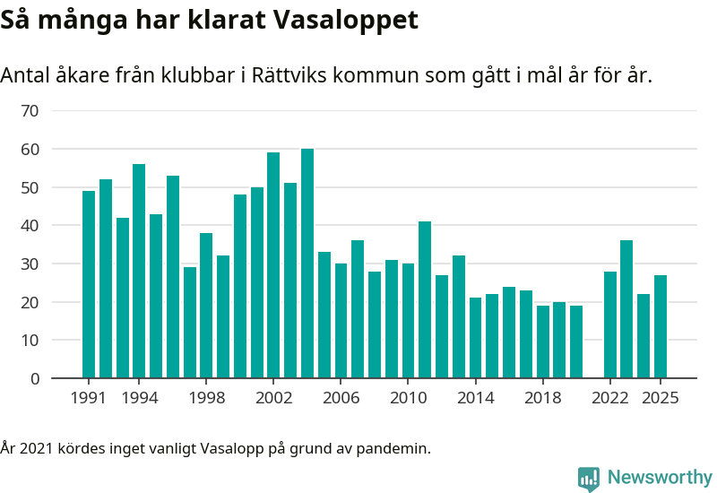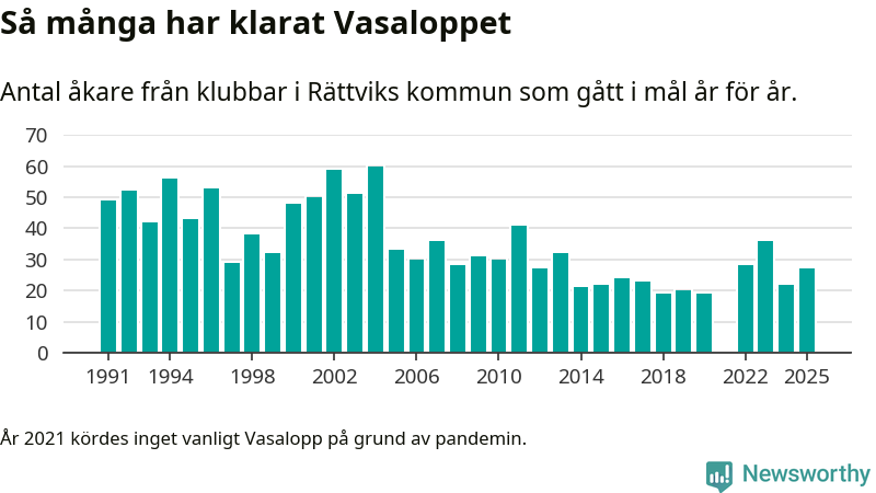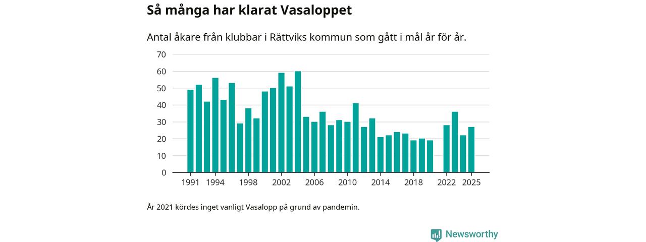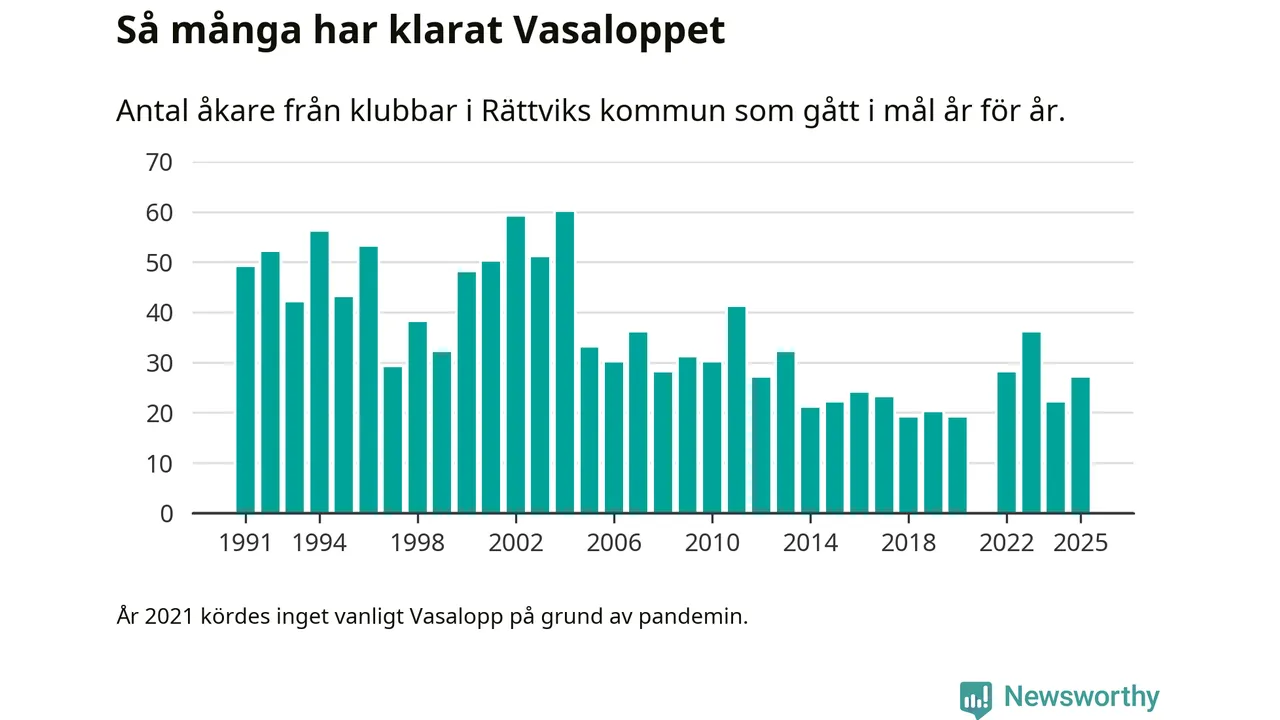 På söndag går starten för det 102:a Vasaloppet. Newsworthy har samlat in och sammanställt samtliga Vasaloppsresultat sedan 1991. Det ger en unik bild av hur skidåkare från klubbar i Rättviks kommun har klarat sig genom åren.