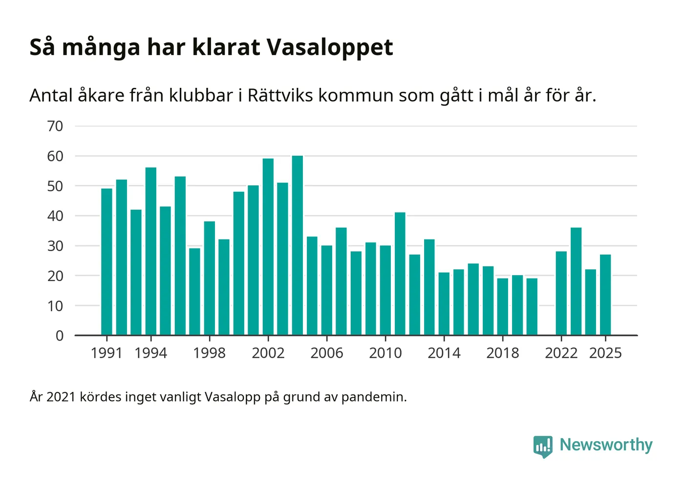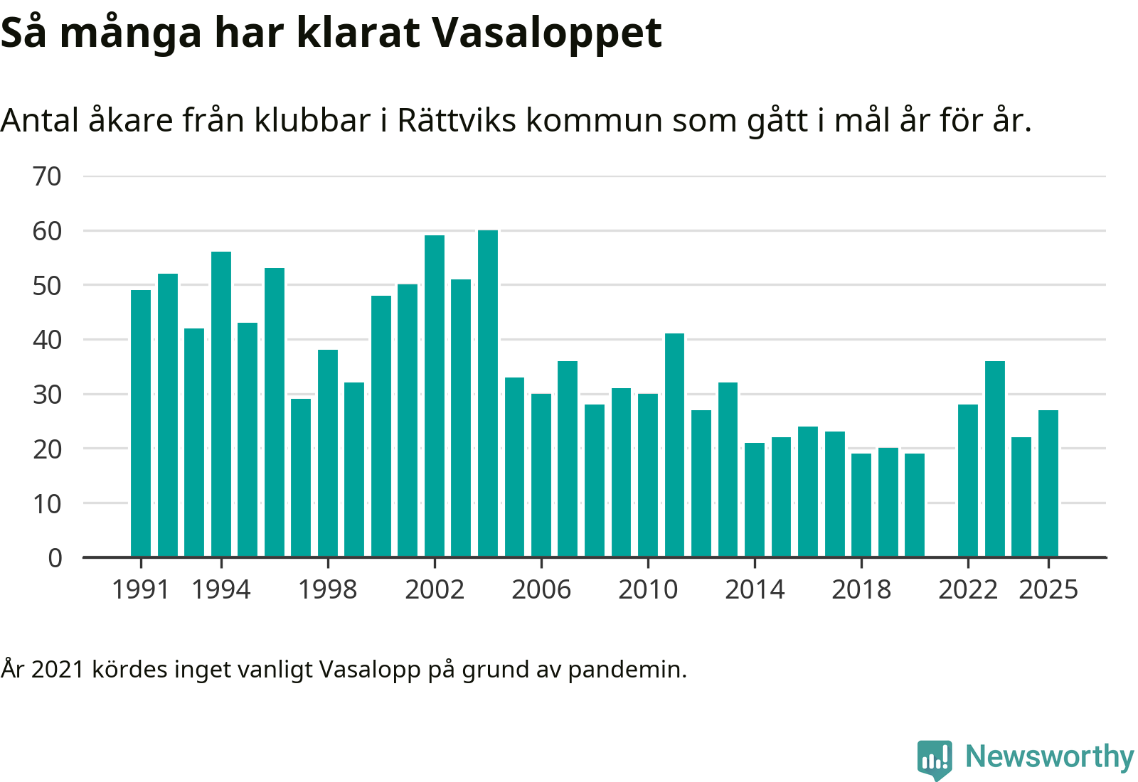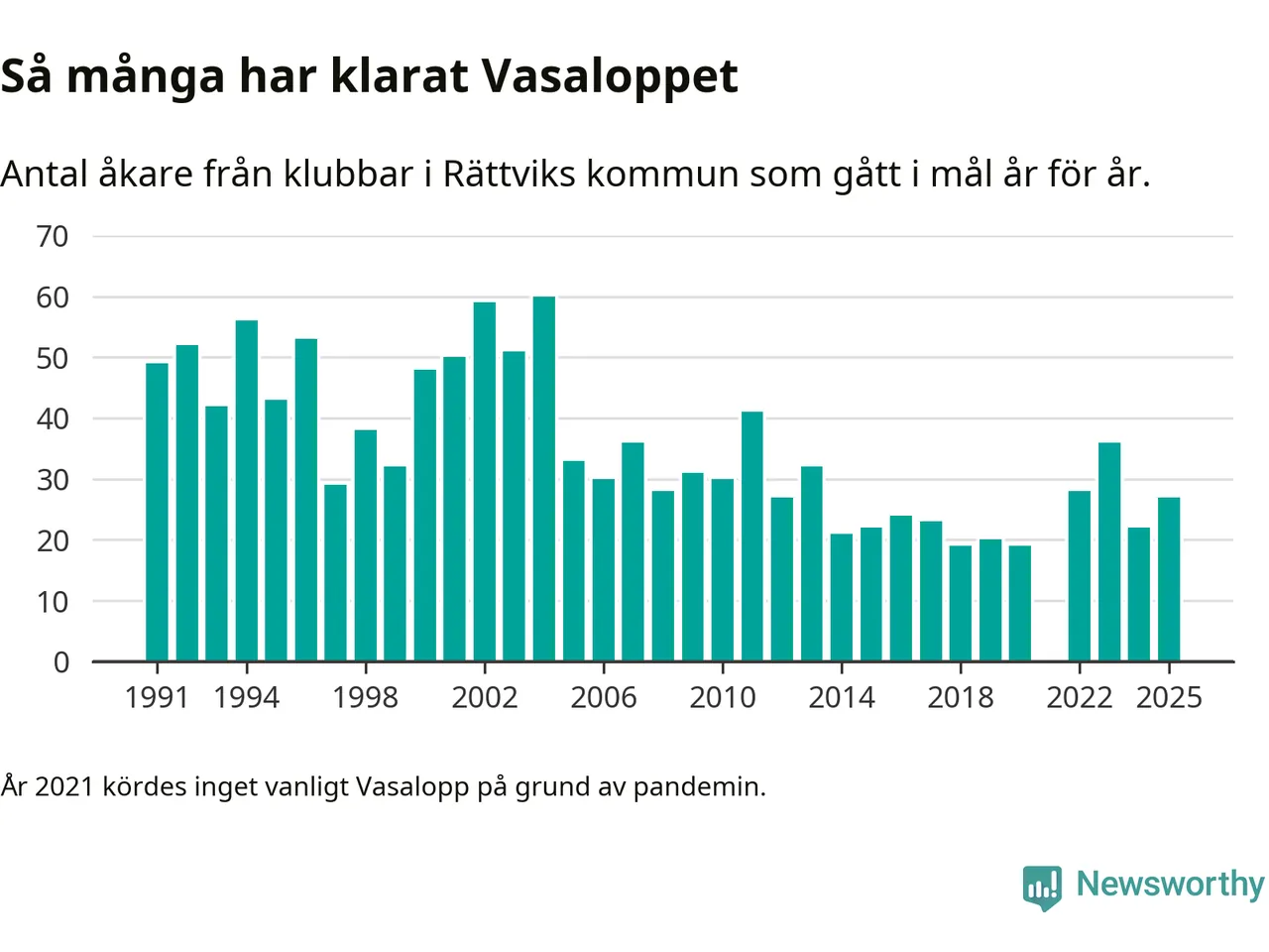 På söndag går starten för det 102:a Vasaloppet. Newsworthy har samlat in och sammanställt samtliga Vasaloppsresultat sedan 1991. Det ger en unik bild av hur skidåkare från klubbar i Rättviks kommun har klarat sig genom åren.