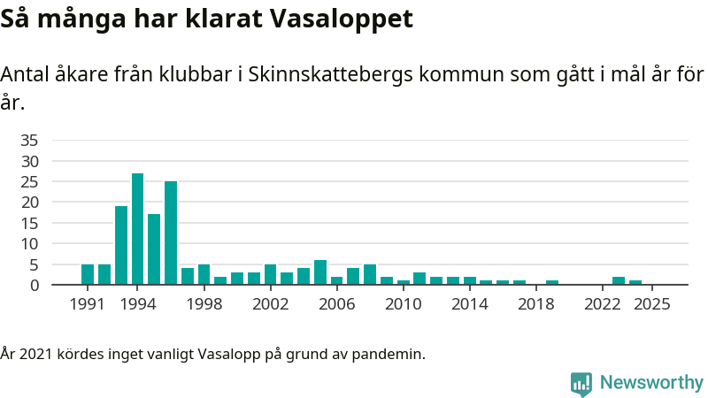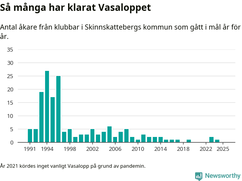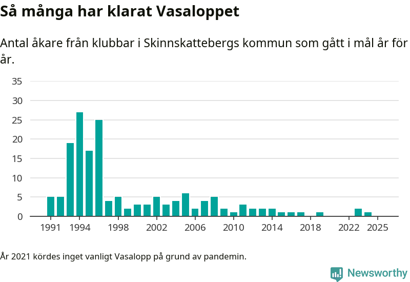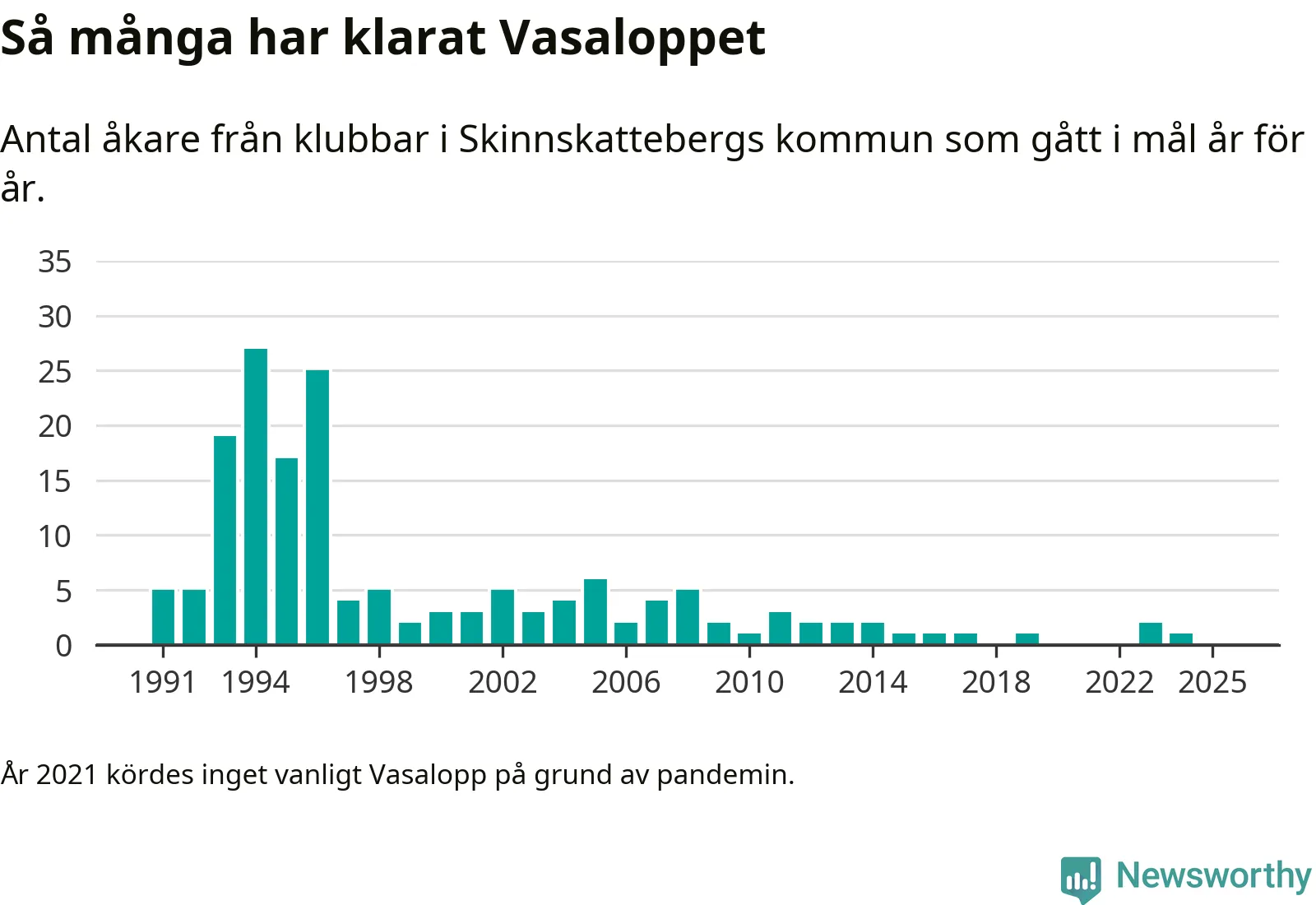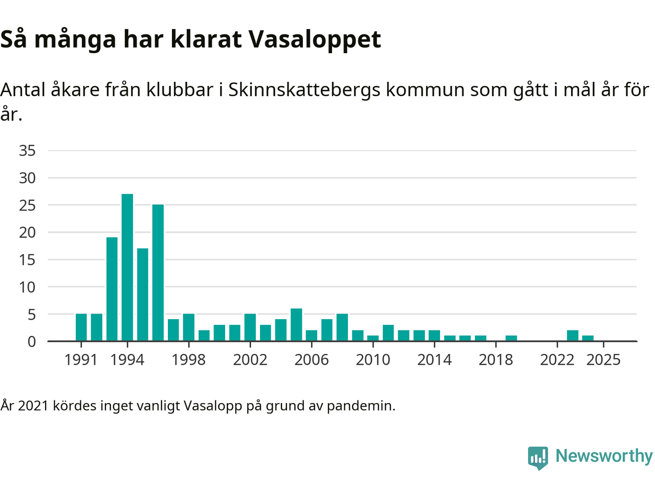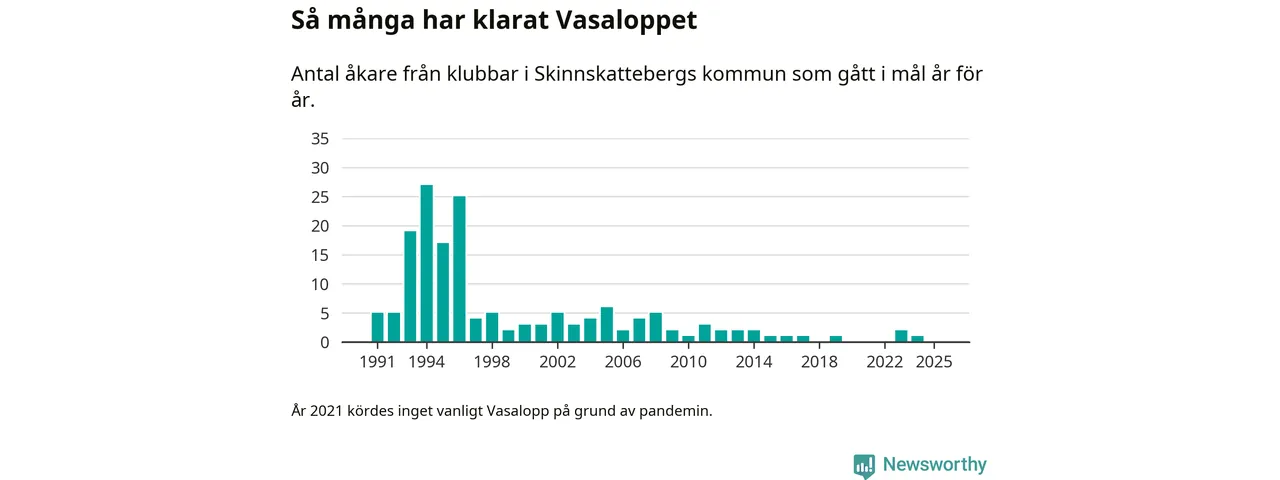 På söndag går starten för det 102:a Vasaloppet. Newsworthy har samlat in och sammanställt samtliga Vasaloppsresultat sedan 1991. Det ger en unik bild av hur skidåkare från klubbar i Skinnskattebergs kommun har klarat sig genom åren.