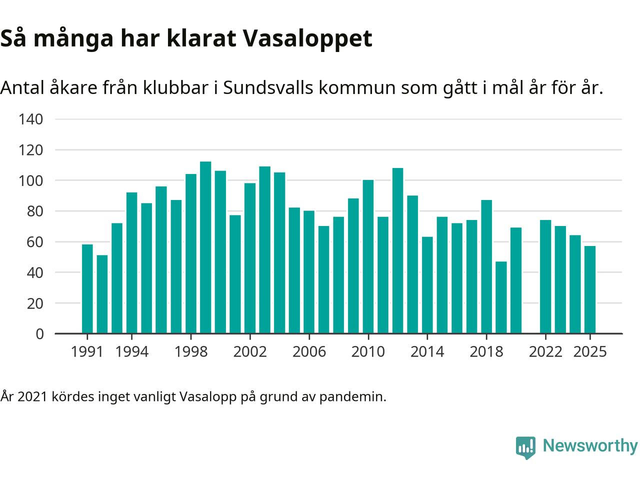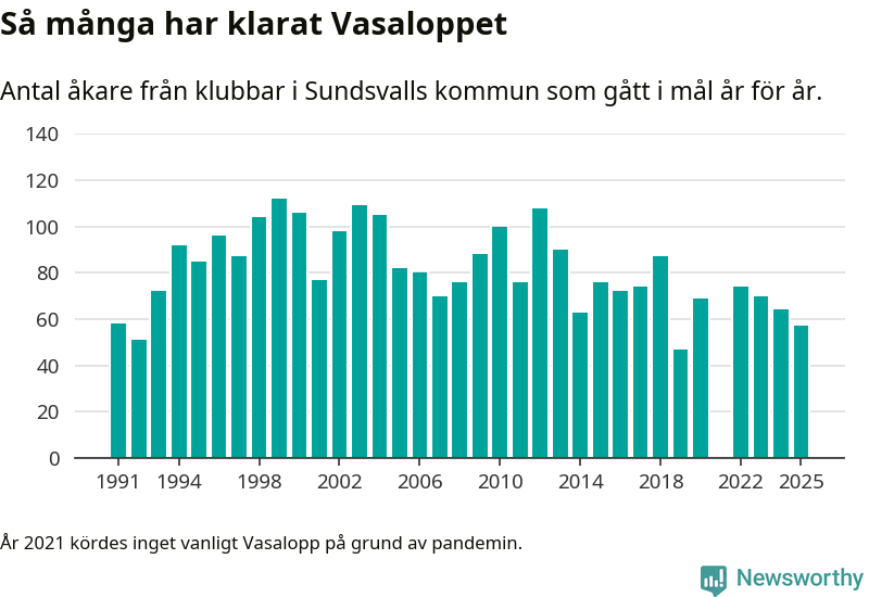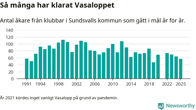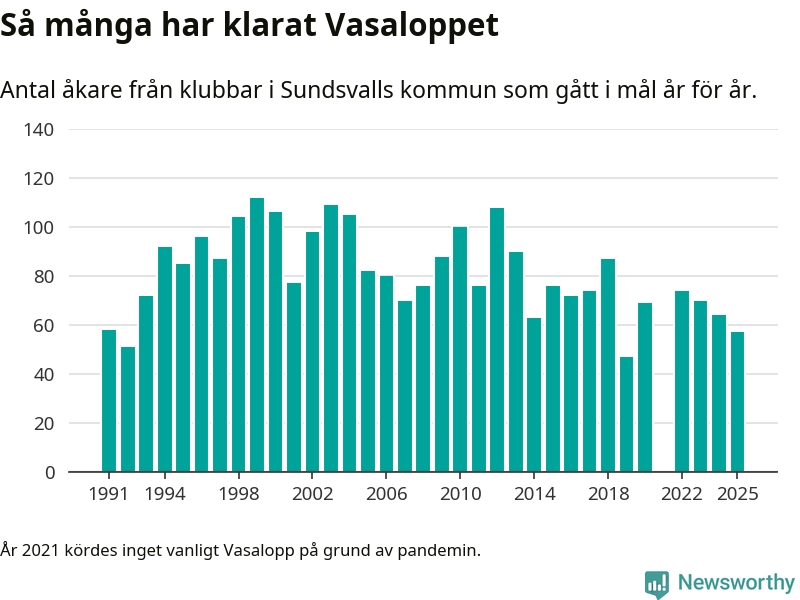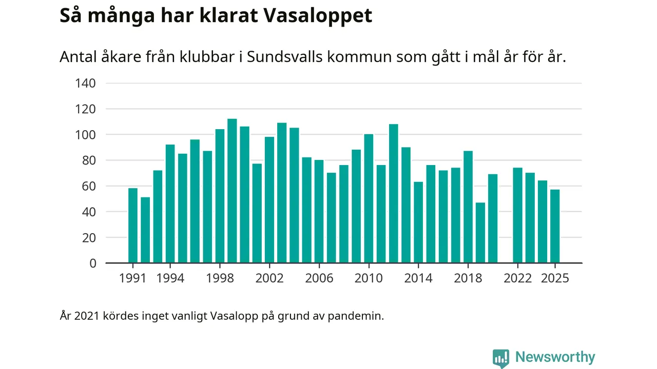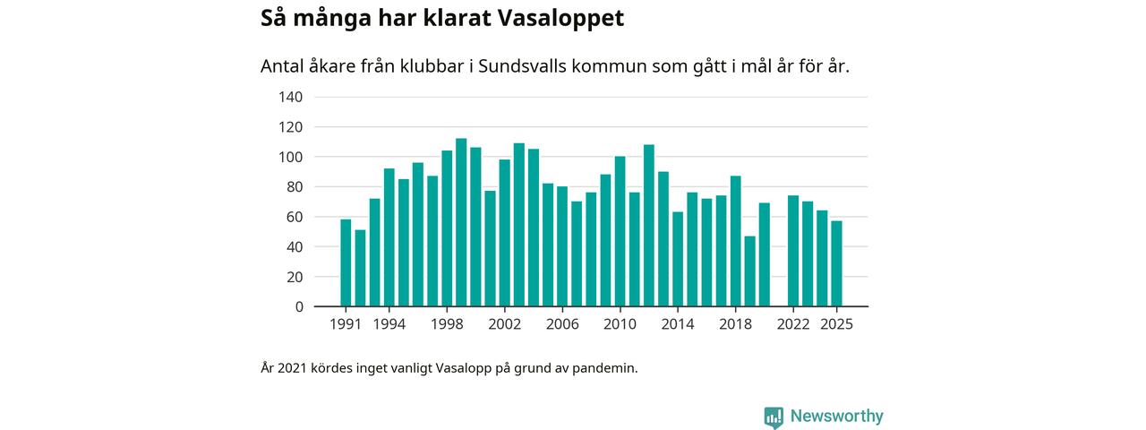 På söndag går starten för det 102:a Vasaloppet. Newsworthy har samlat in och sammanställt samtliga Vasaloppsresultat sedan 1991. Det ger en unik bild av hur skidåkare från klubbar i Sundsvalls kommun har klarat sig genom åren.
