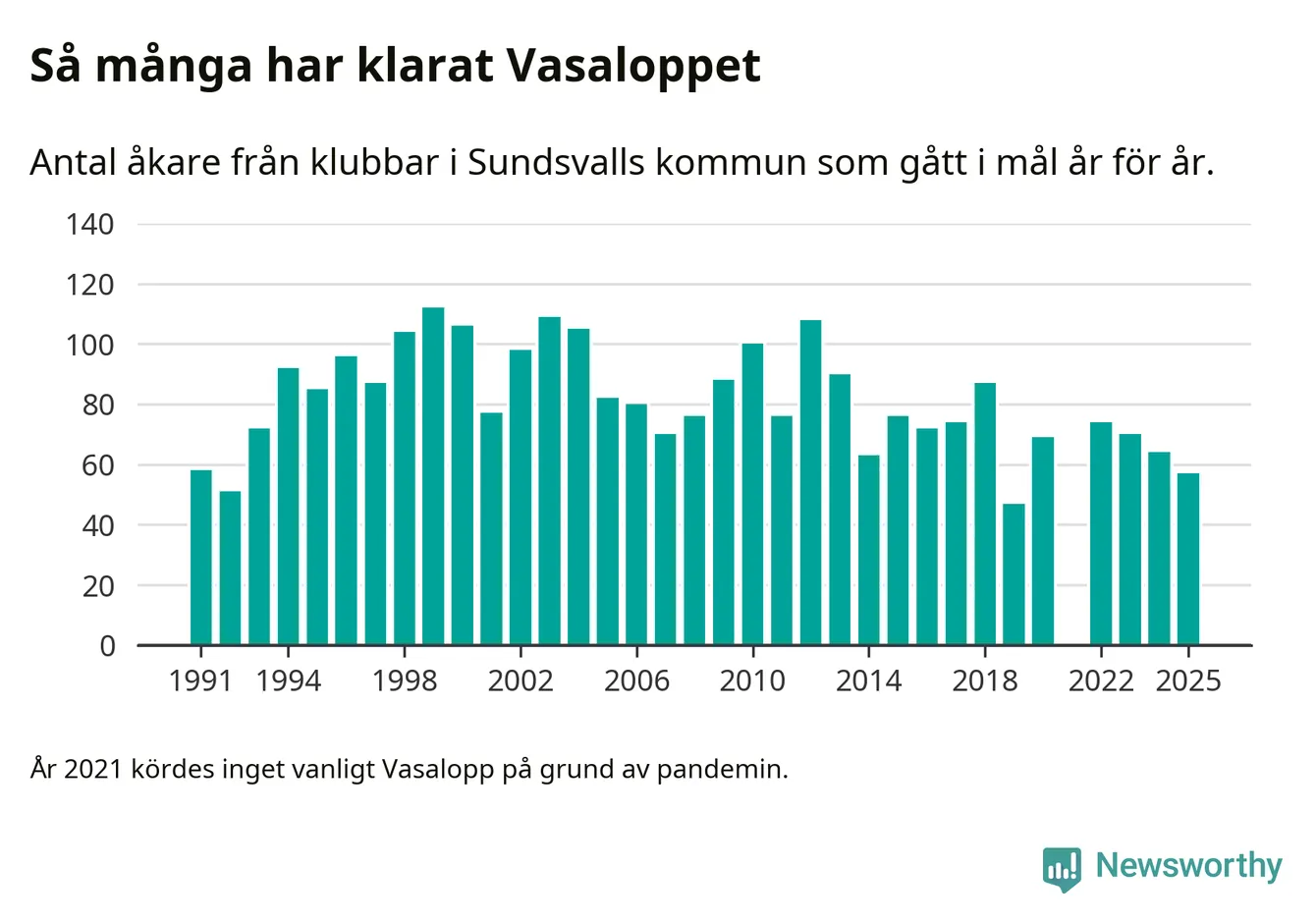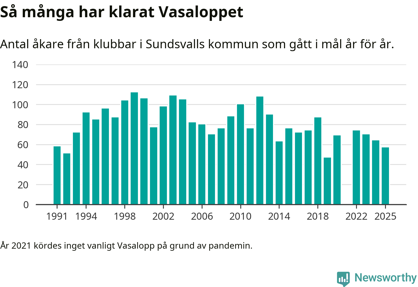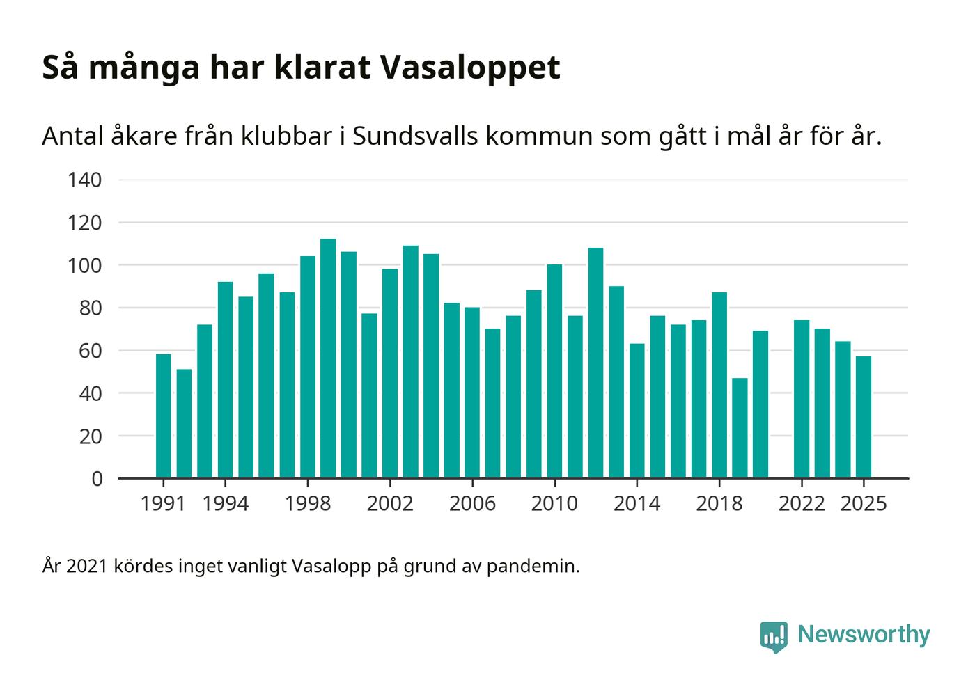 På söndag går starten för det 102:a Vasaloppet. Newsworthy har samlat in och sammanställt samtliga Vasaloppsresultat sedan 1991. Det ger en unik bild av hur skidåkare från klubbar i Sundsvalls kommun har klarat sig genom åren.
