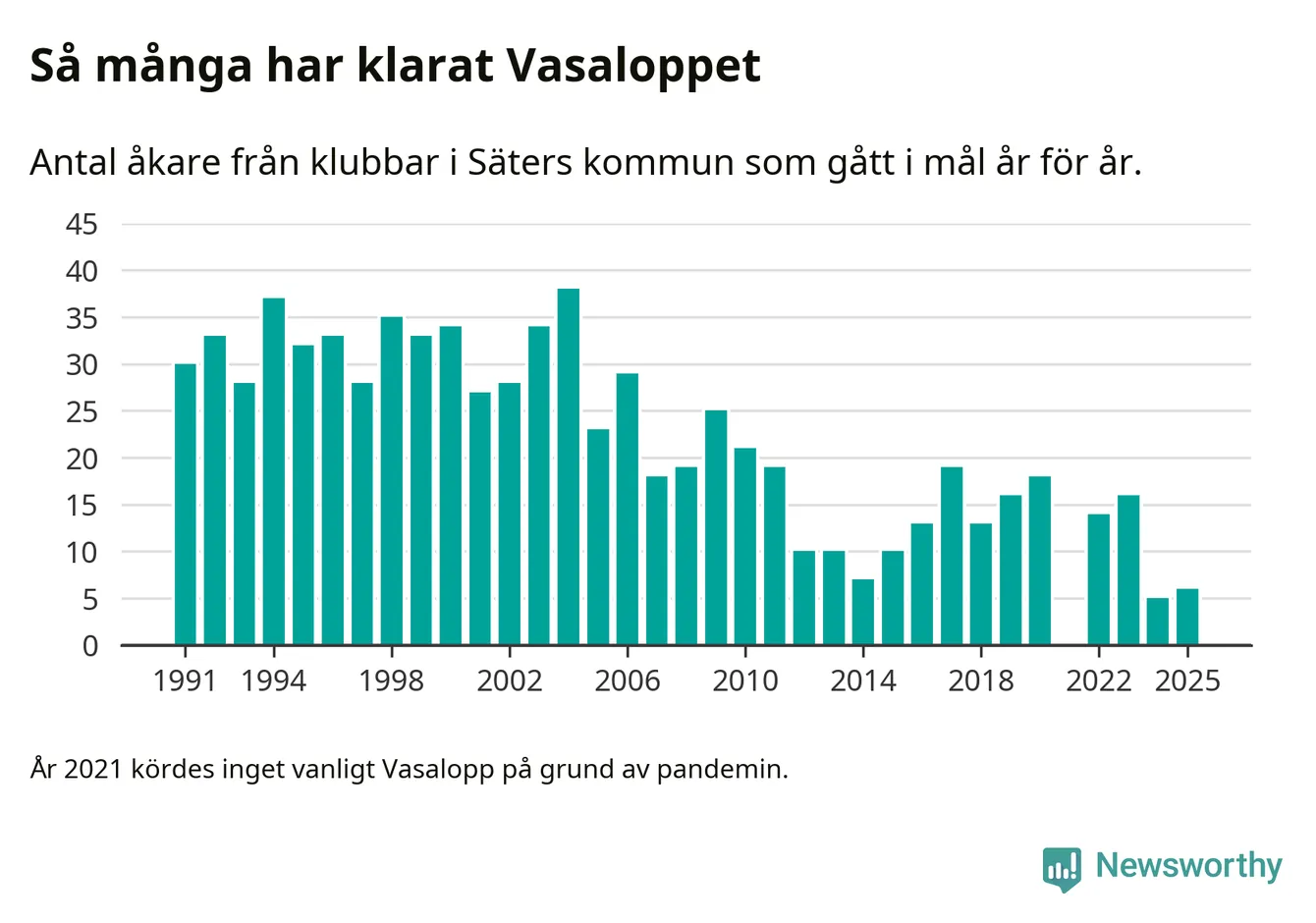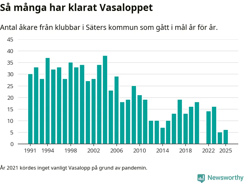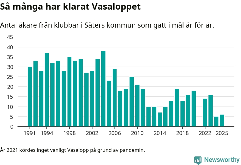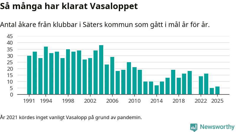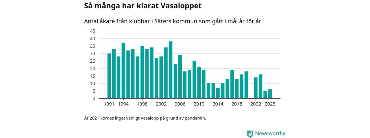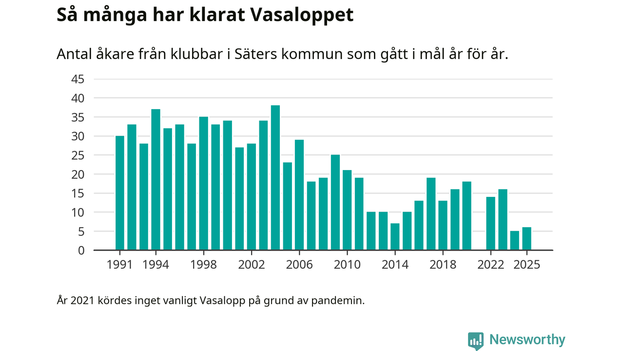 På söndag går starten för det 102:a Vasaloppet. Newsworthy har samlat in och sammanställt samtliga Vasaloppsresultat sedan 1991. Det ger en unik bild av hur skidåkare från klubbar i Säters kommun har klarat sig genom åren.