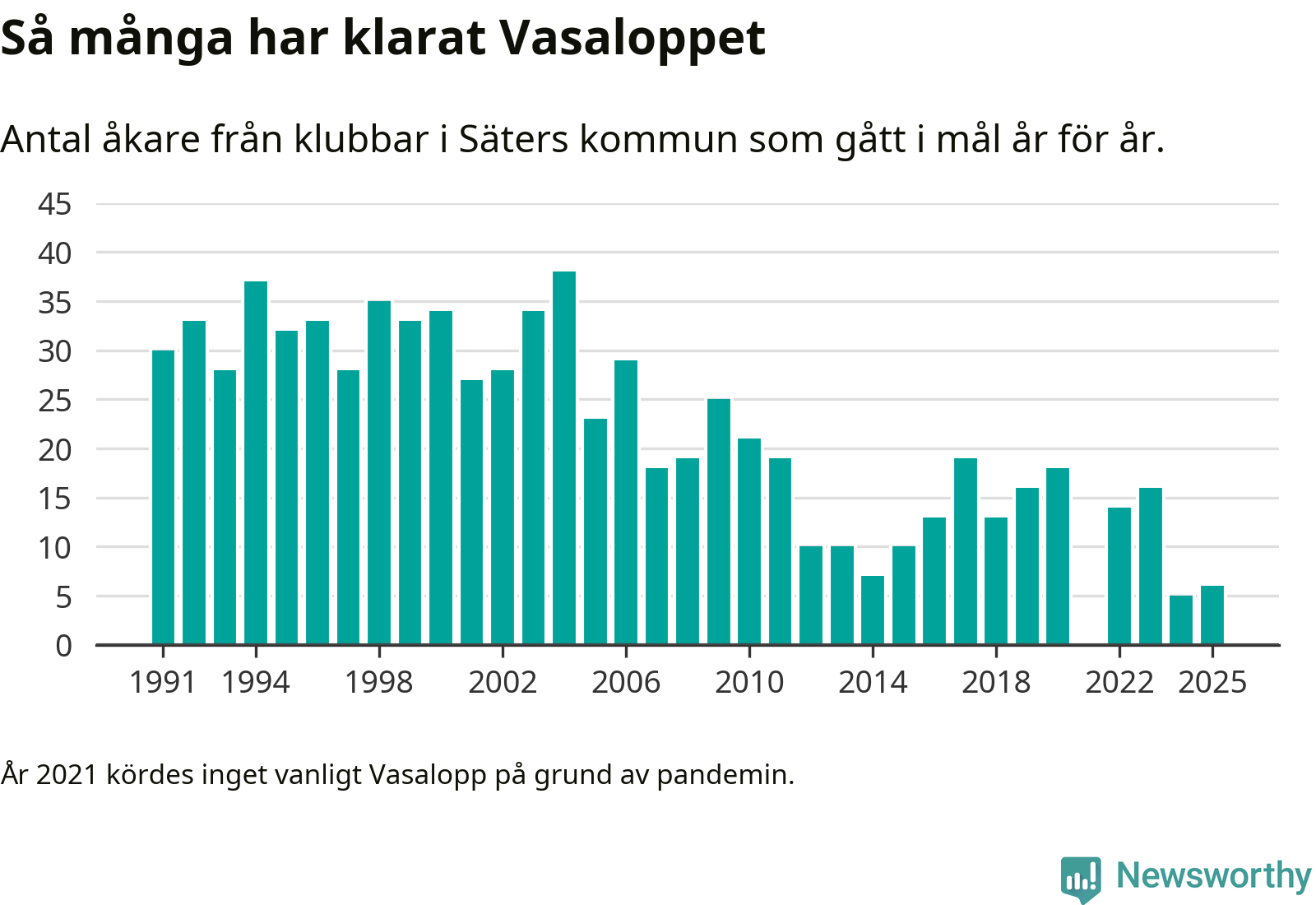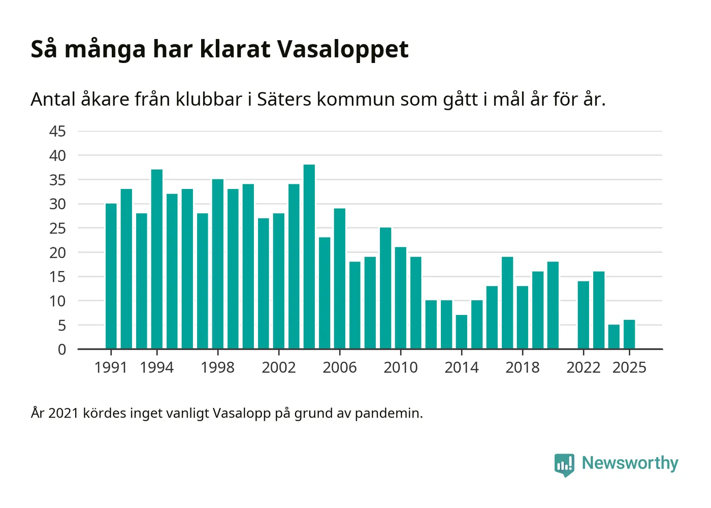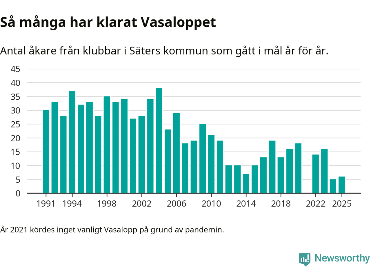 På söndag går starten för det 102:a Vasaloppet. Newsworthy har samlat in och sammanställt samtliga Vasaloppsresultat sedan 1991. Det ger en unik bild av hur skidåkare från klubbar i Säters kommun har klarat sig genom åren.
