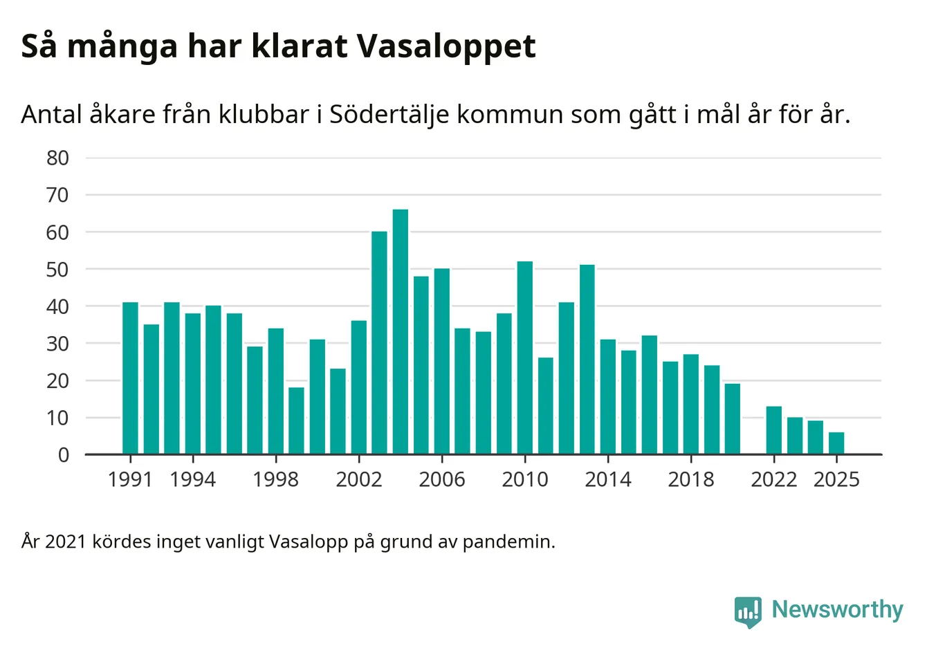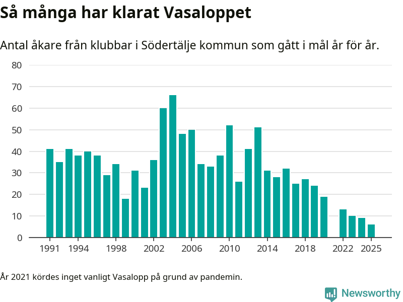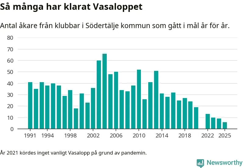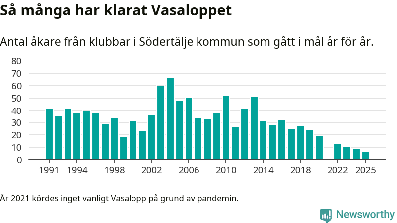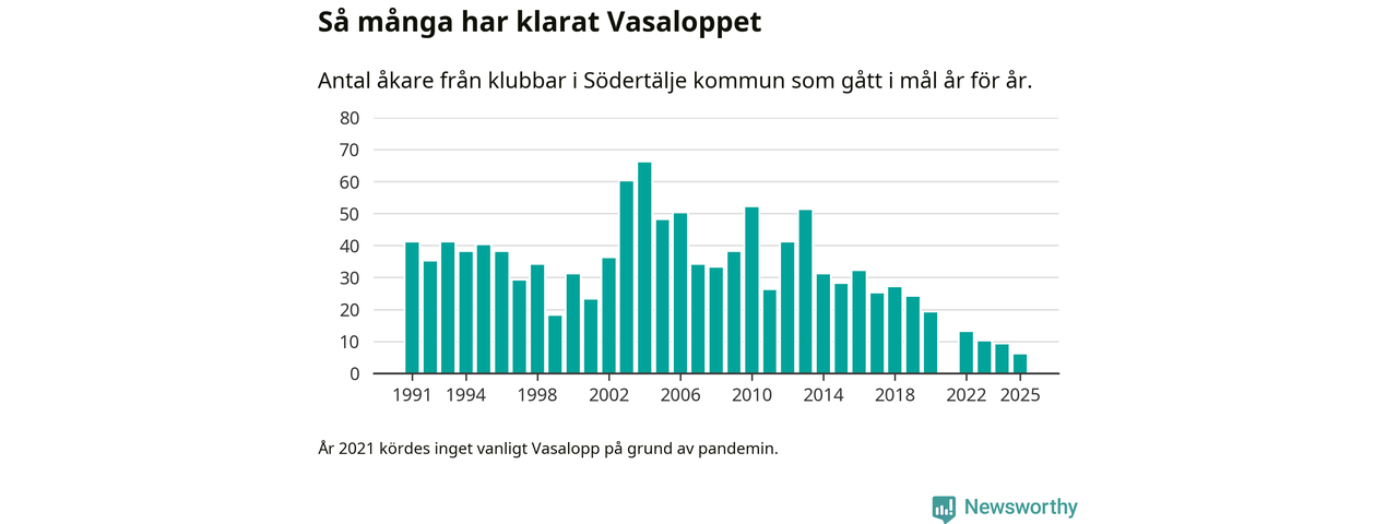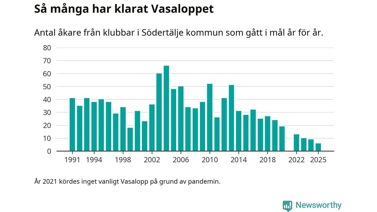 På söndag går starten för det 102:a Vasaloppet. Newsworthy har samlat in och sammanställt samtliga Vasaloppsresultat sedan 1991. Det ger en unik bild av hur skidåkare från klubbar i Södertälje kommun har klarat sig genom åren.