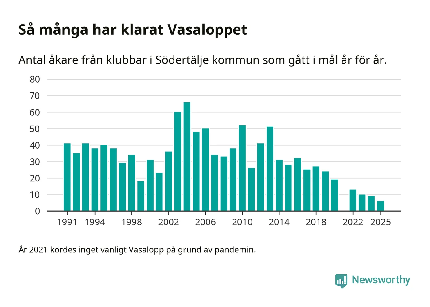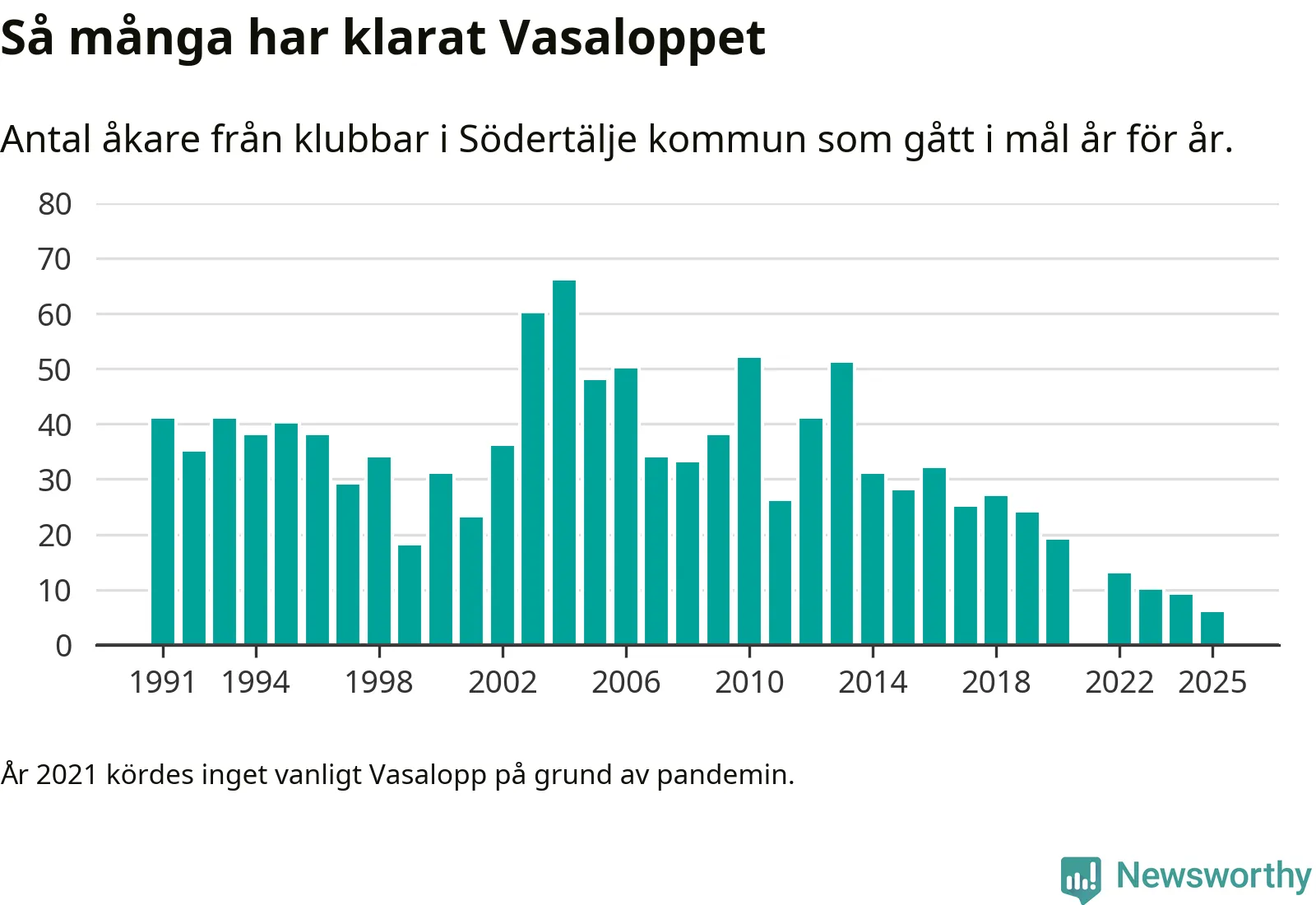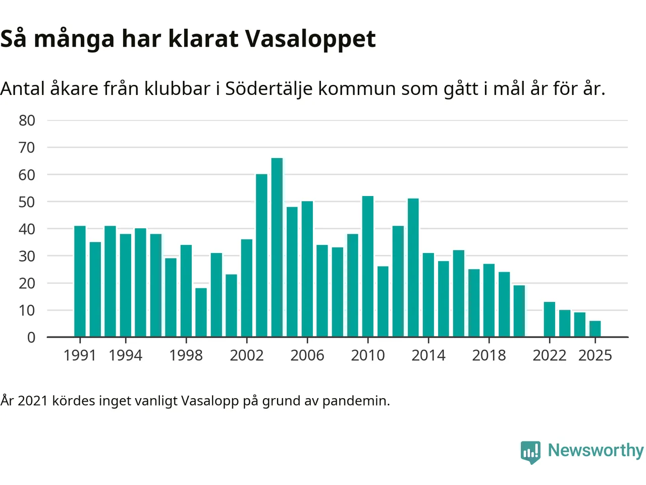 På söndag går starten för det 102:a Vasaloppet. Newsworthy har samlat in och sammanställt samtliga Vasaloppsresultat sedan 1991. Det ger en unik bild av hur skidåkare från klubbar i Södertälje kommun har klarat sig genom åren.