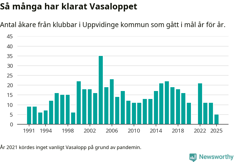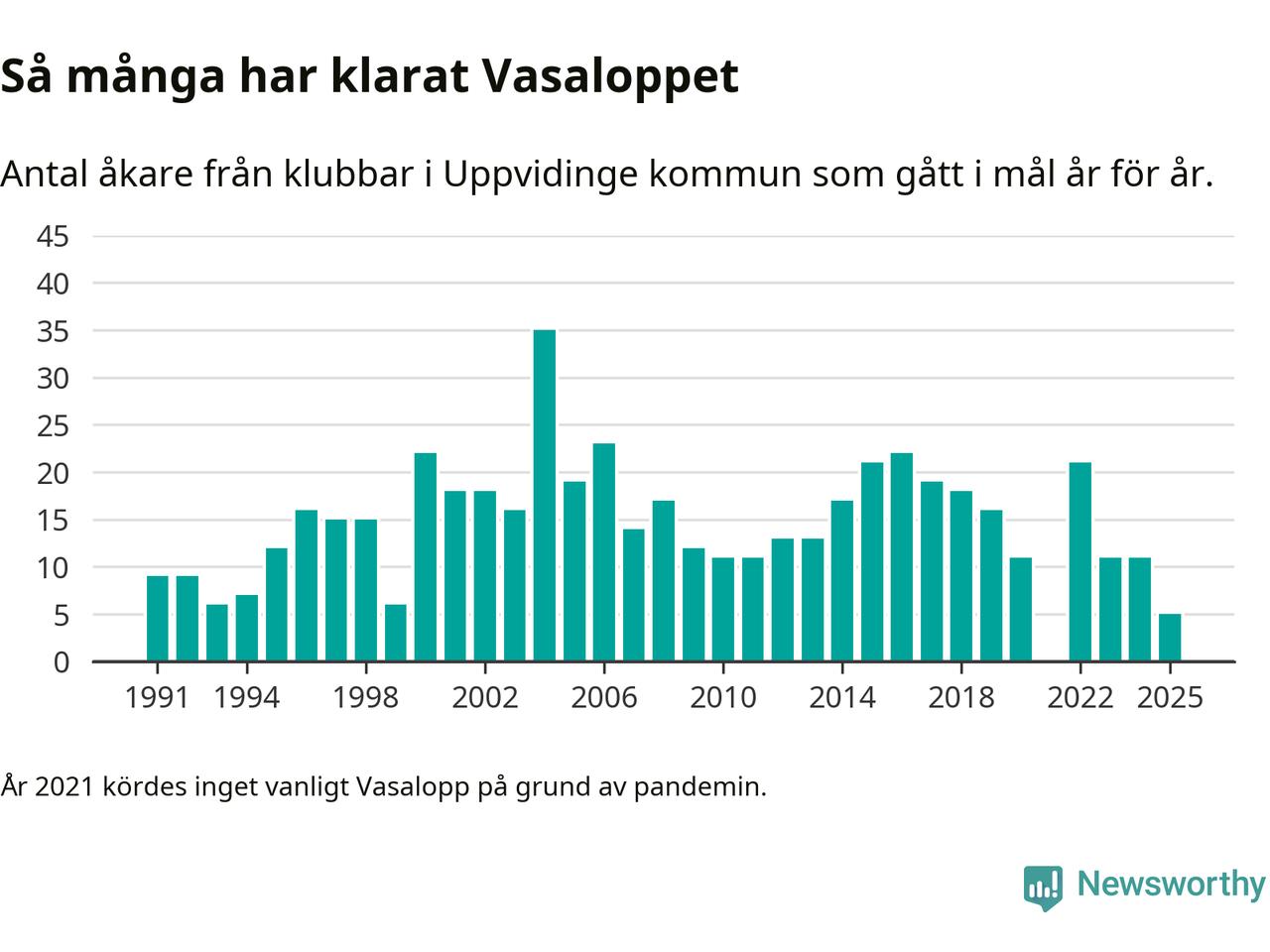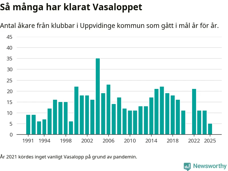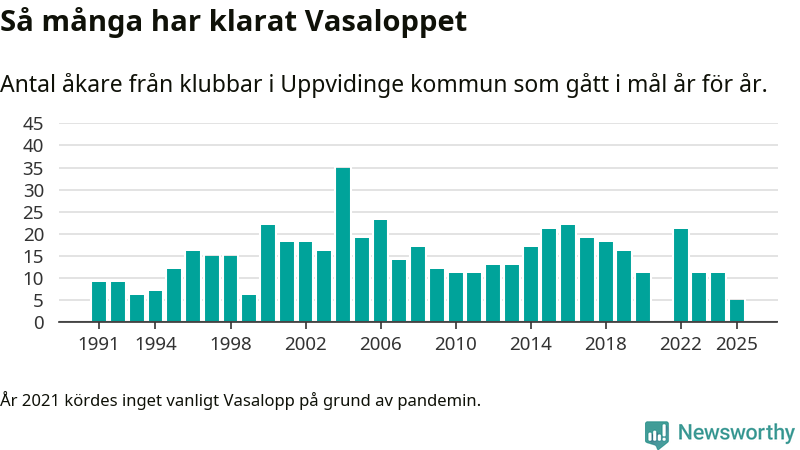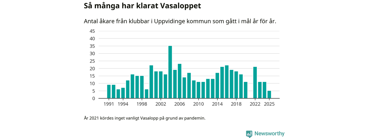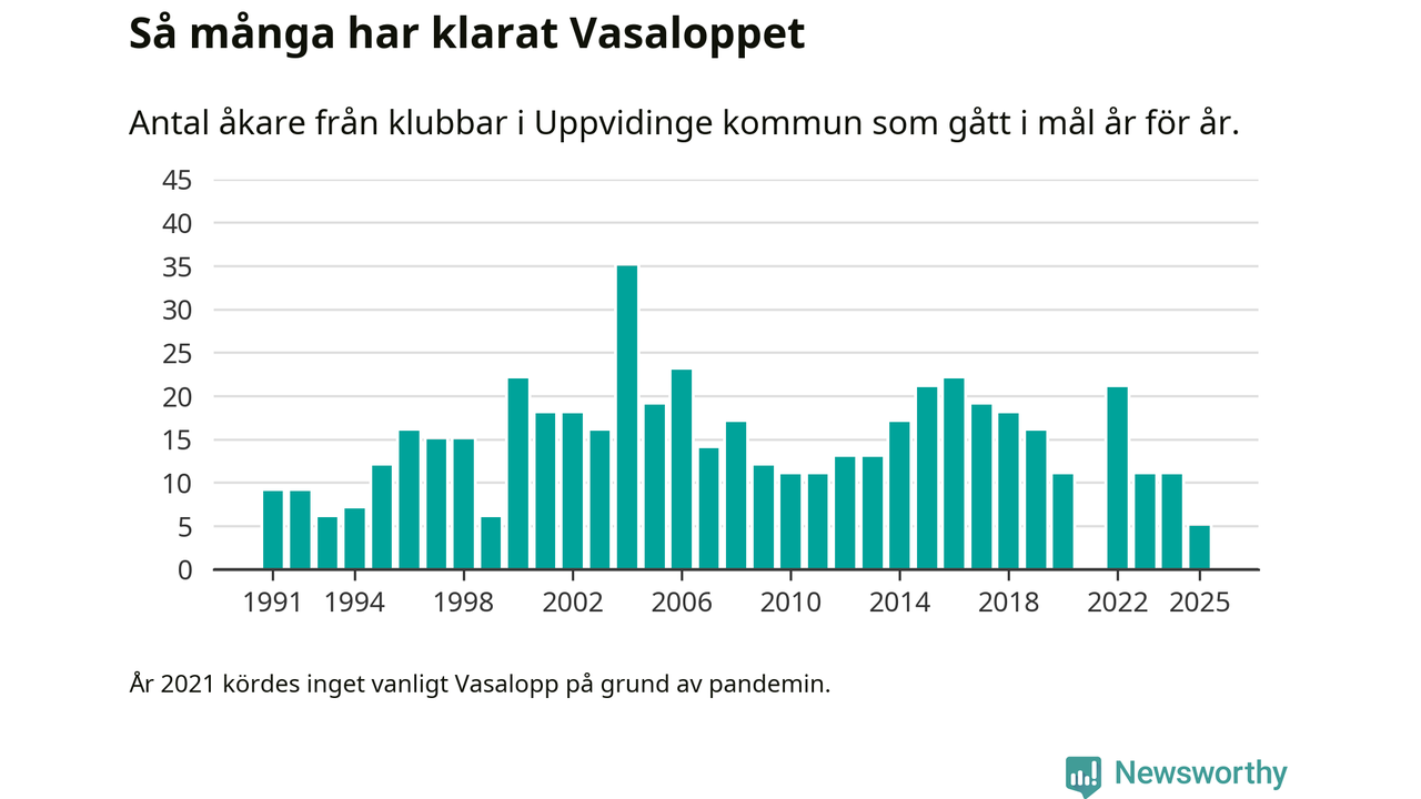 På söndag går starten för det 102:a Vasaloppet. Newsworthy har samlat in och sammanställt samtliga Vasaloppsresultat sedan 1991. Det ger en unik bild av hur skidåkare från klubbar i Uppvidinge kommun har klarat sig genom åren.