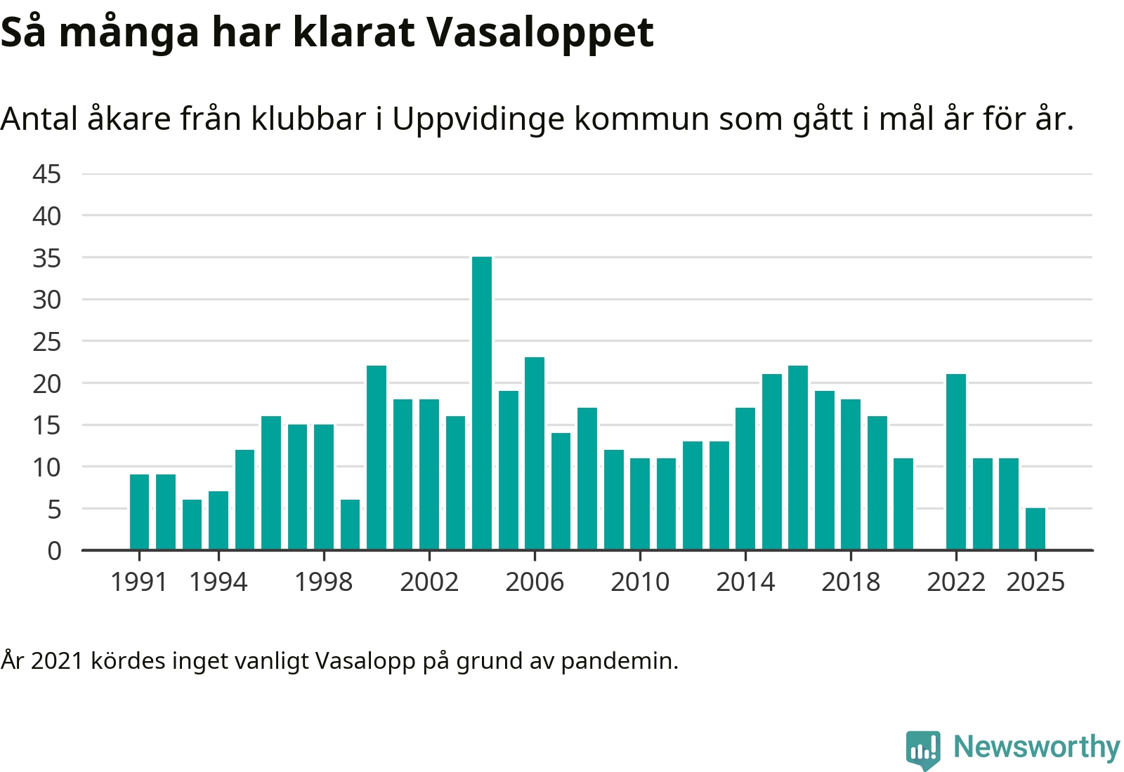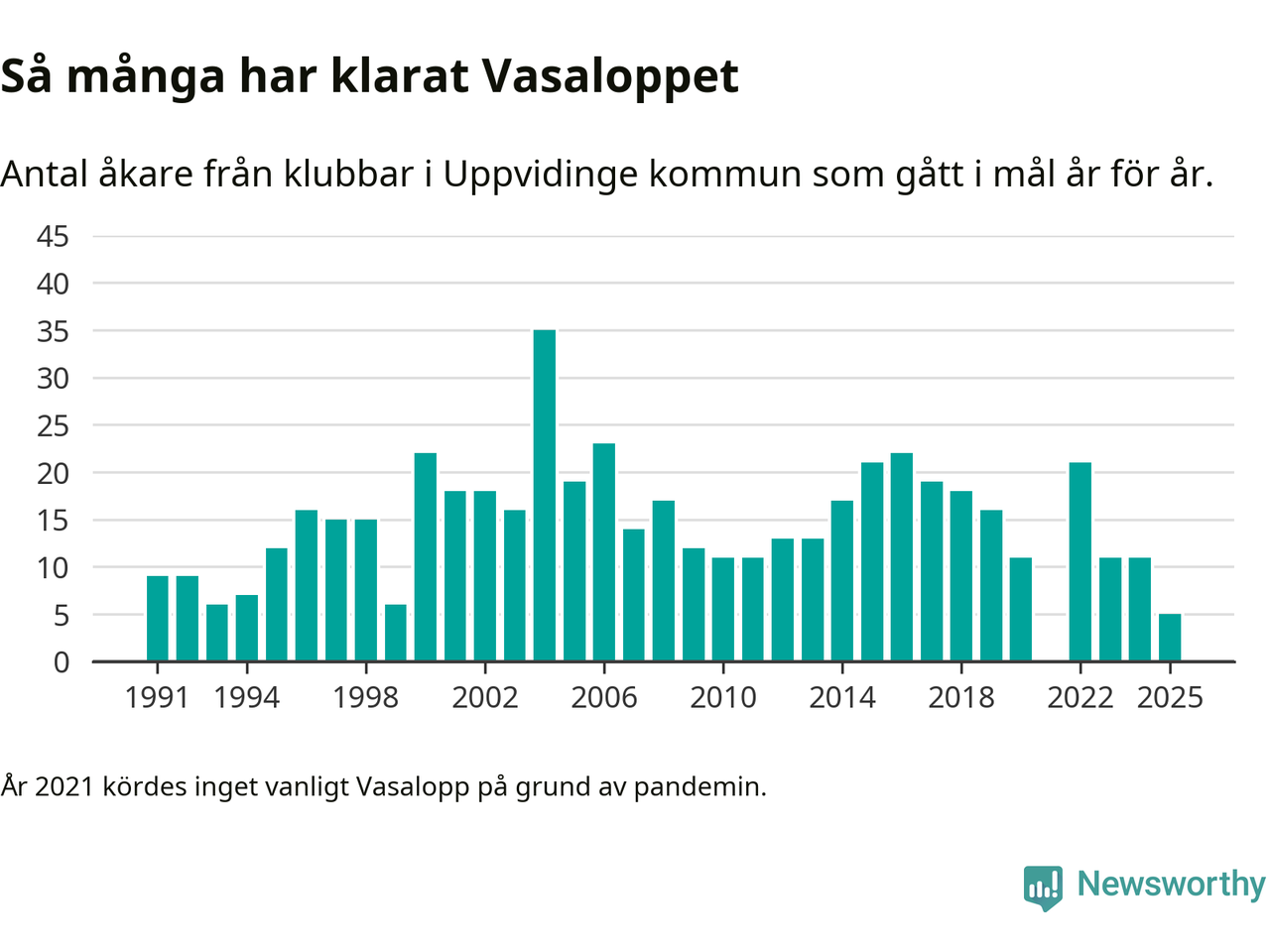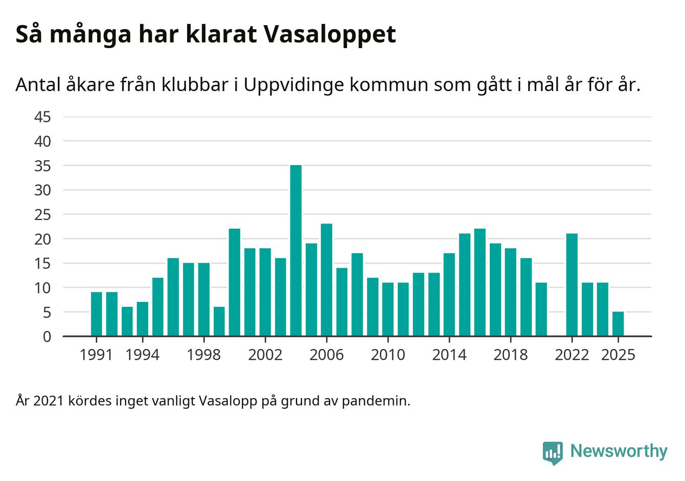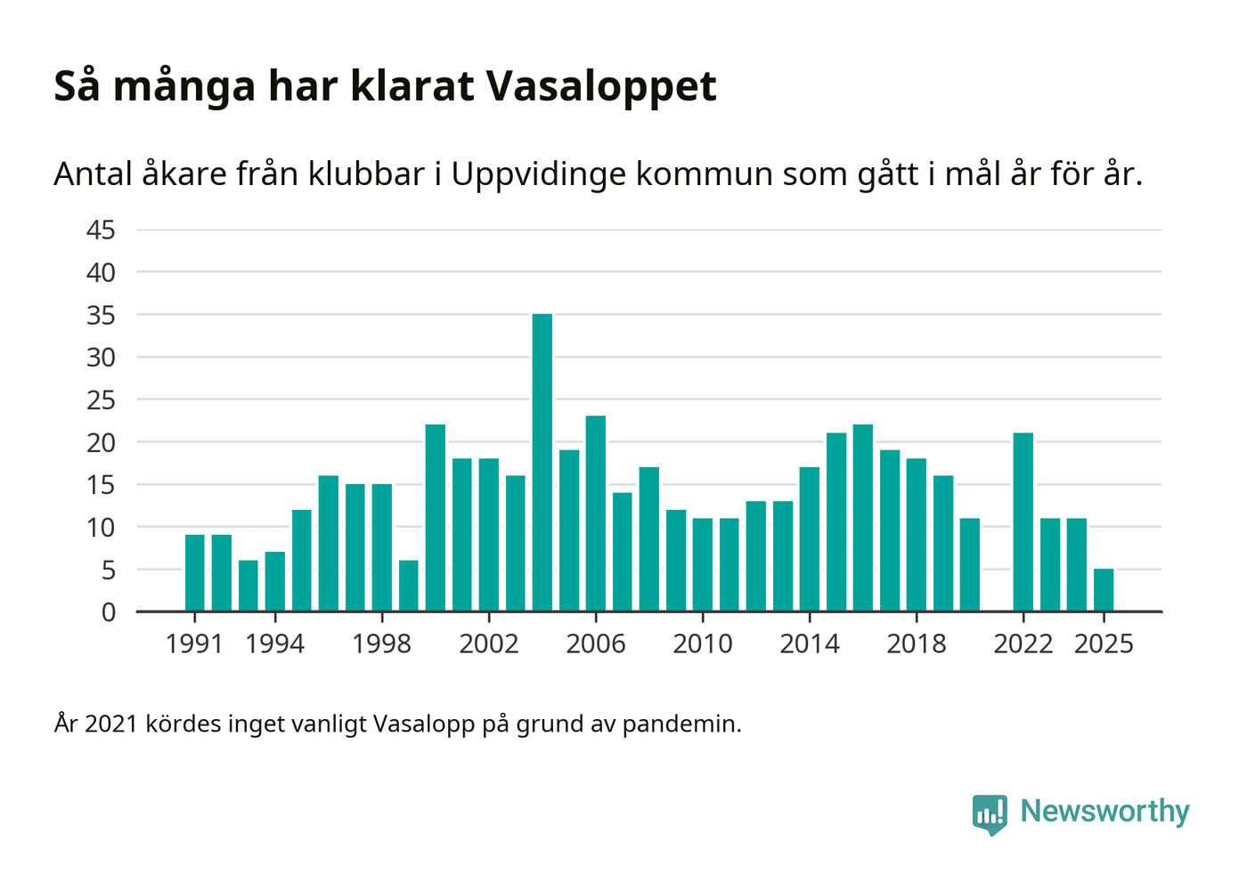På söndag går starten för det 102:a Vasaloppet. Newsworthy har samlat in och sammanställt samtliga Vasaloppsresultat sedan 1991. Det ger en unik bild av hur skidåkare från klubbar i Uppvidinge kommun har klarat sig genom åren.