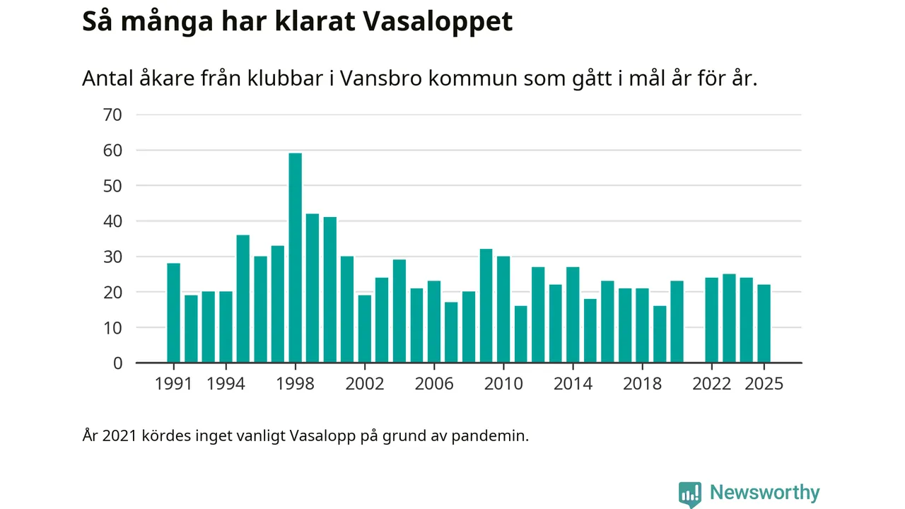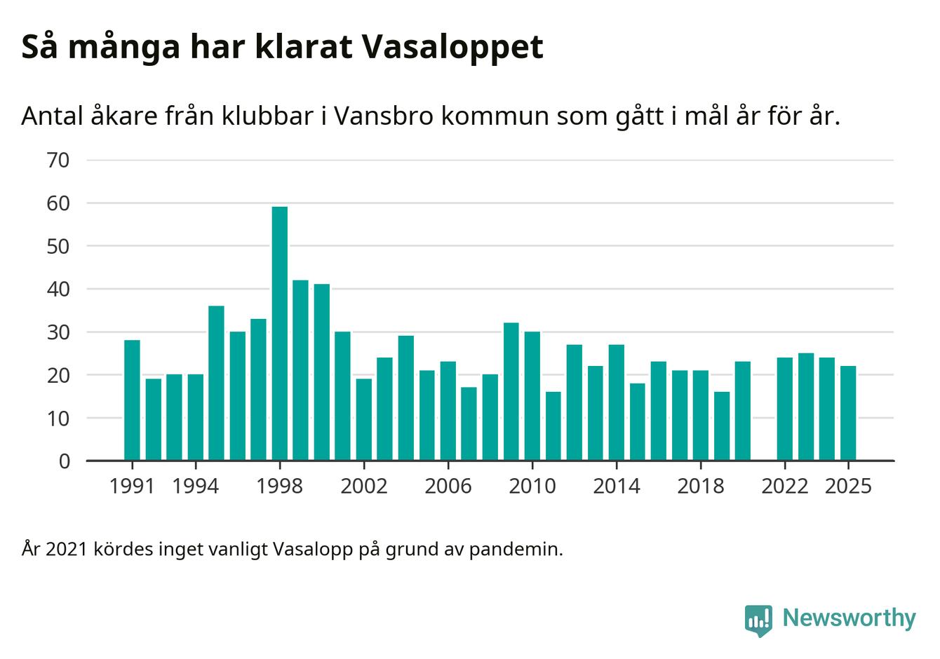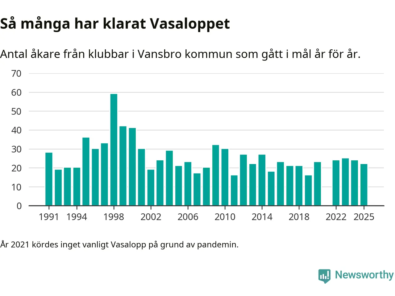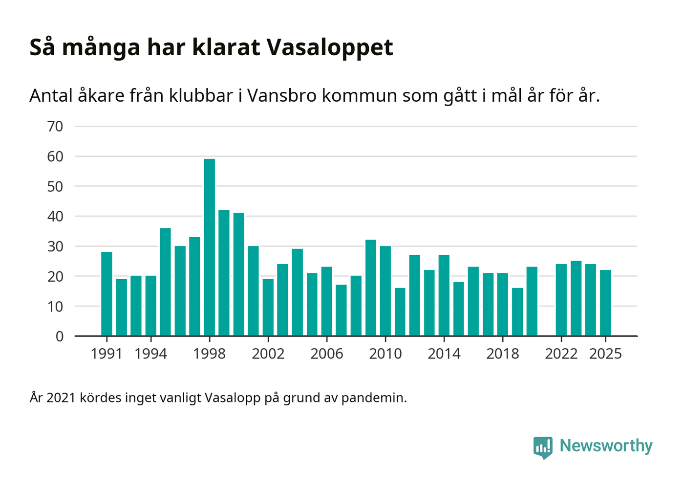 På söndag går starten för det 102:a Vasaloppet. Newsworthy har samlat in och sammanställt samtliga Vasaloppsresultat sedan 1991. Det ger en unik bild av hur skidåkare från klubbar i Vansbro kommun har klarat sig genom åren.