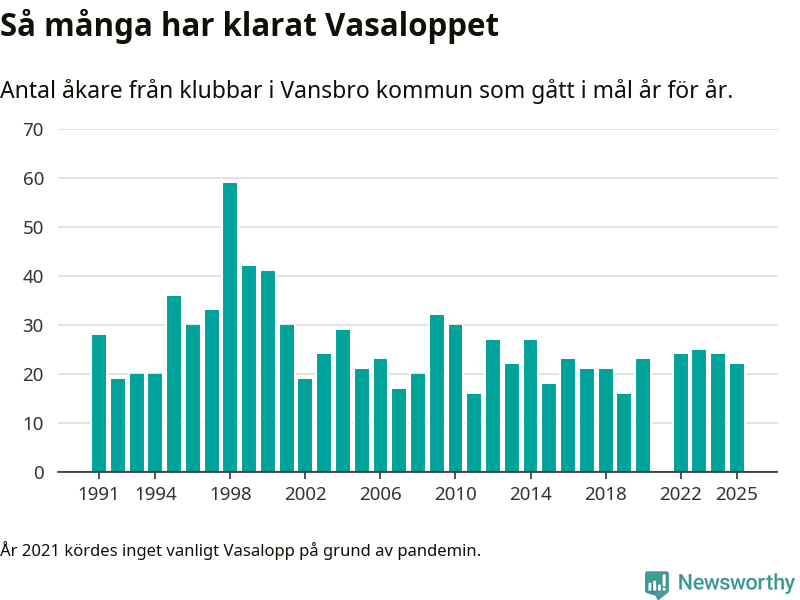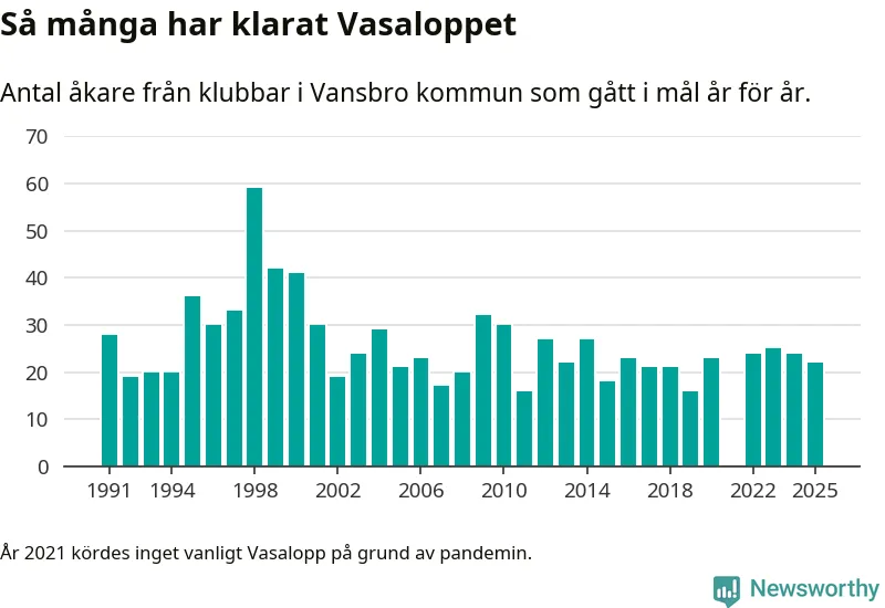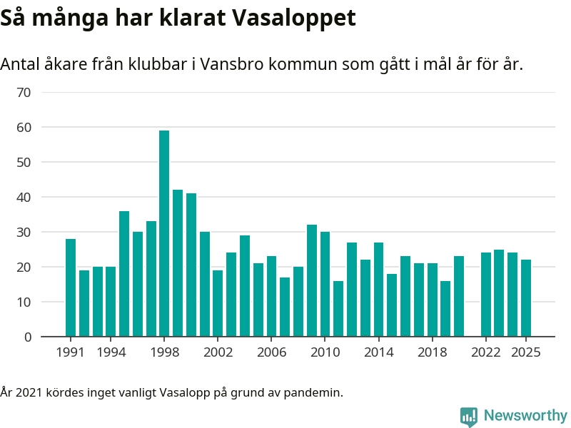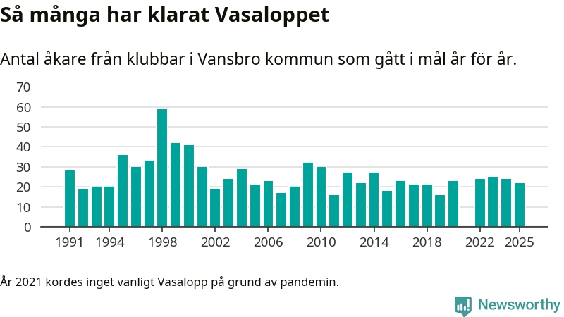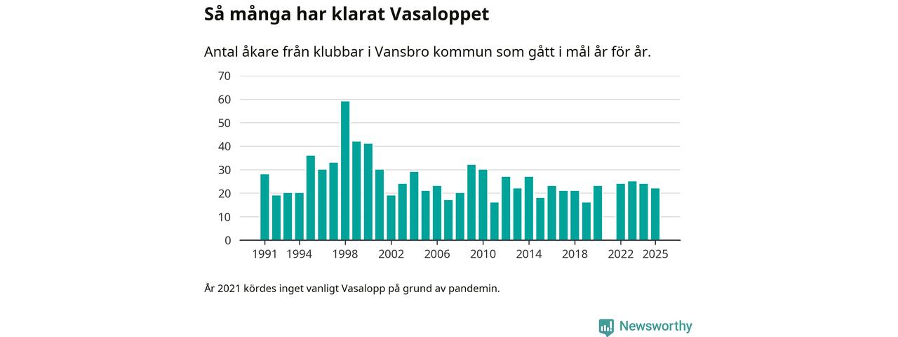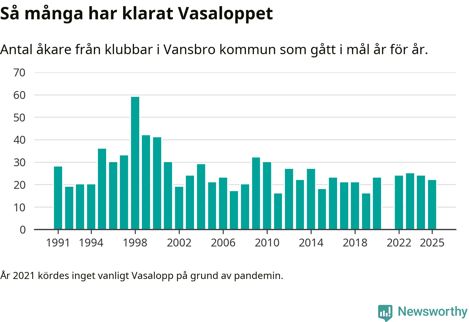 På söndag går starten för det 102:a Vasaloppet. Newsworthy har samlat in och sammanställt samtliga Vasaloppsresultat sedan 1991. Det ger en unik bild av hur skidåkare från klubbar i Vansbro kommun har klarat sig genom åren.