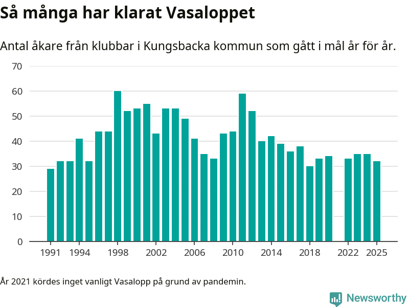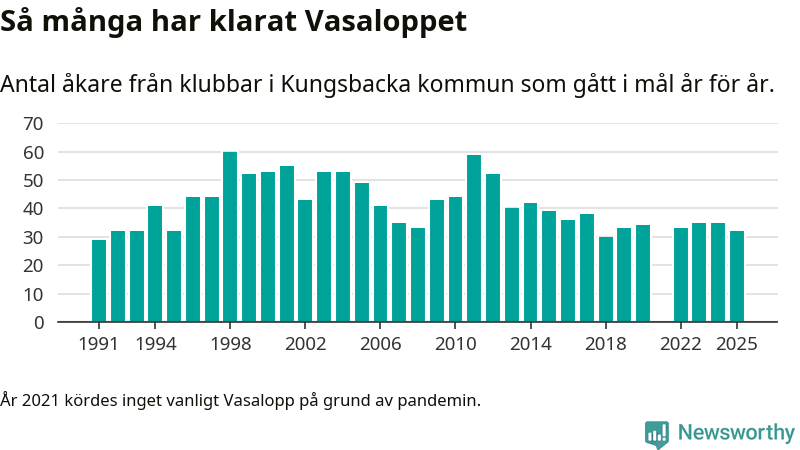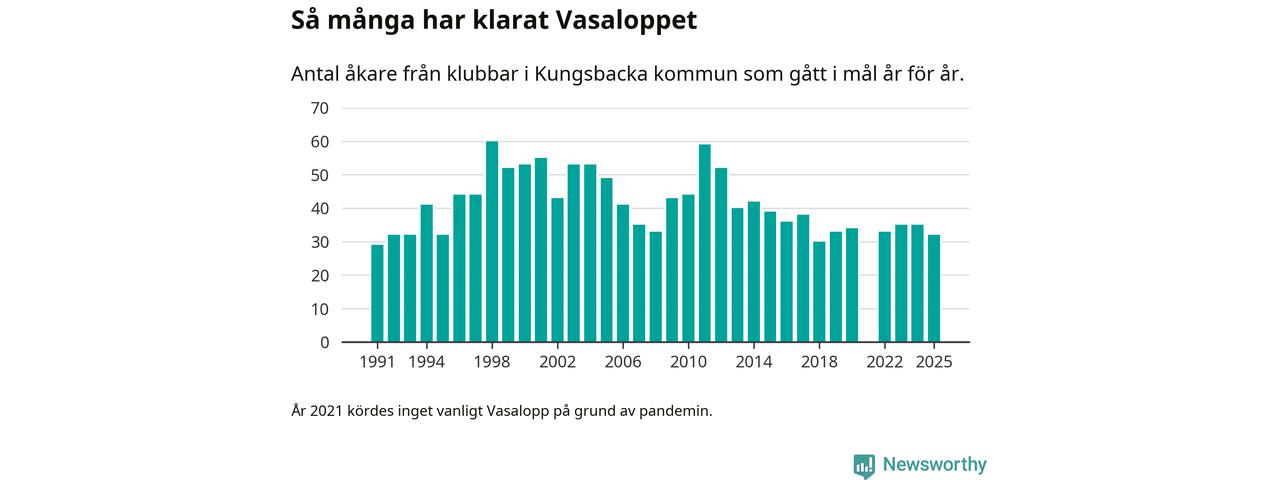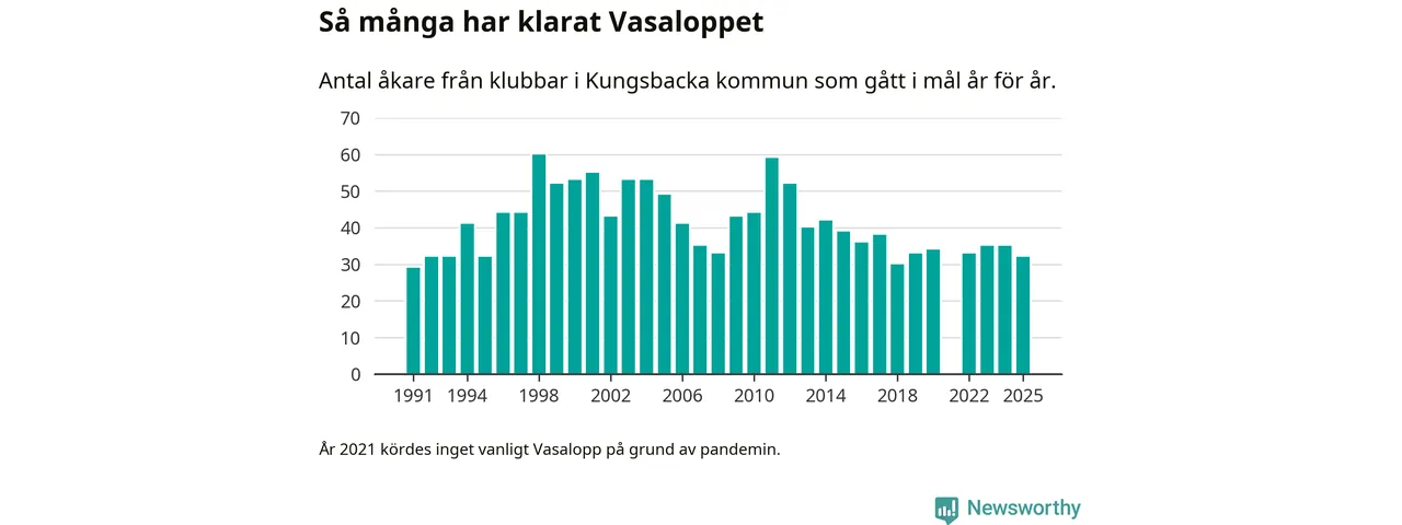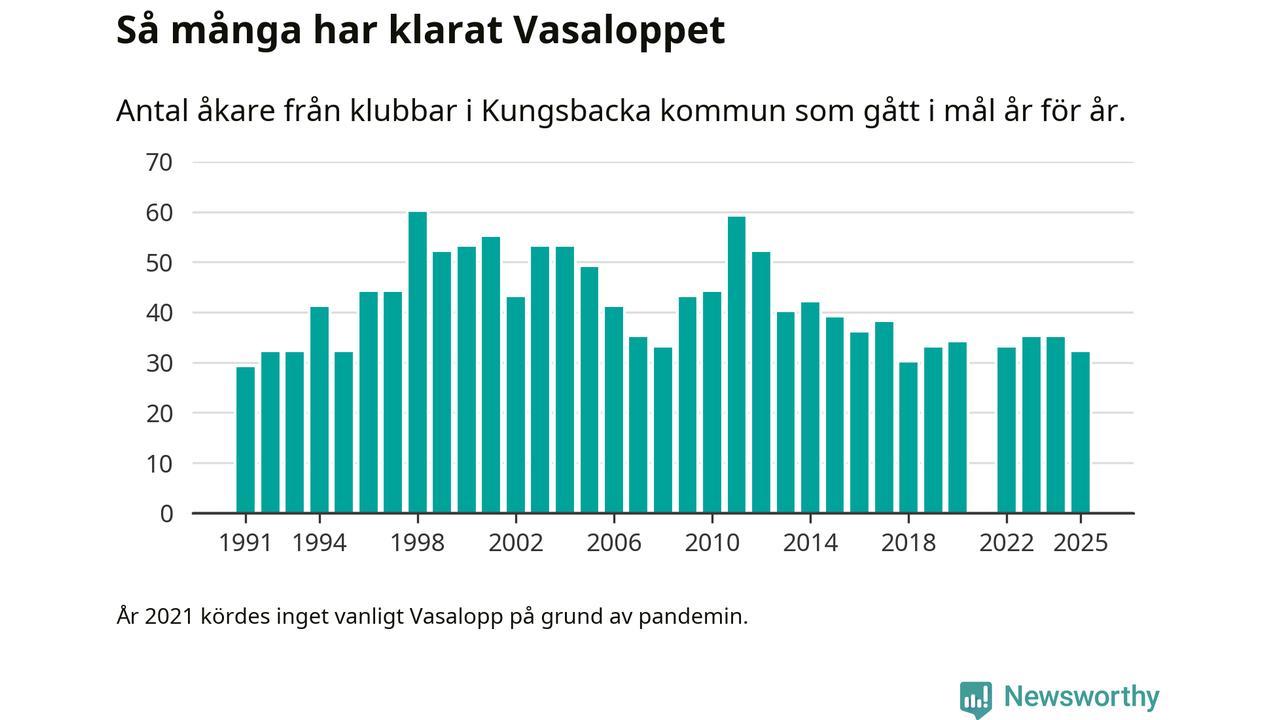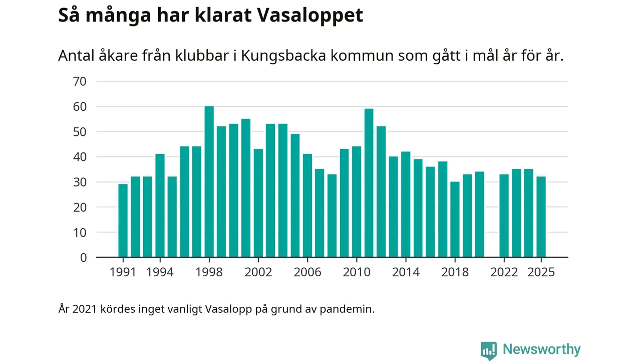 På söndag går starten för det 102:a Vasaloppet. Newsworthy har samlat in och sammanställt samtliga Vasaloppsresultat sedan 1991. Det ger en unik bild av hur skidåkare från klubbar i Kungsbacka kommun har klarat sig genom åren.