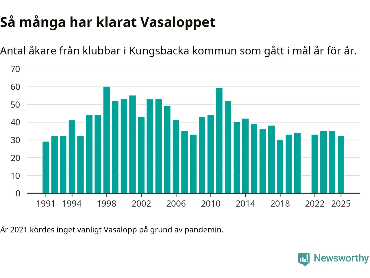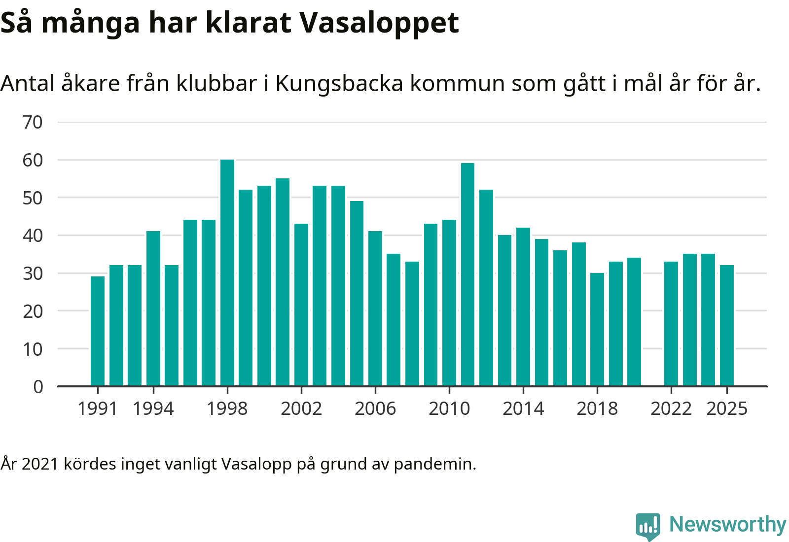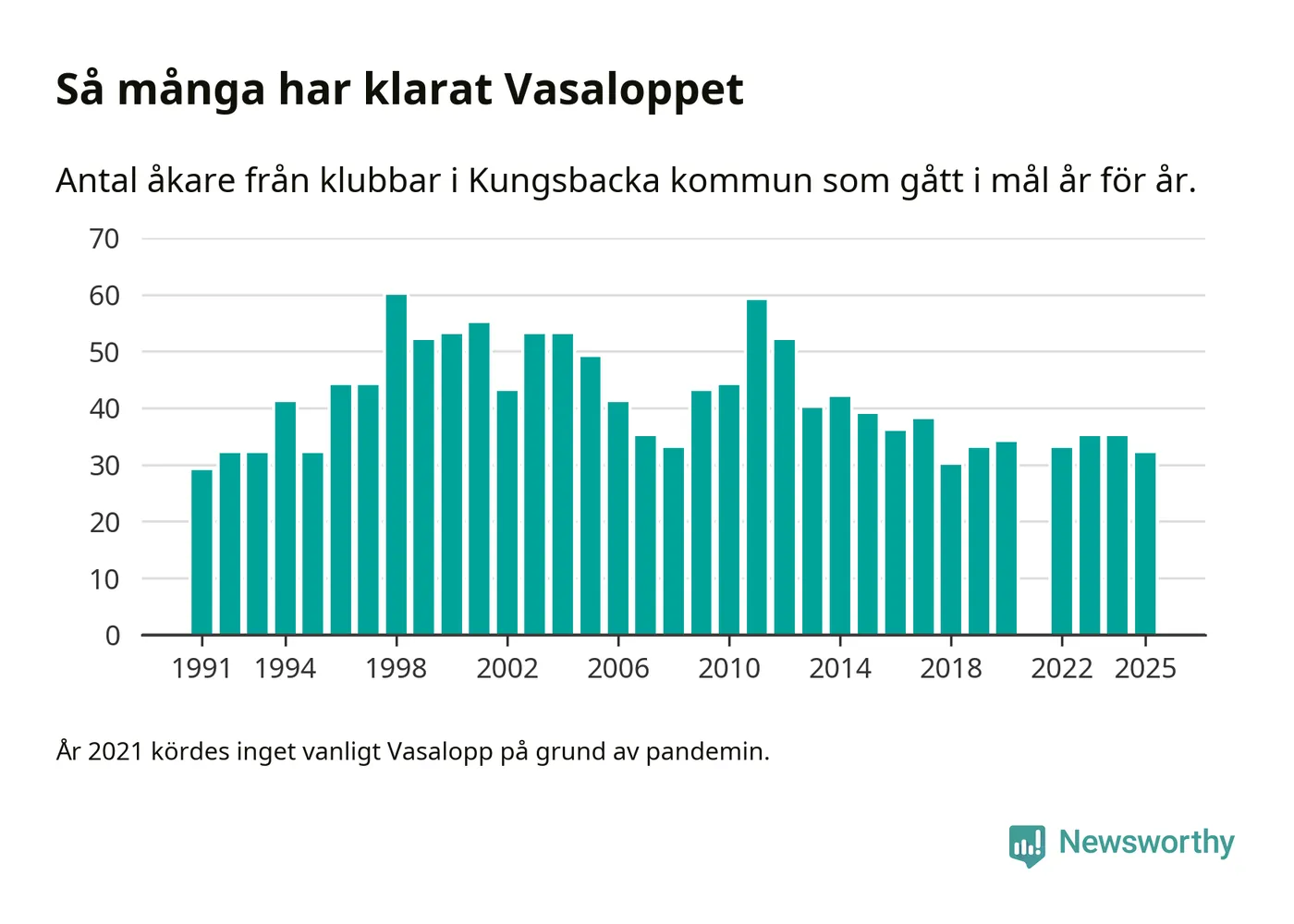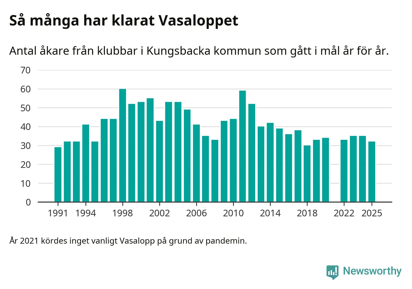 På söndag går starten för det 102:a Vasaloppet. Newsworthy har samlat in och sammanställt samtliga Vasaloppsresultat sedan 1991. Det ger en unik bild av hur skidåkare från klubbar i Kungsbacka kommun har klarat sig genom åren.
