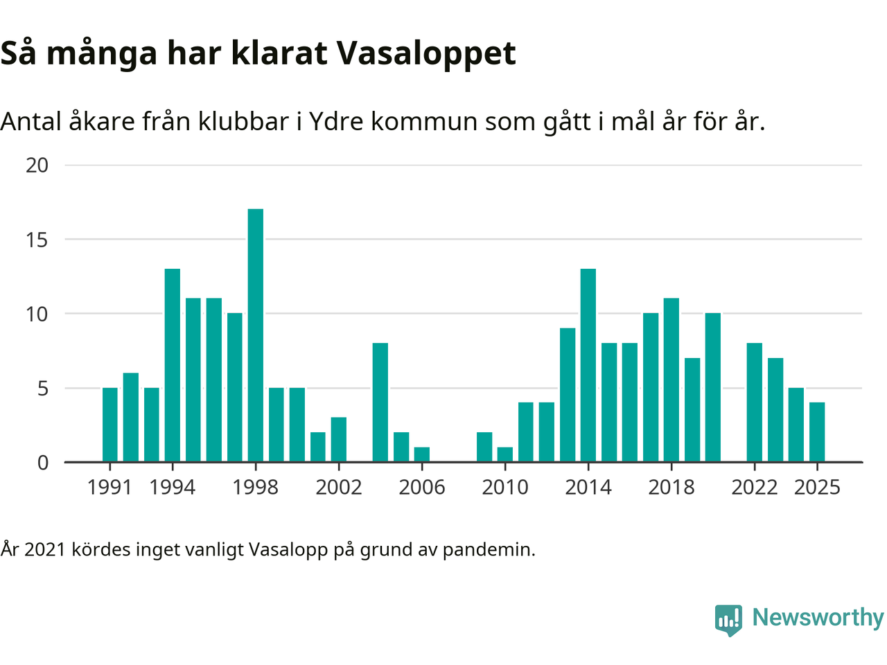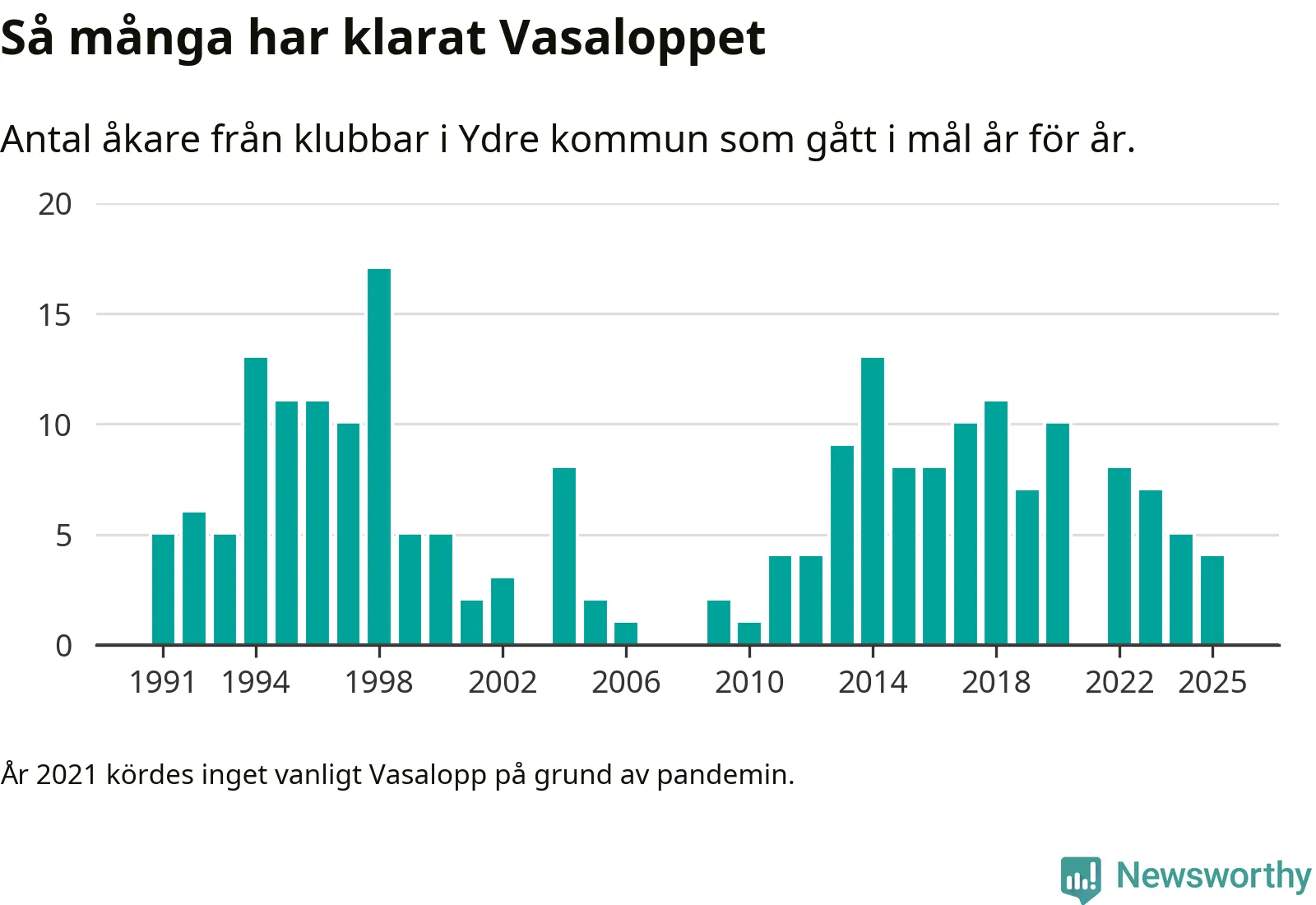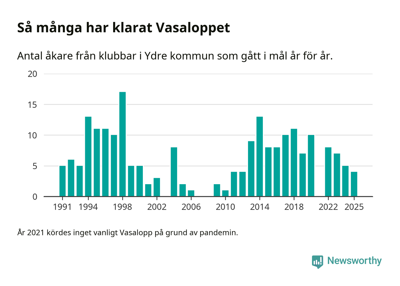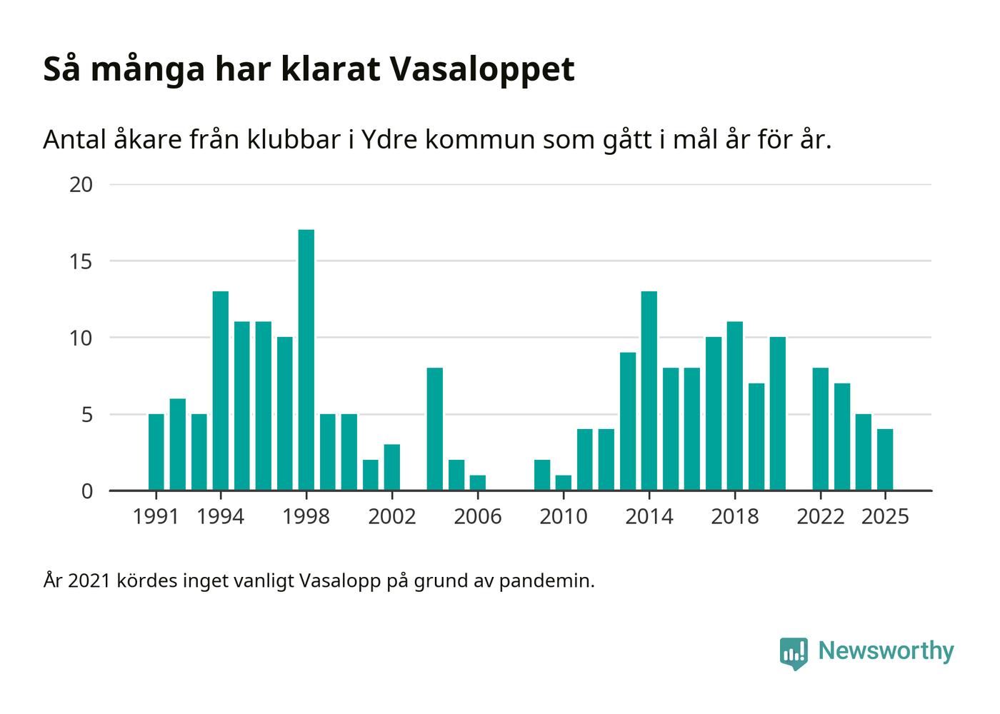På söndag går starten för det 102:a Vasaloppet. Newsworthy har samlat in och sammanställt samtliga Vasaloppsresultat sedan 1991. Det ger en unik bild av hur skidåkare från klubbar i Ydre kommun har klarat sig genom åren.
