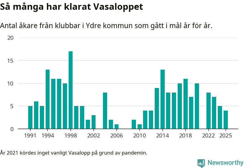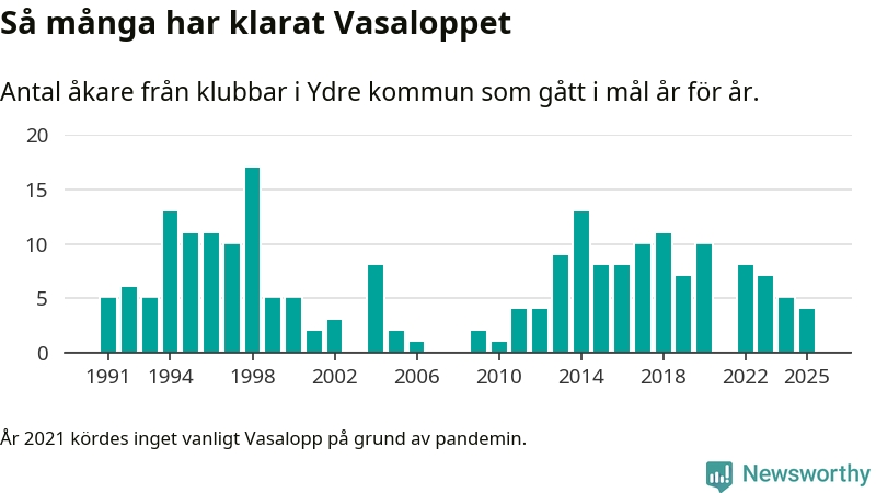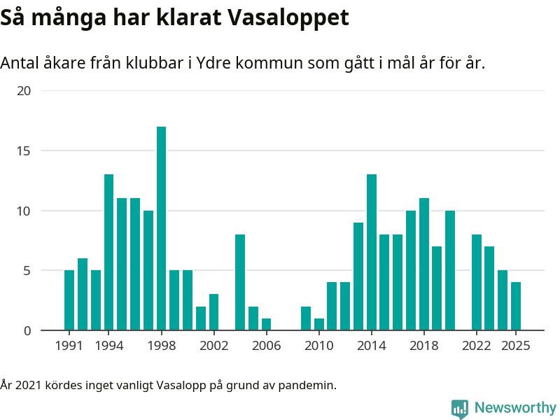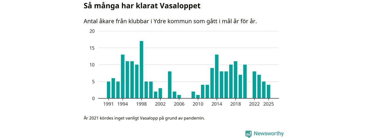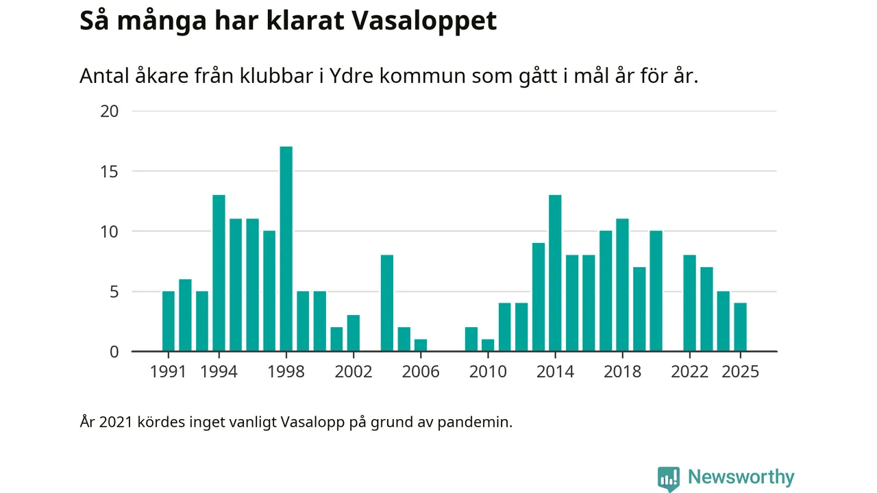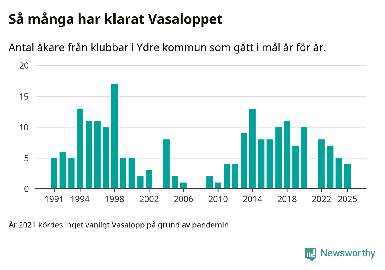 På söndag går starten för det 102:a Vasaloppet. Newsworthy har samlat in och sammanställt samtliga Vasaloppsresultat sedan 1991. Det ger en unik bild av hur skidåkare från klubbar i Ydre kommun har klarat sig genom åren.