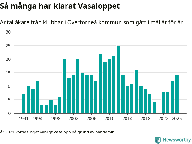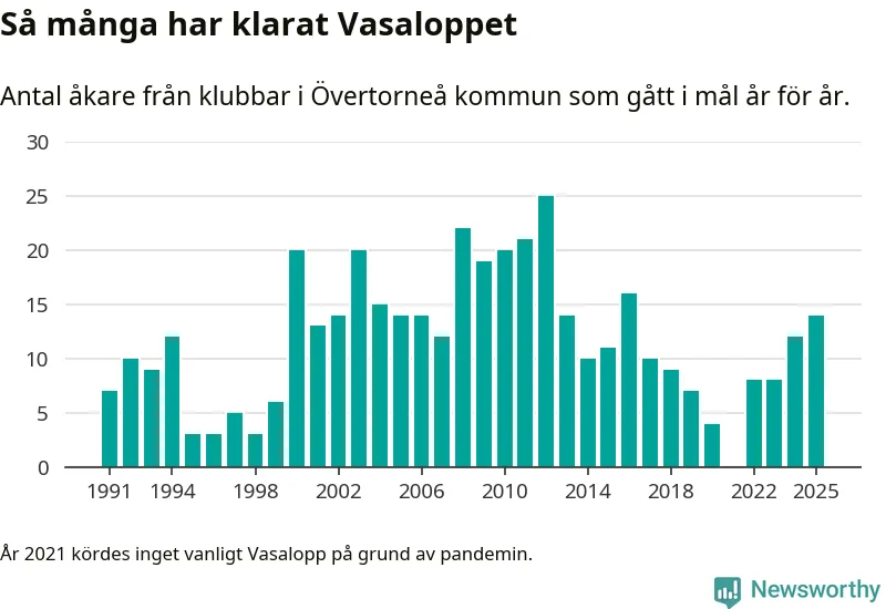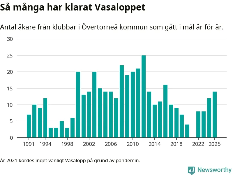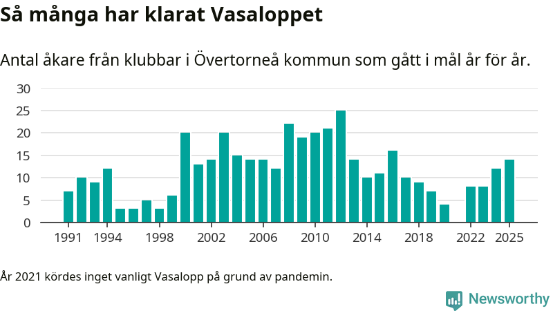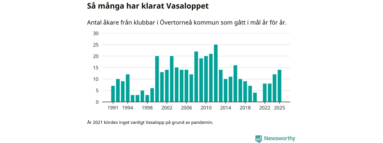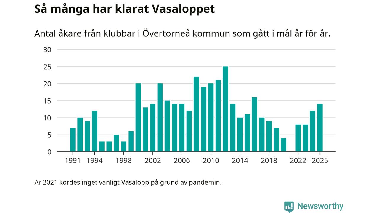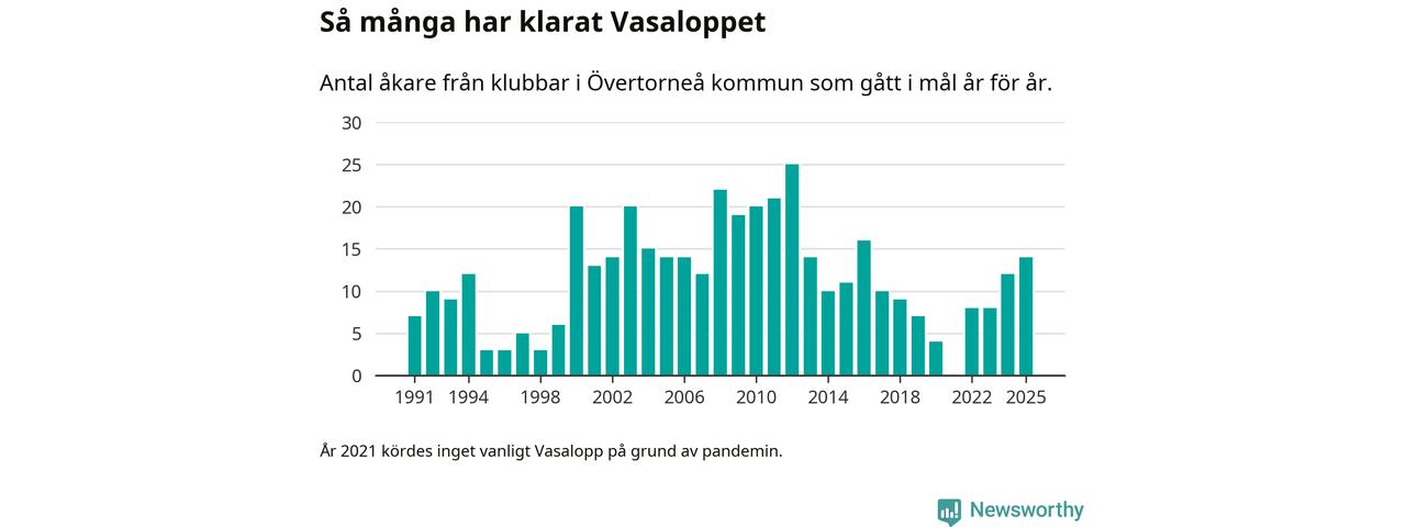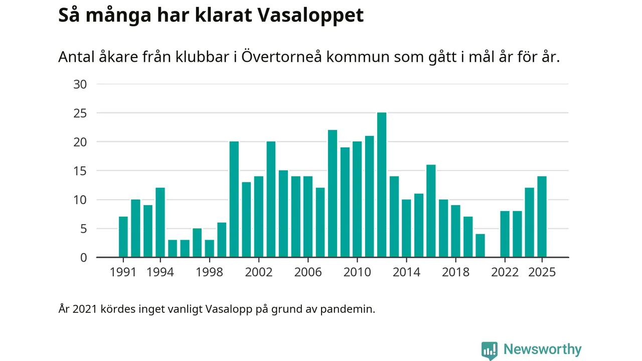 På söndag går starten för det 102:a Vasaloppet. Newsworthy har samlat in och sammanställt samtliga Vasaloppsresultat sedan 1991. Det ger en unik bild av hur skidåkare från klubbar i Övertorneå kommun har klarat sig genom åren.