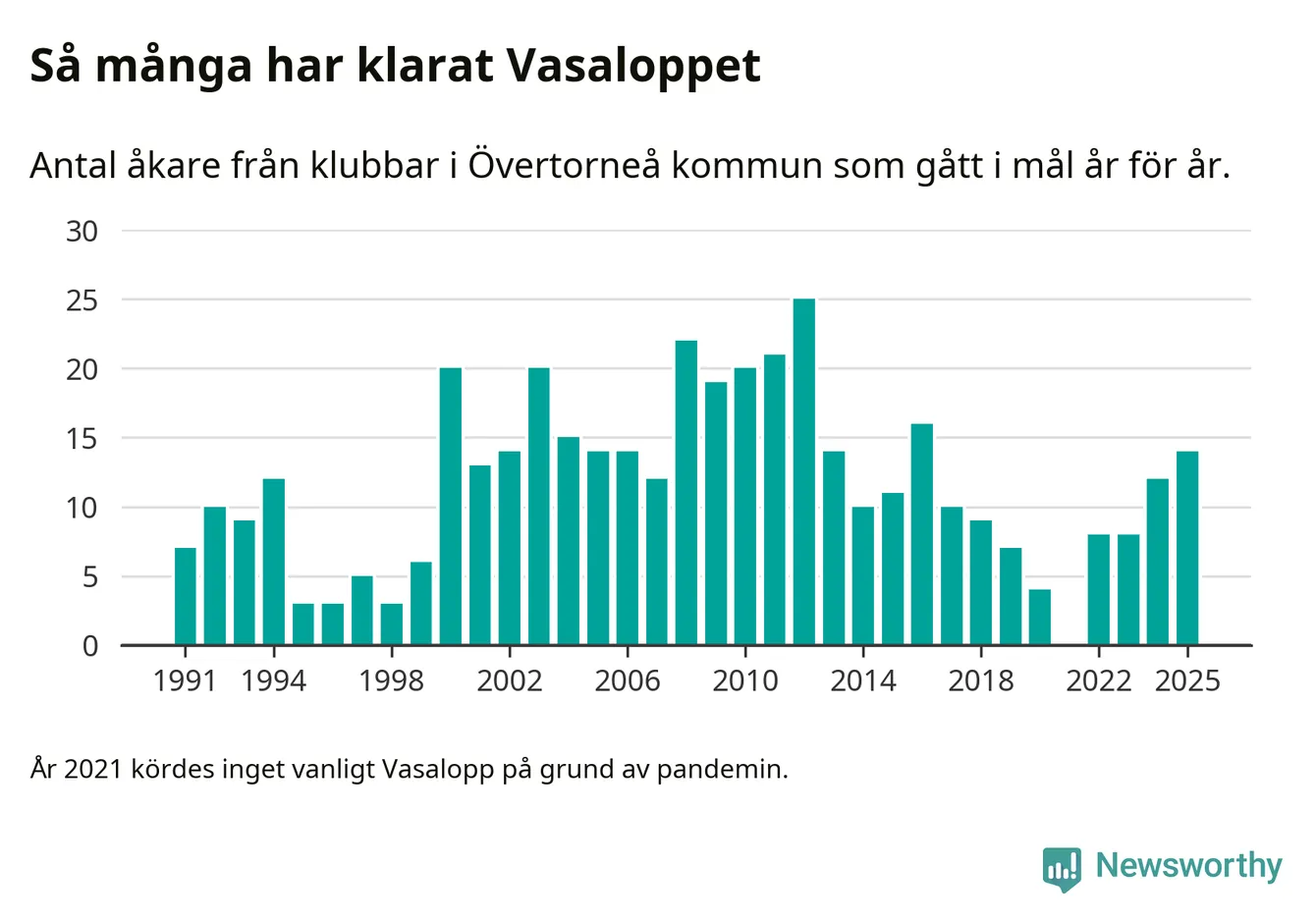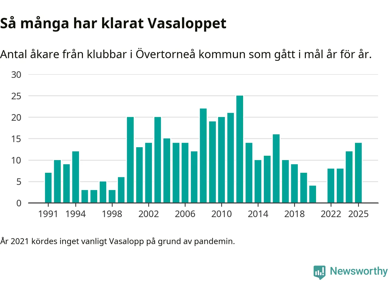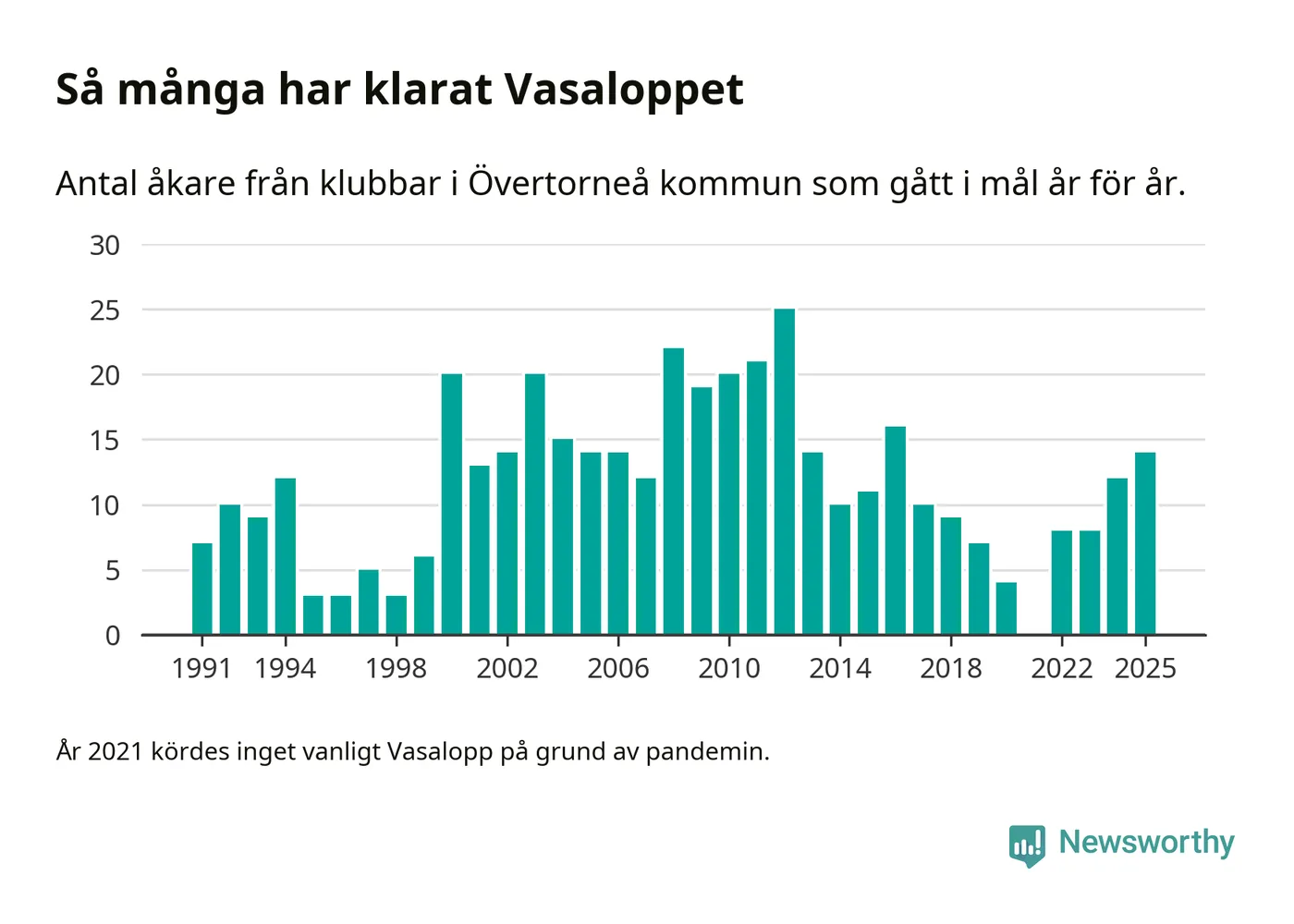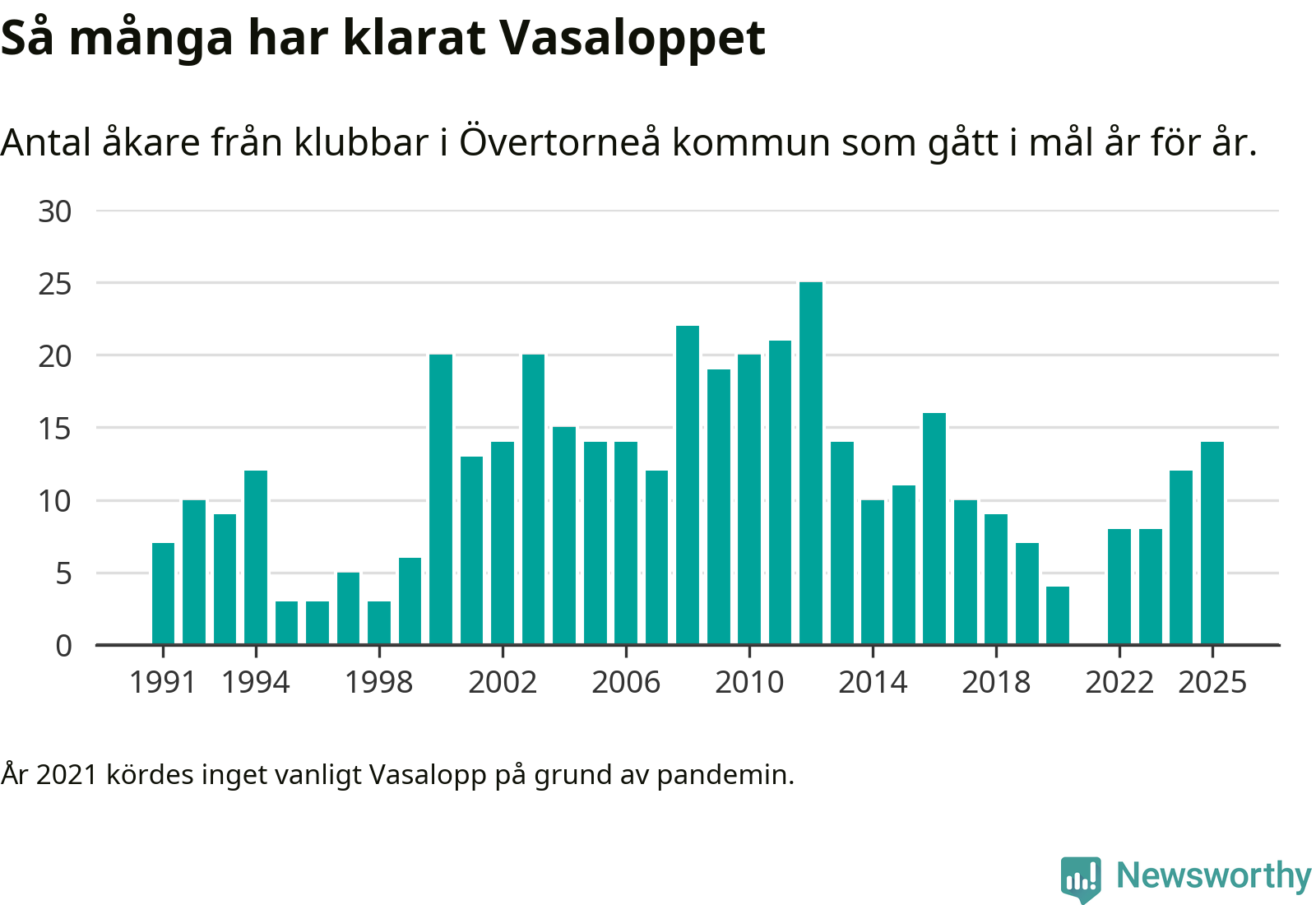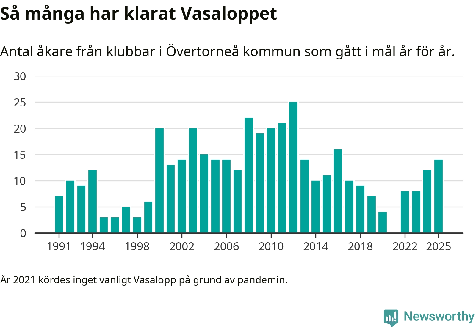 På söndag går starten för det 102:a Vasaloppet. Newsworthy har samlat in och sammanställt samtliga Vasaloppsresultat sedan 1991. Det ger en unik bild av hur skidåkare från klubbar i Övertorneå kommun har klarat sig genom åren.