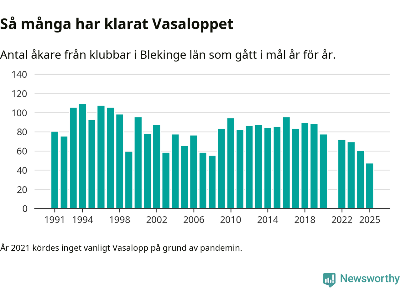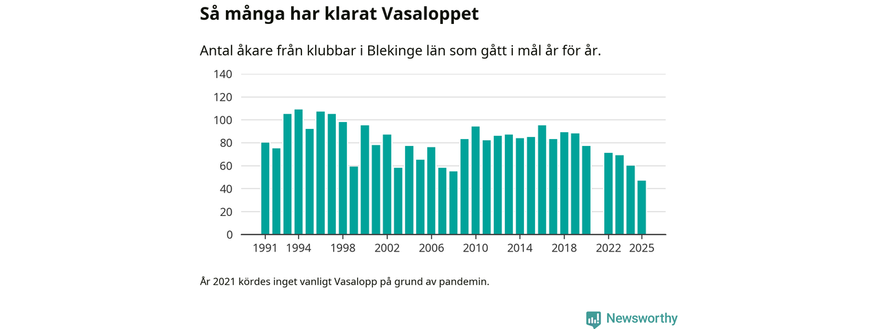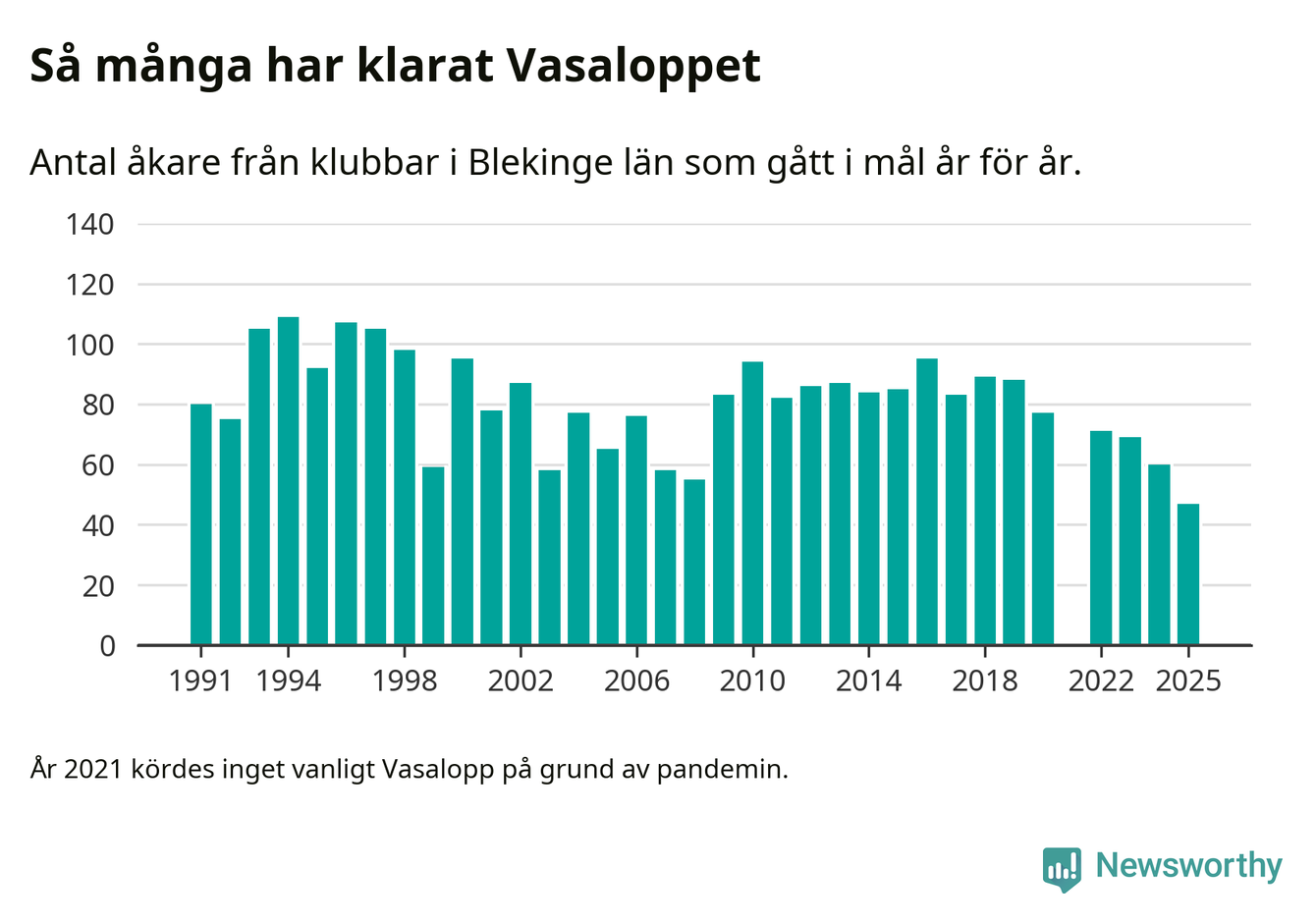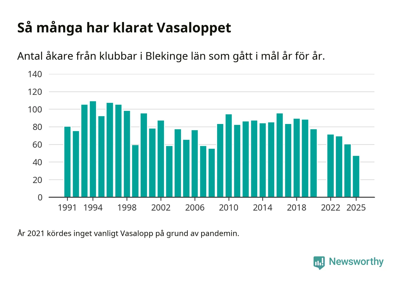 På söndag går starten för det 102:a Vasaloppet. Newsworthy har samlat in och sammanställt samtliga Vasaloppsresultat sedan 1991. Det ger en unik bild av hur skidåkare från klubbar i Blekinge län har klarat sig genom åren.