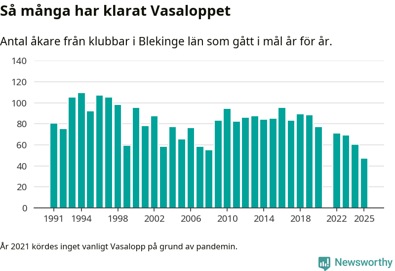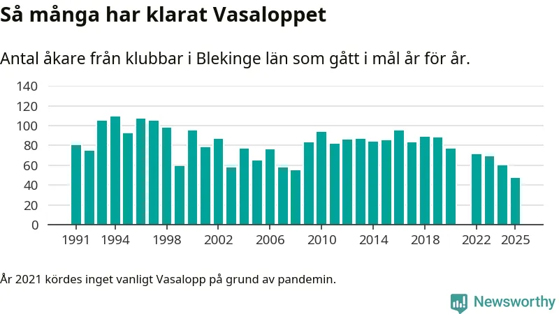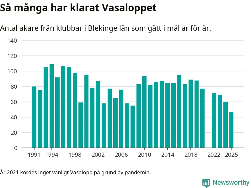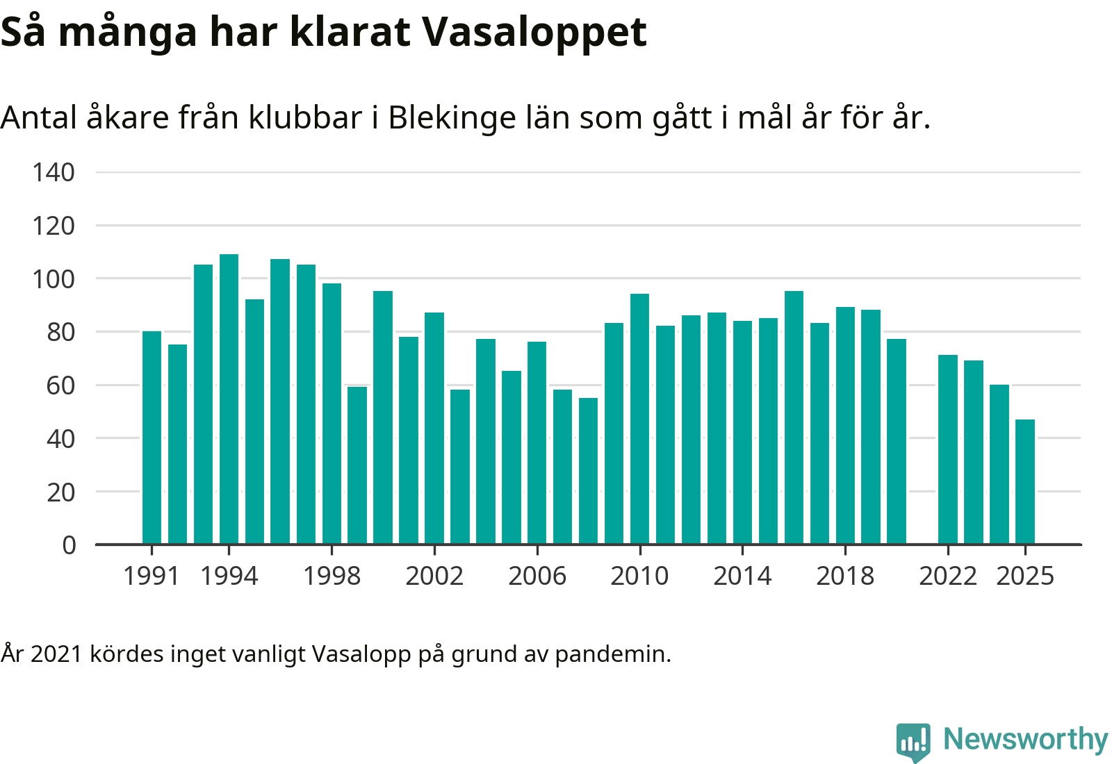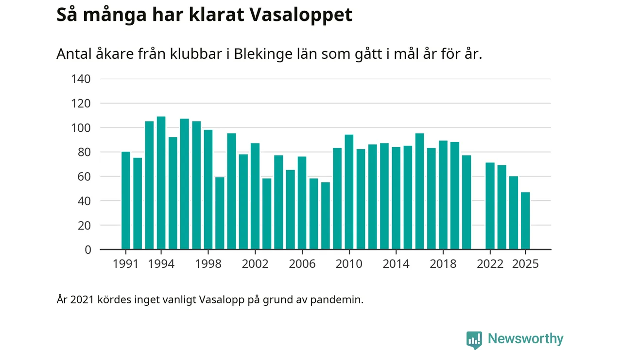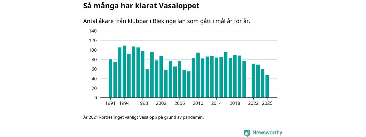 På söndag går starten för det 102:a Vasaloppet. Newsworthy har samlat in och sammanställt samtliga Vasaloppsresultat sedan 1991. Det ger en unik bild av hur skidåkare från klubbar i Blekinge län har klarat sig genom åren.