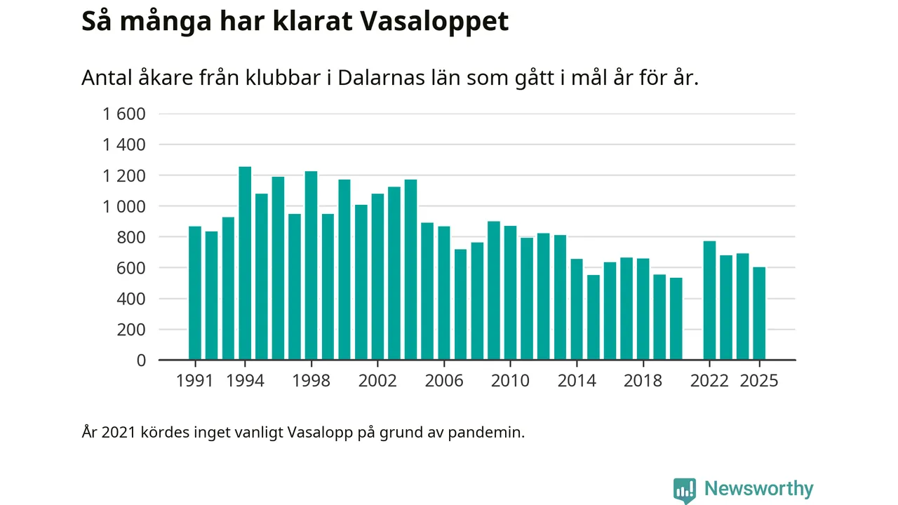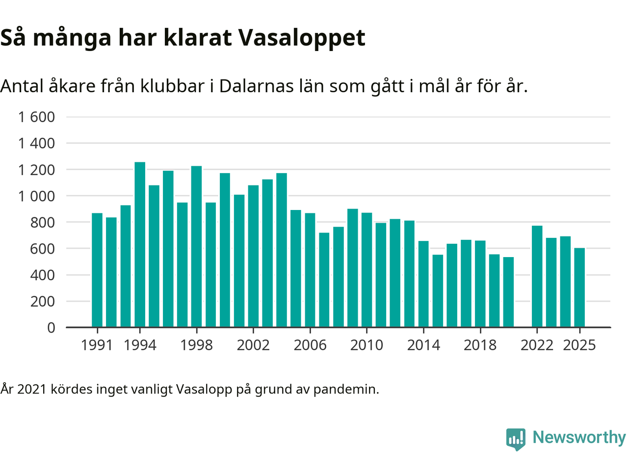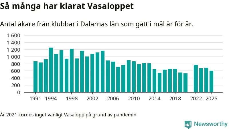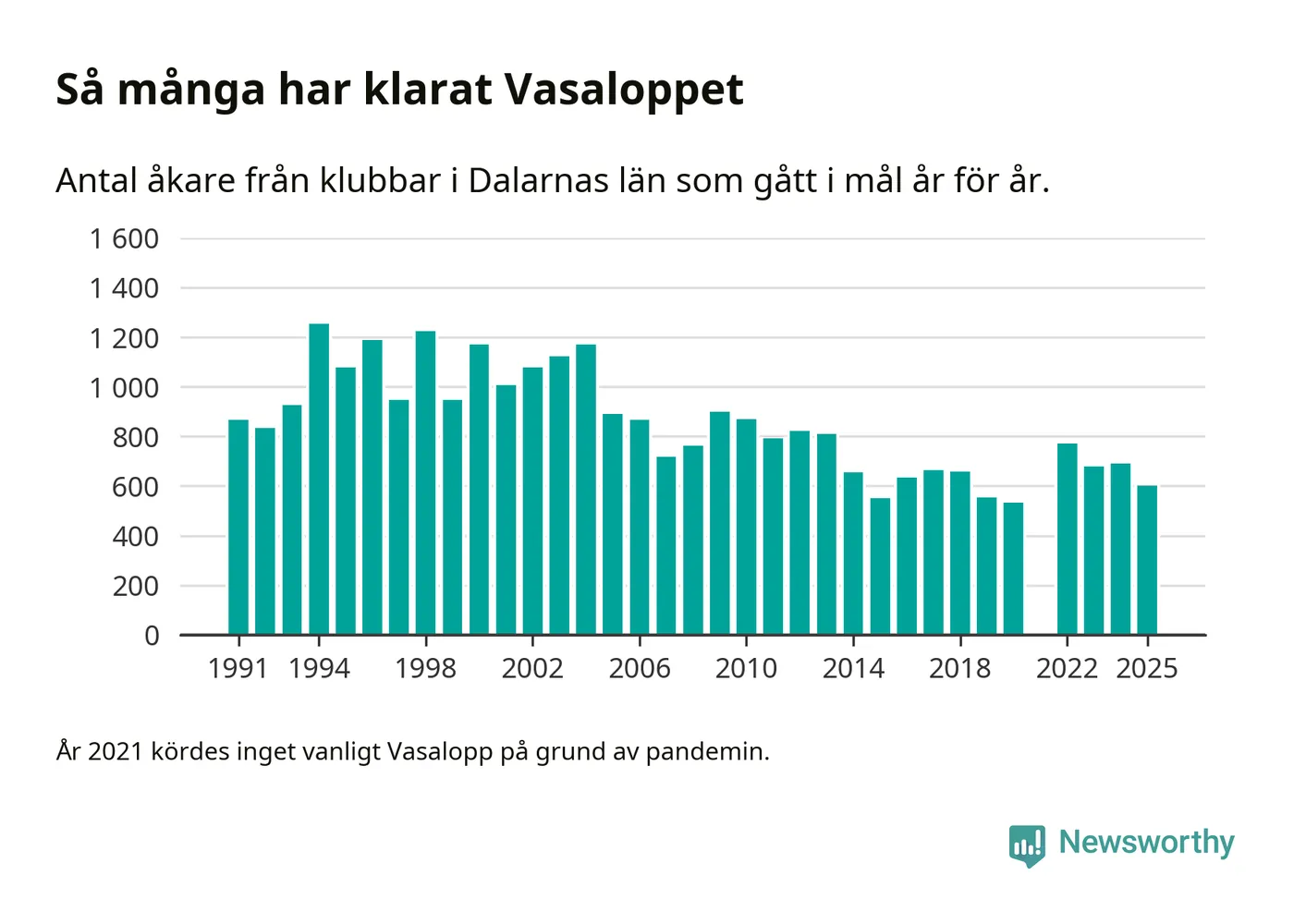 På söndag går starten för det 102:a Vasaloppet. Newsworthy har samlat in och sammanställt samtliga Vasaloppsresultat sedan 1991. Det ger en unik bild av hur skidåkare från klubbar i Dalarnas län har klarat sig genom åren.