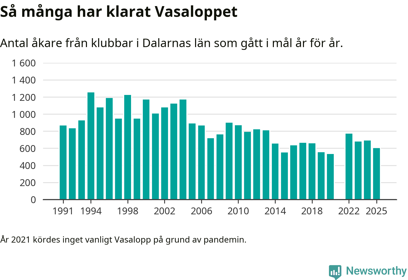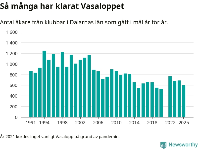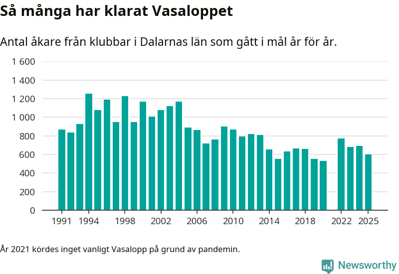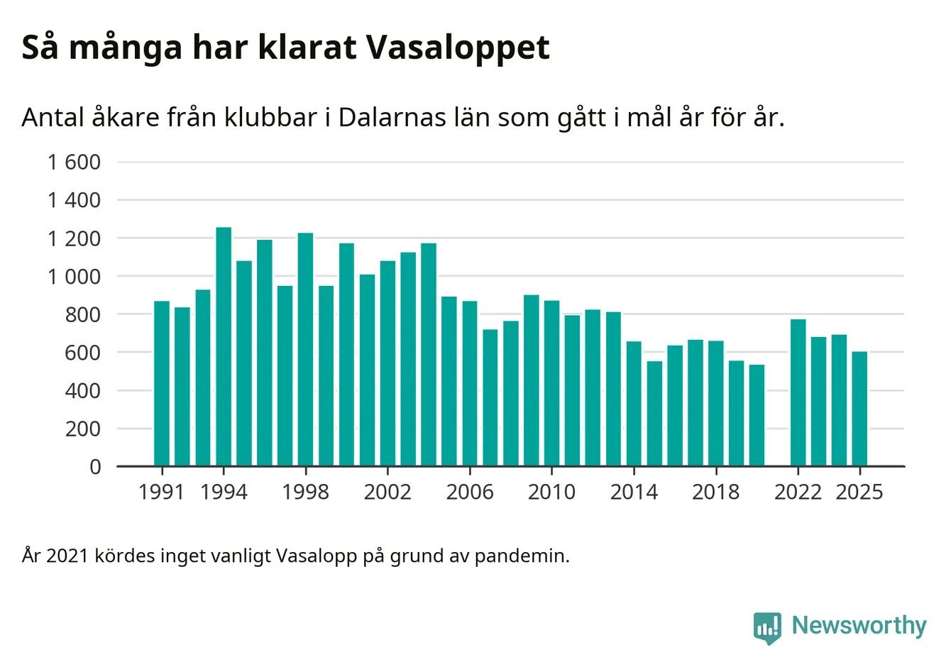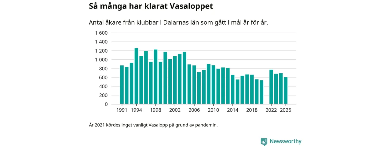 På söndag går starten för det 102:a Vasaloppet. Newsworthy har samlat in och sammanställt samtliga Vasaloppsresultat sedan 1991. Det ger en unik bild av hur skidåkare från klubbar i Dalarnas län har klarat sig genom åren.