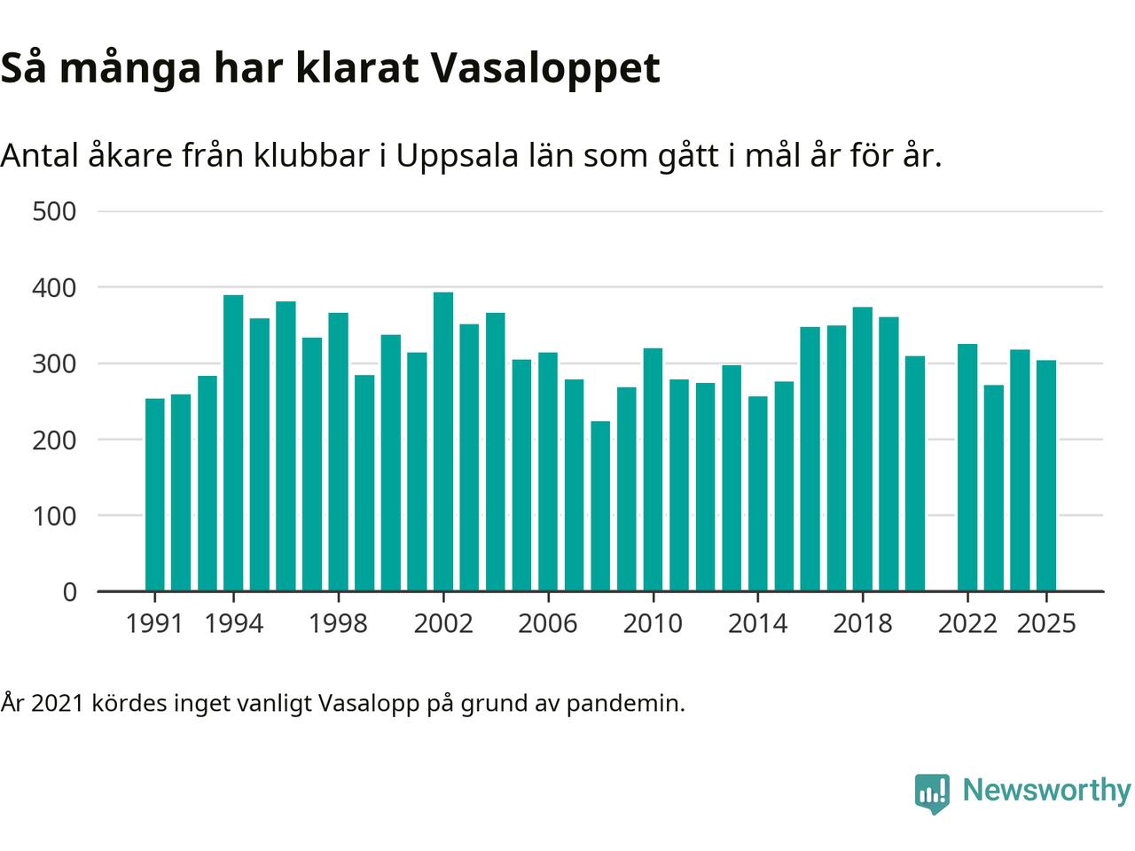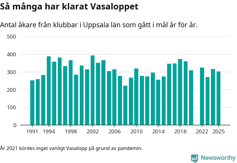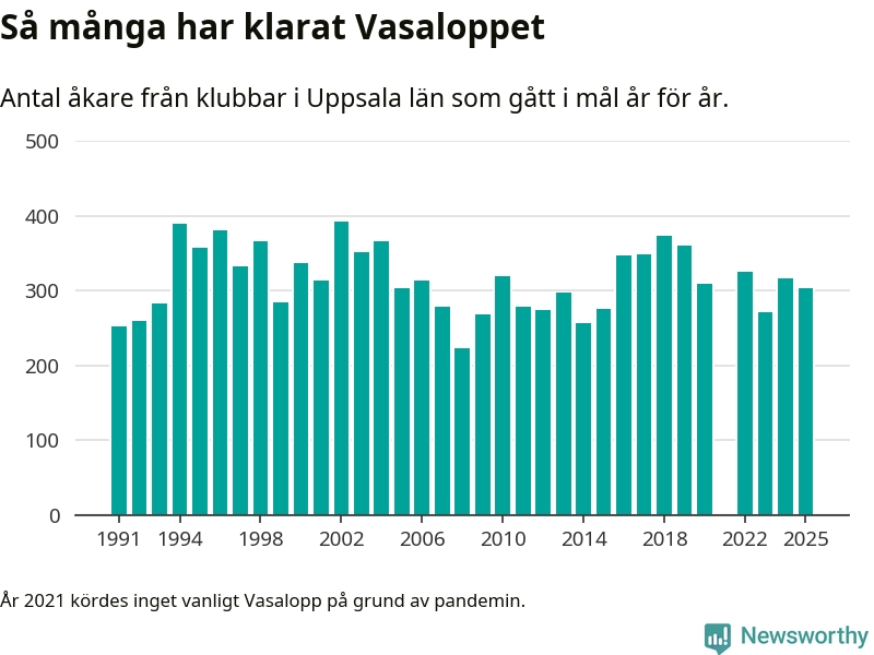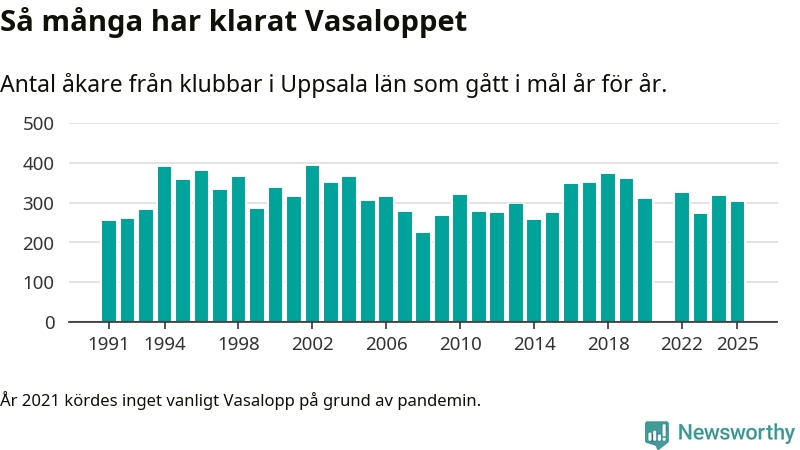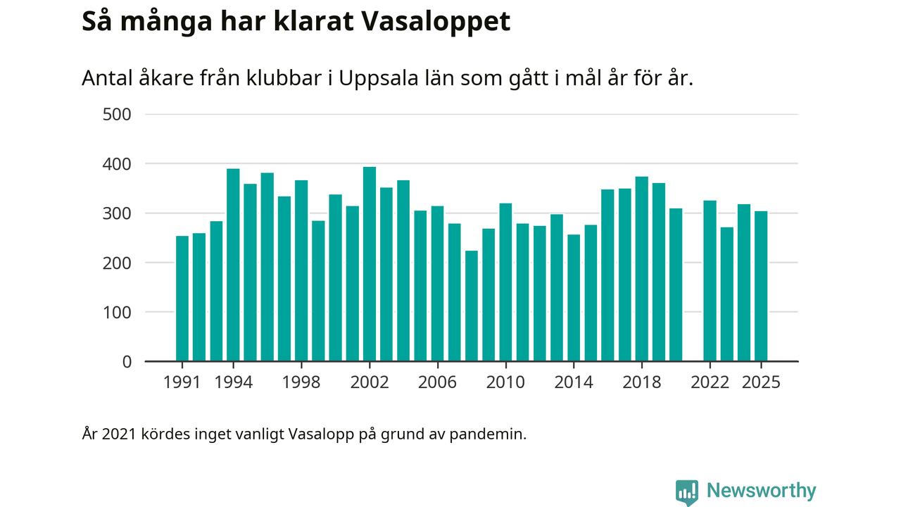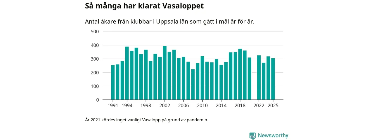 På söndag går starten för det 102:a Vasaloppet. Newsworthy har samlat in och sammanställt samtliga Vasaloppsresultat sedan 1991. Det ger en unik bild av hur skidåkare från klubbar i Uppsala län har klarat sig genom åren.