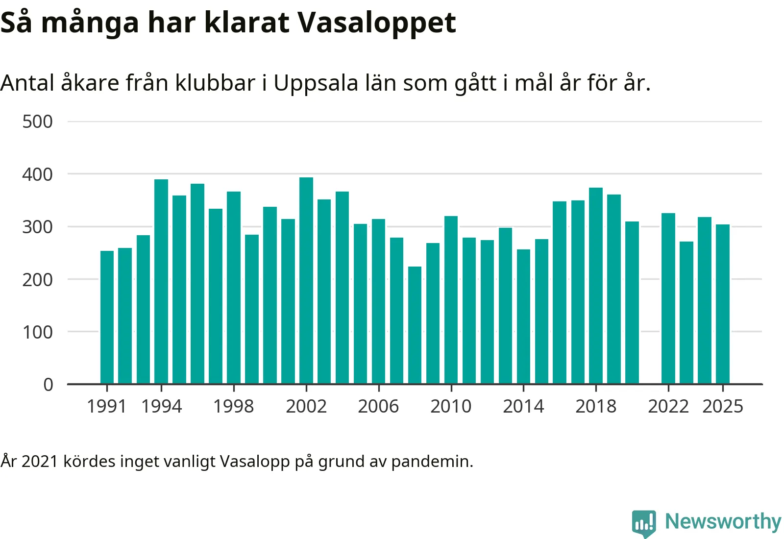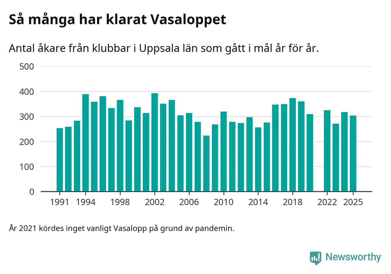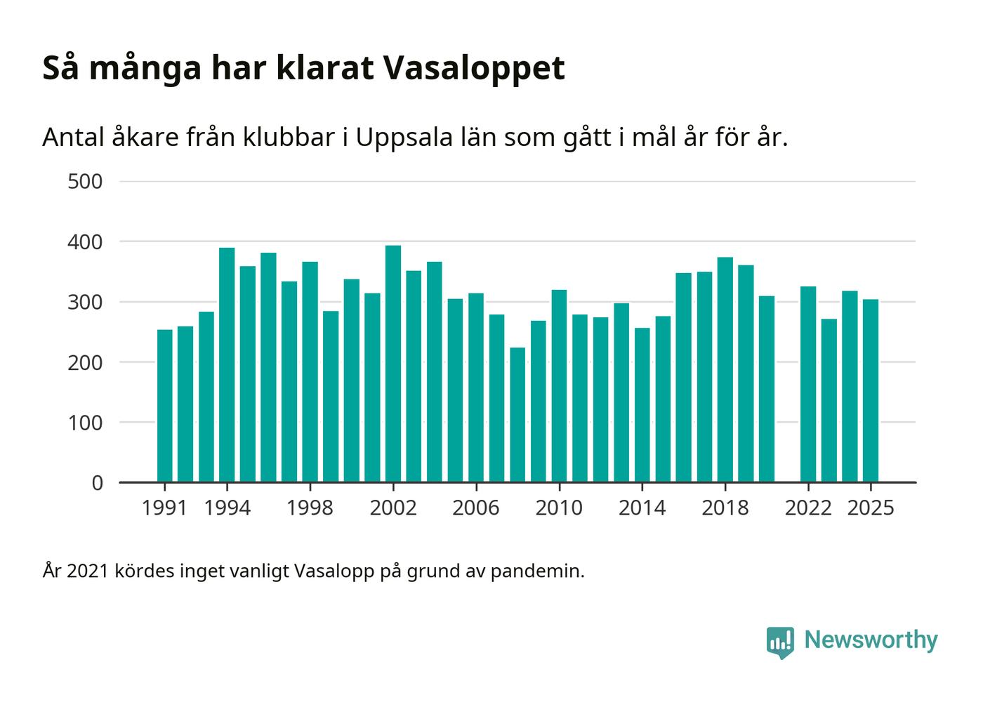 På söndag går starten för det 102:a Vasaloppet. Newsworthy har samlat in och sammanställt samtliga Vasaloppsresultat sedan 1991. Det ger en unik bild av hur skidåkare från klubbar i Uppsala län har klarat sig genom åren.