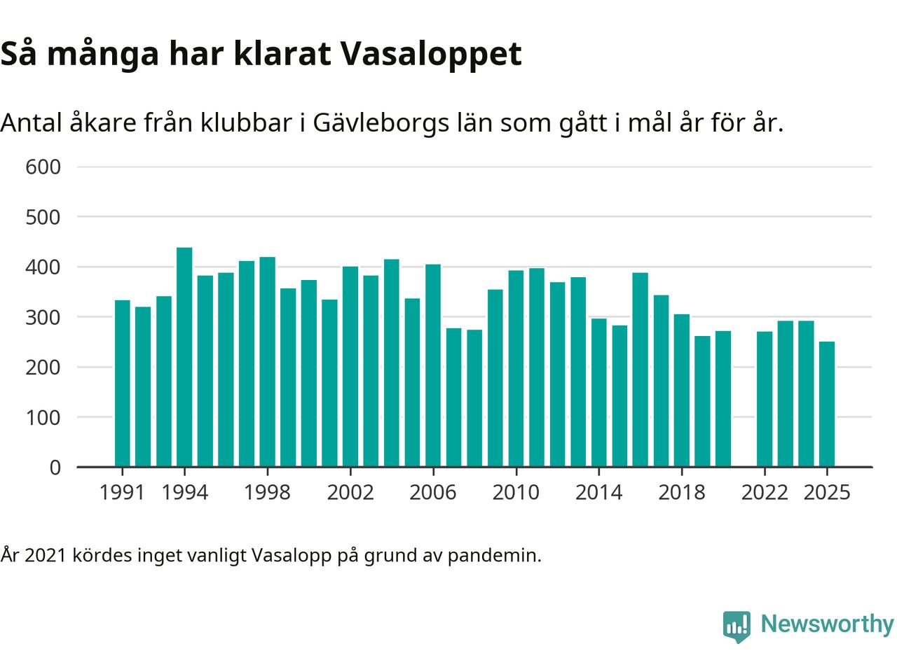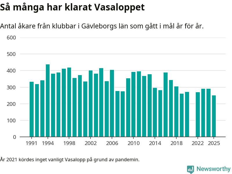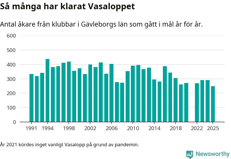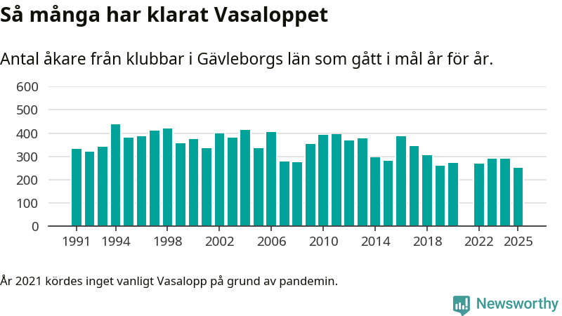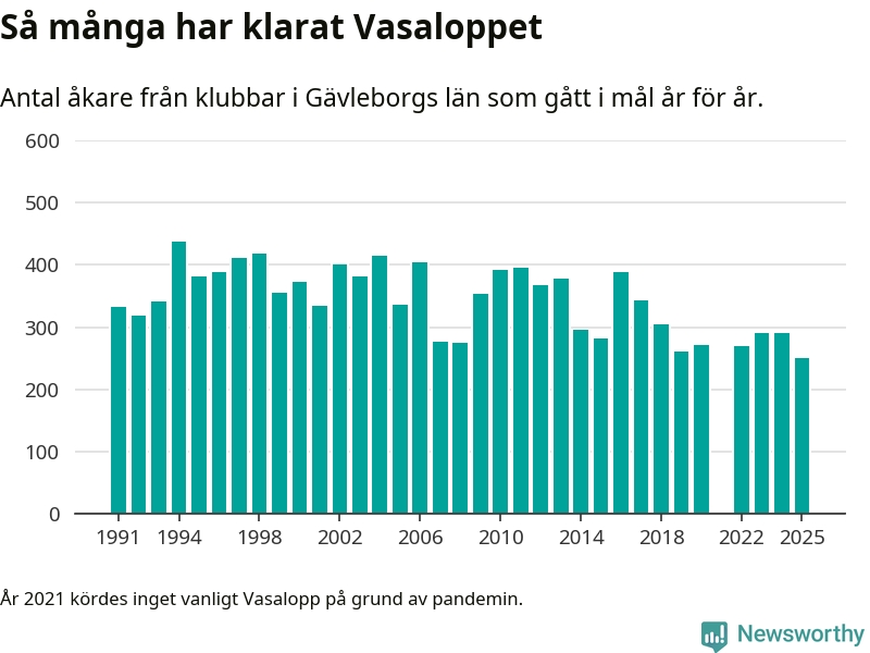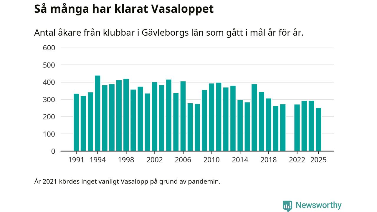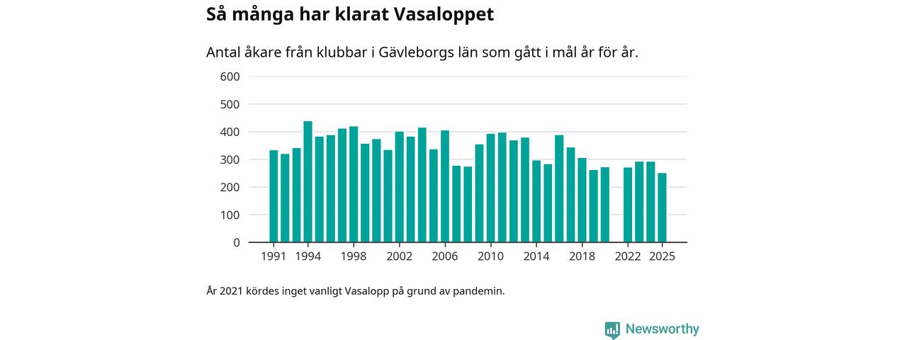På söndag går starten för det 102:a Vasaloppet. Newsworthy har samlat in och sammanställt samtliga Vasaloppsresultat sedan 1991. Det ger en unik bild av hur skidåkare från klubbar i Gävleborgs län har klarat sig genom åren.