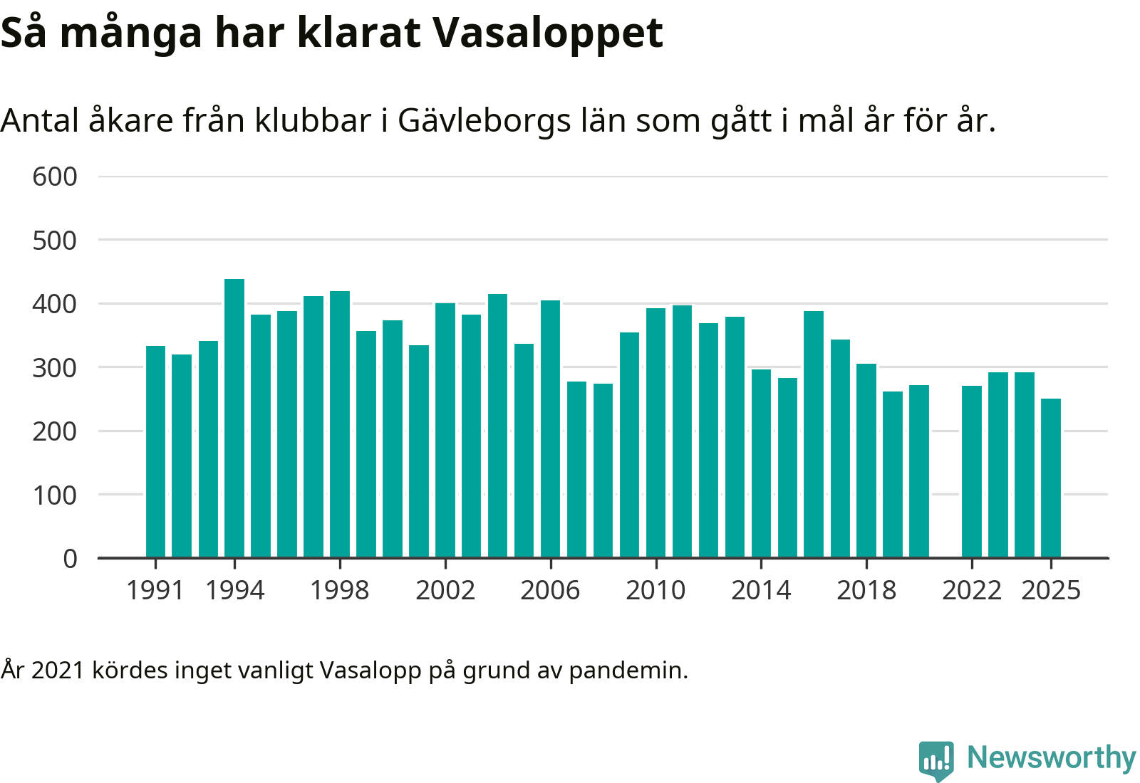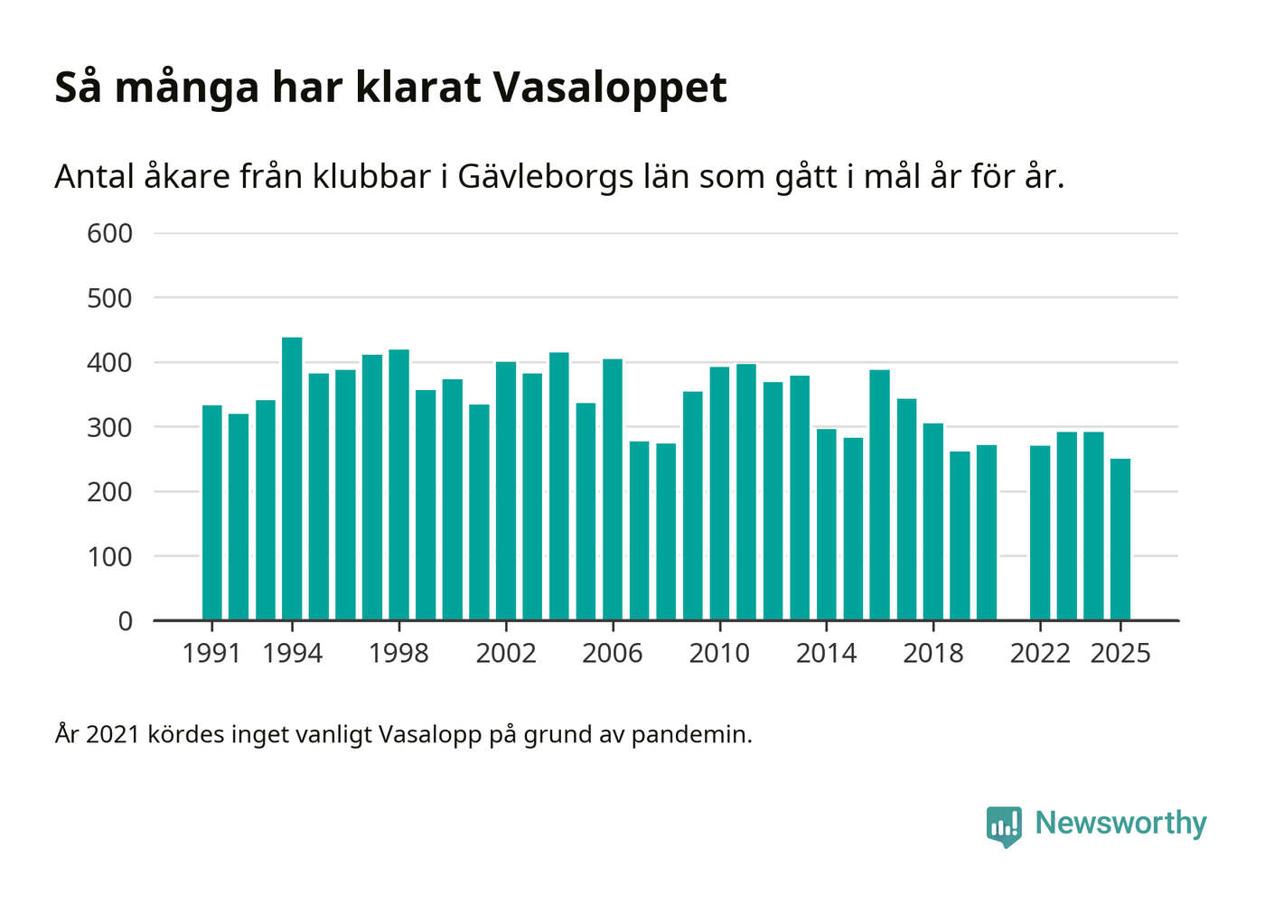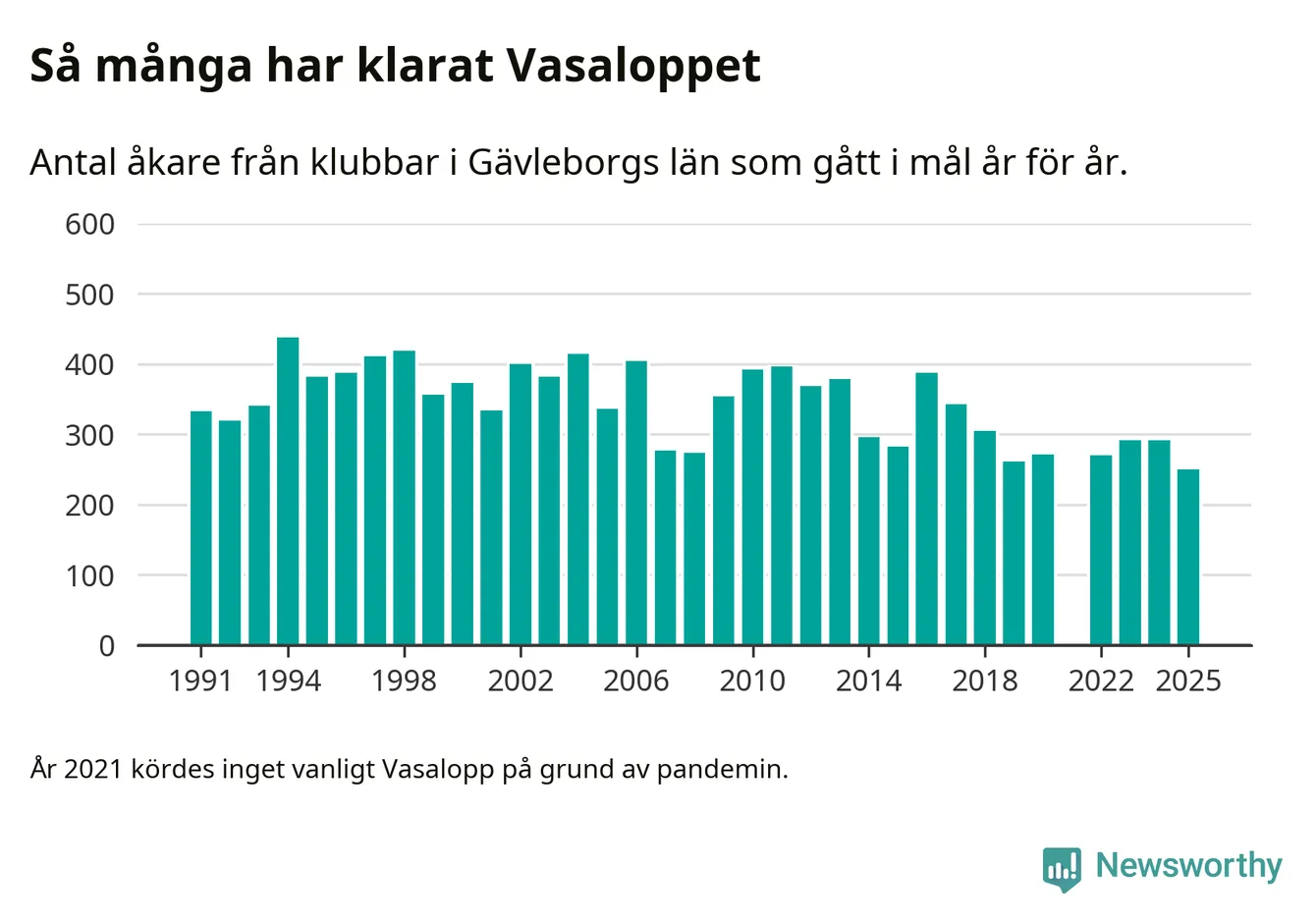På söndag går starten för det 102:a Vasaloppet. Newsworthy har samlat in och sammanställt samtliga Vasaloppsresultat sedan 1991. Det ger en unik bild av hur skidåkare från klubbar i Gävleborgs län har klarat sig genom åren.