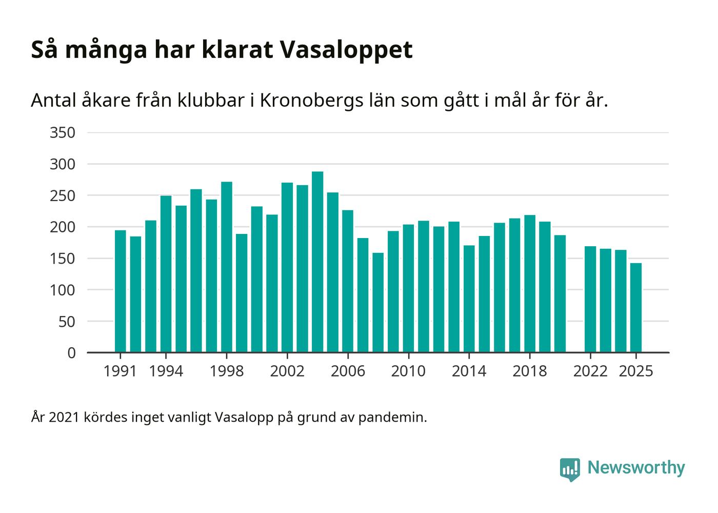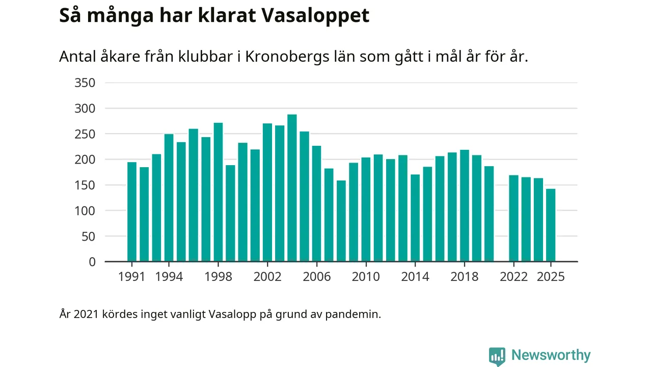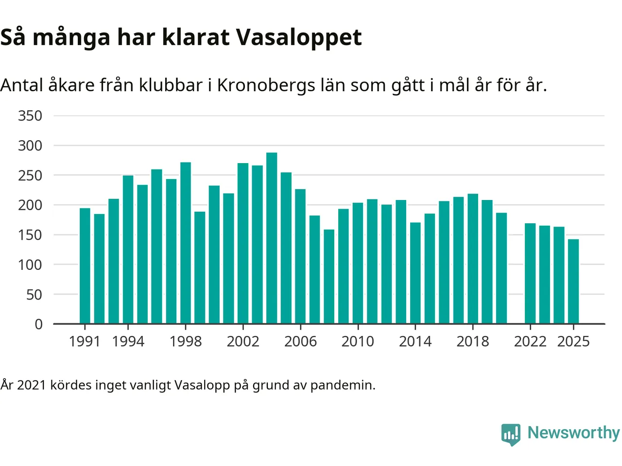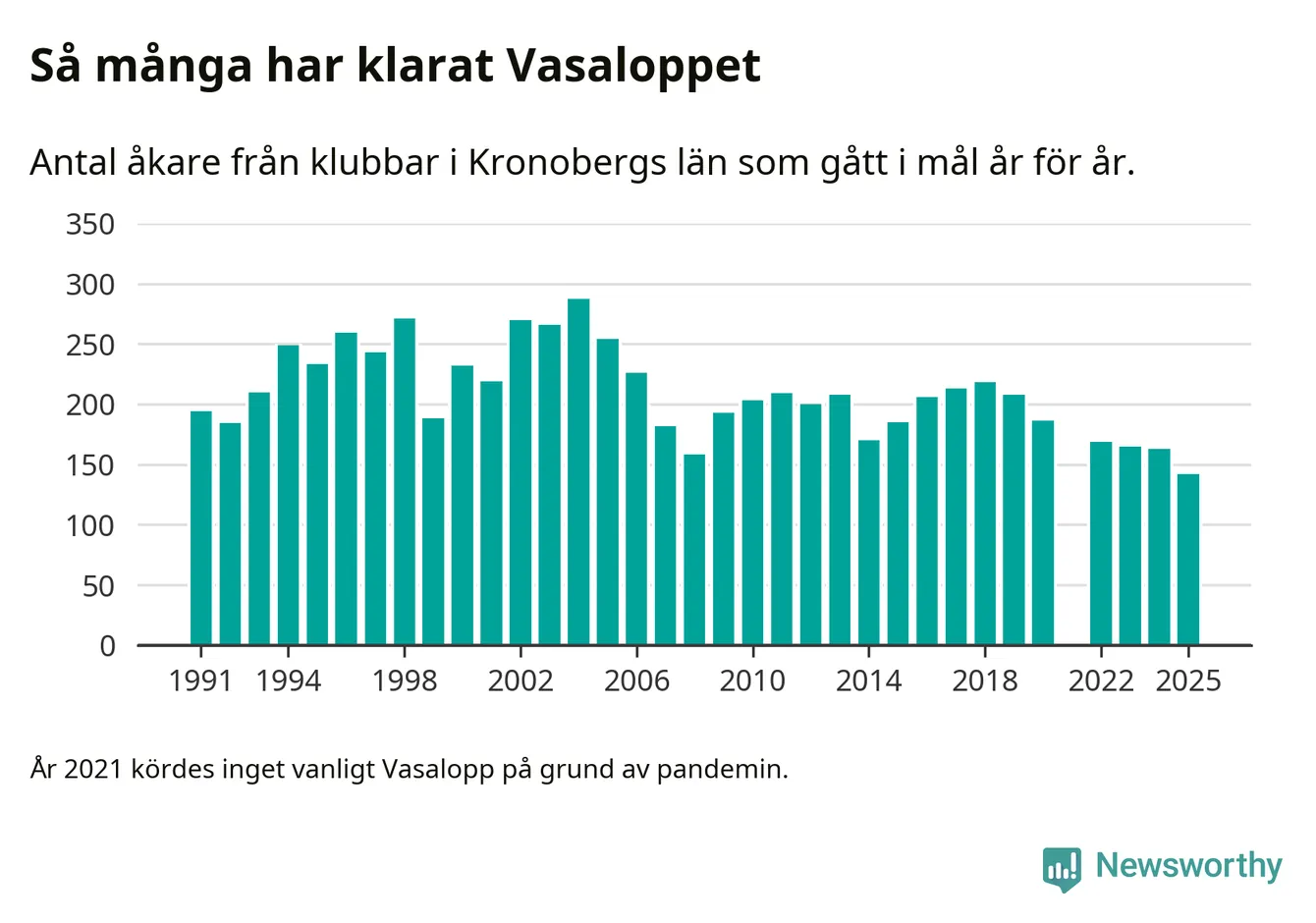 På söndag går starten för det 102:a Vasaloppet. Newsworthy har samlat in och sammanställt samtliga Vasaloppsresultat sedan 1991. Det ger en unik bild av hur skidåkare från klubbar i Kronobergs län har klarat sig genom åren.