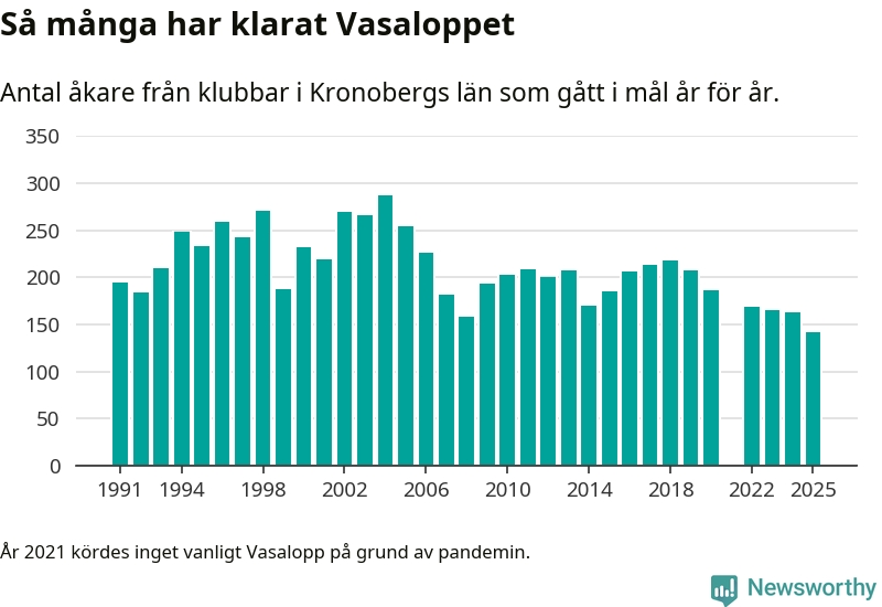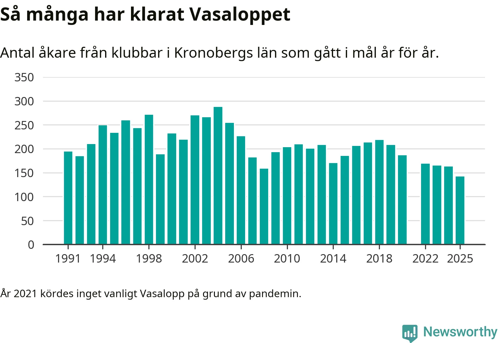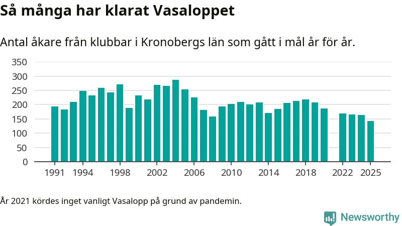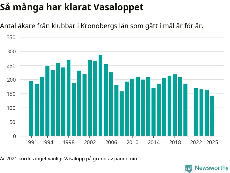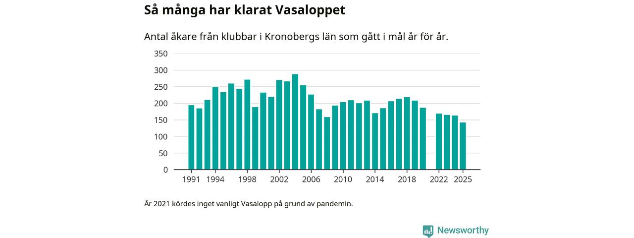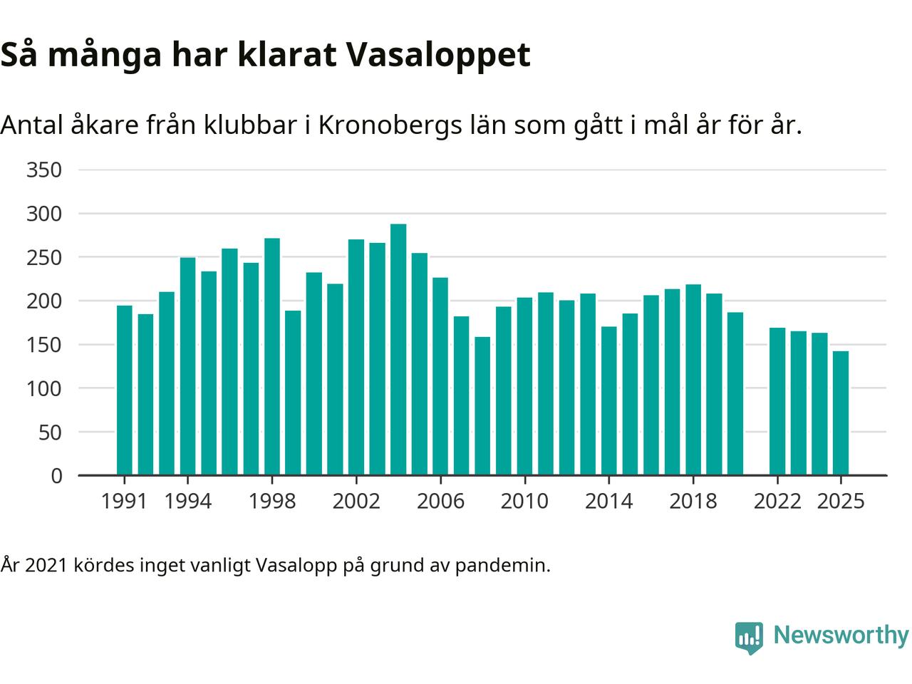 På söndag går starten för det 102:a Vasaloppet. Newsworthy har samlat in och sammanställt samtliga Vasaloppsresultat sedan 1991. Det ger en unik bild av hur skidåkare från klubbar i Kronobergs län har klarat sig genom åren.