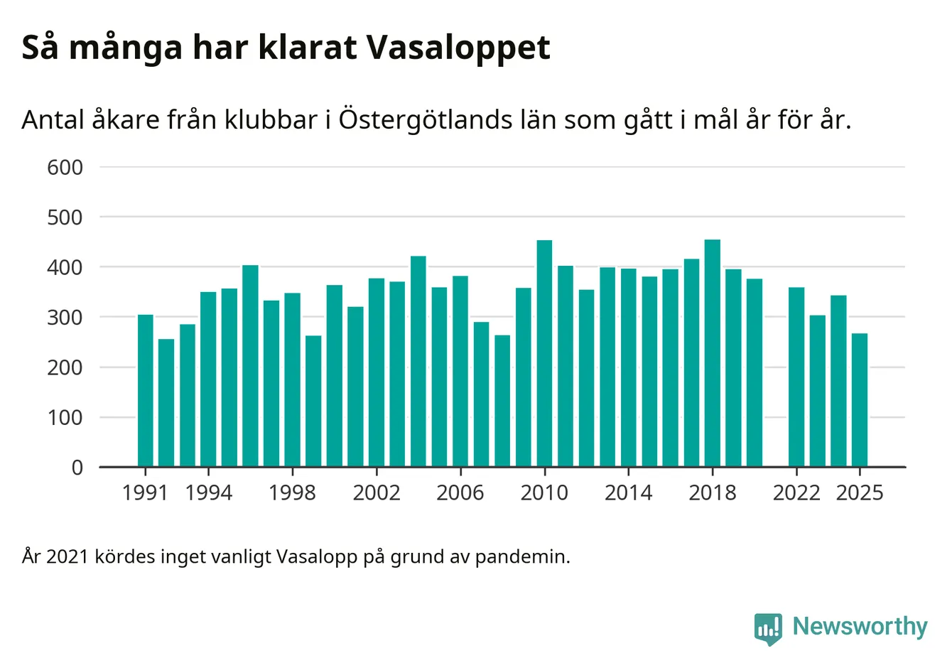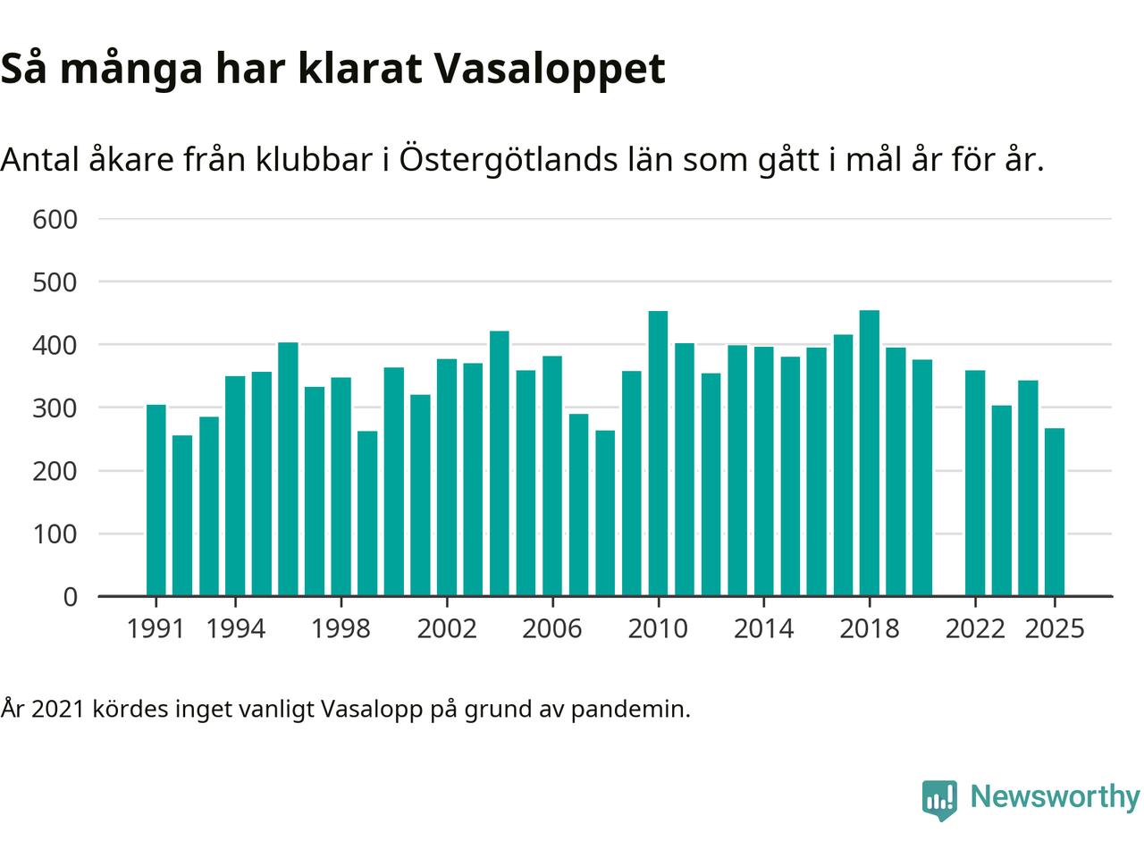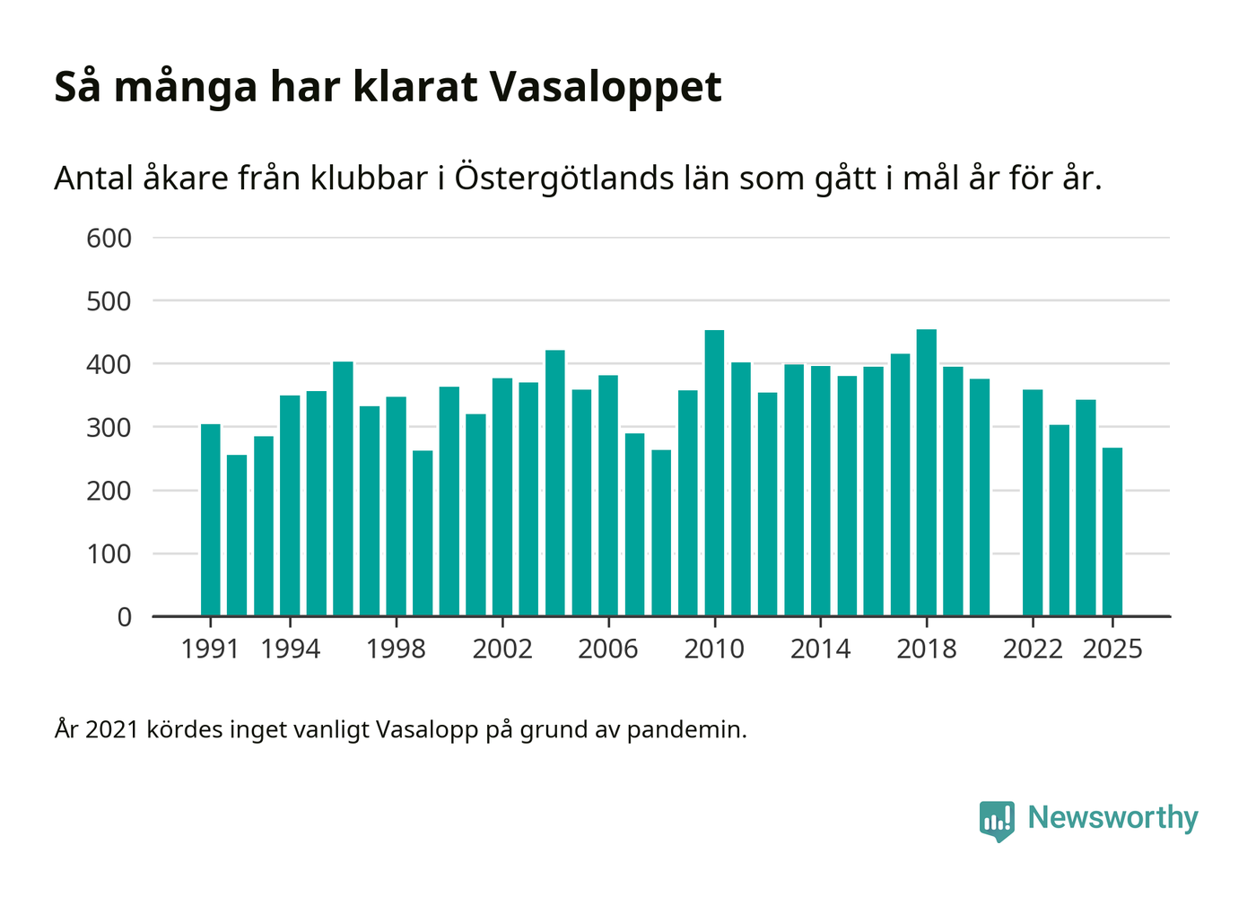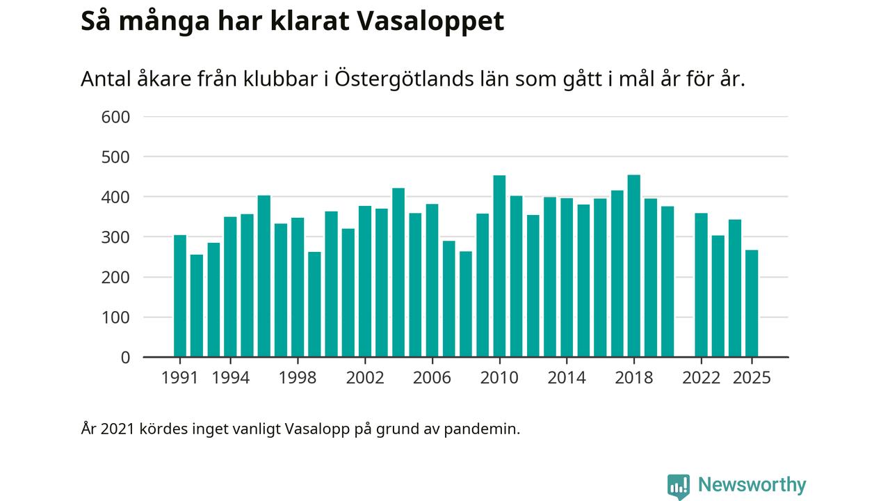 På söndag går starten för det 102:a Vasaloppet. Newsworthy har samlat in och sammanställt samtliga Vasaloppsresultat sedan 1991. Det ger en unik bild av hur skidåkare från klubbar i Östergötlands län har klarat sig genom åren.