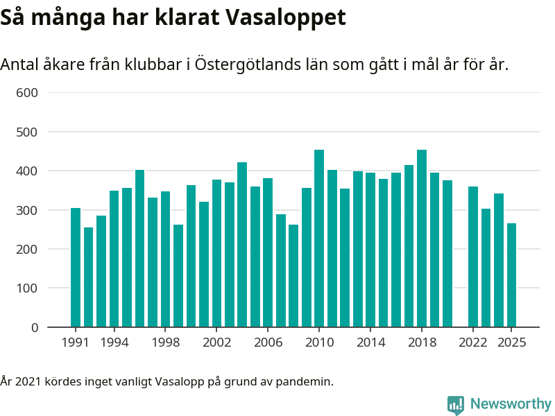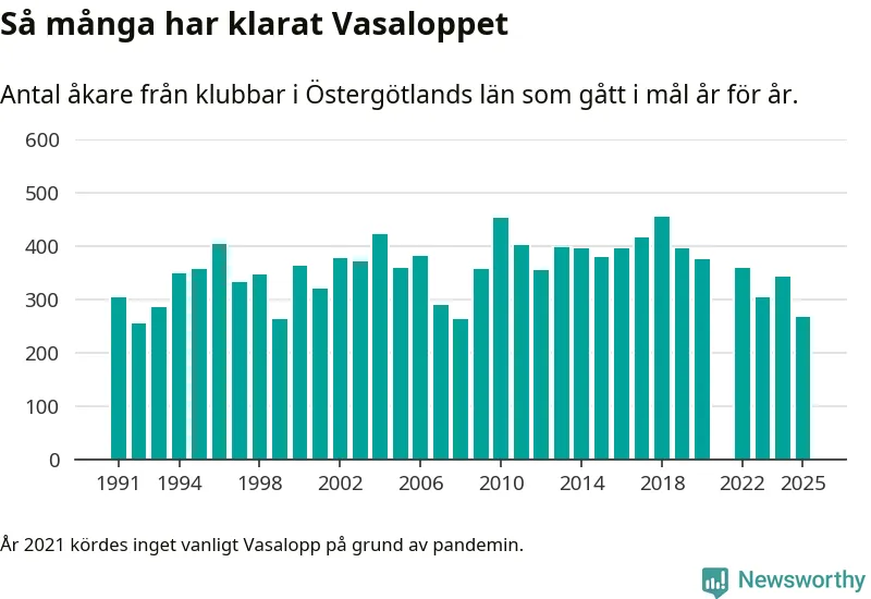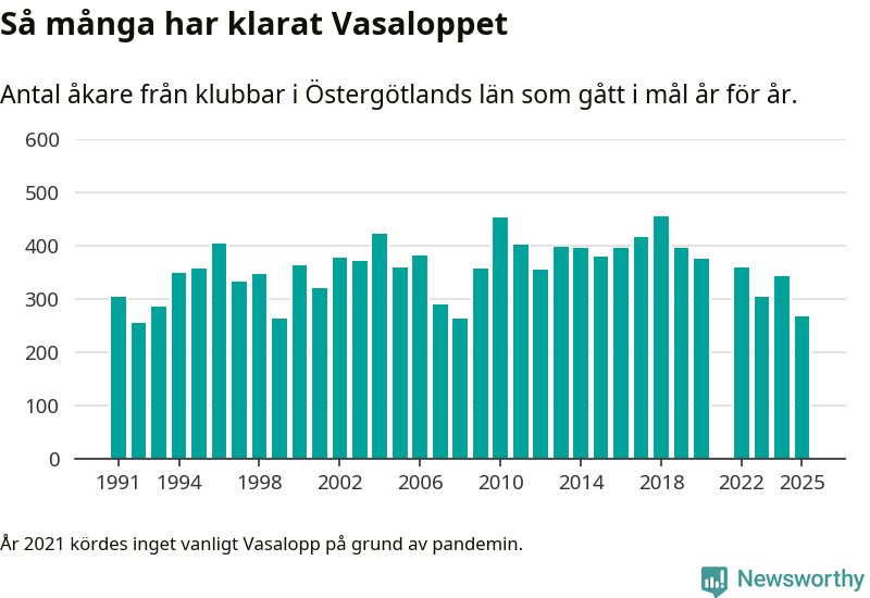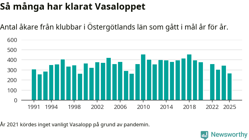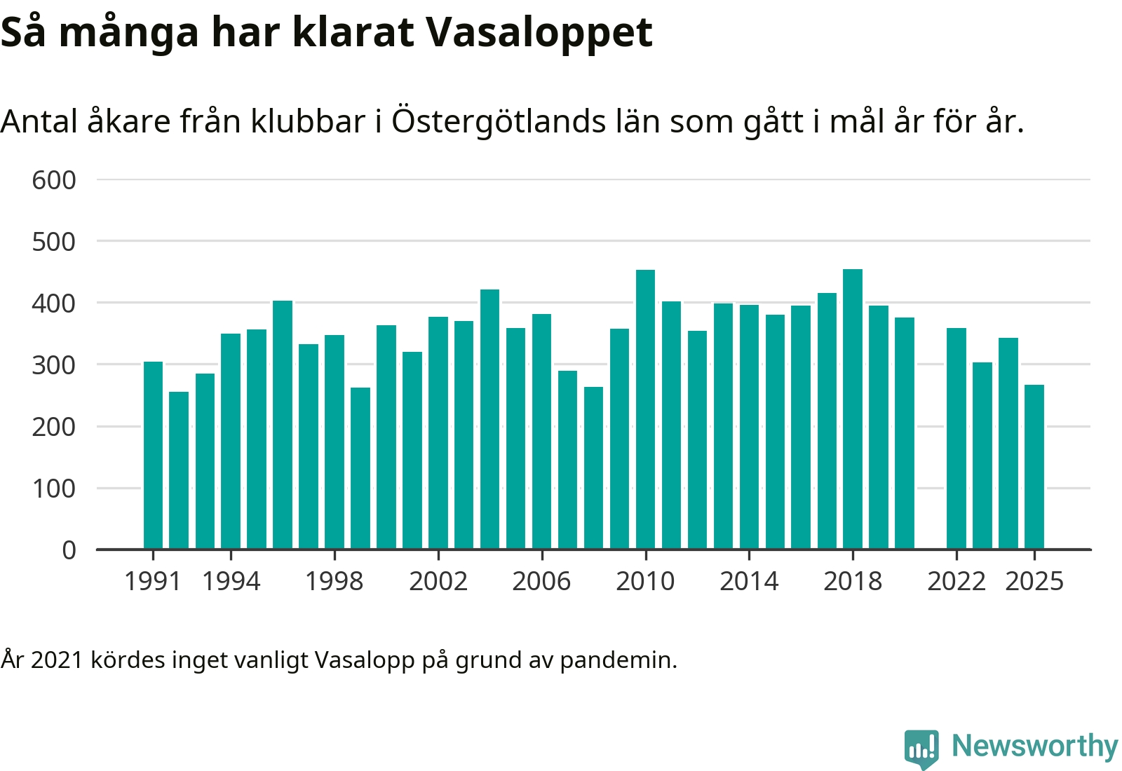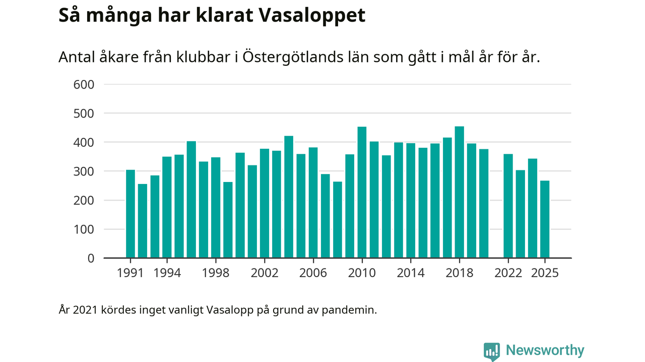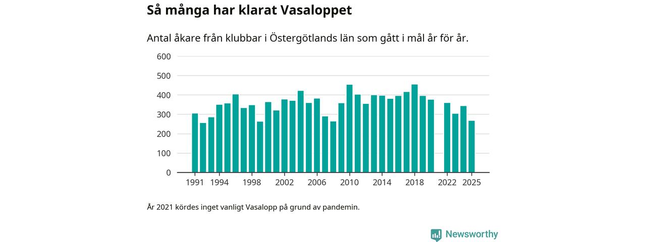 På söndag går starten för det 102:a Vasaloppet. Newsworthy har samlat in och sammanställt samtliga Vasaloppsresultat sedan 1991. Det ger en unik bild av hur skidåkare från klubbar i Östergötlands län har klarat sig genom åren.