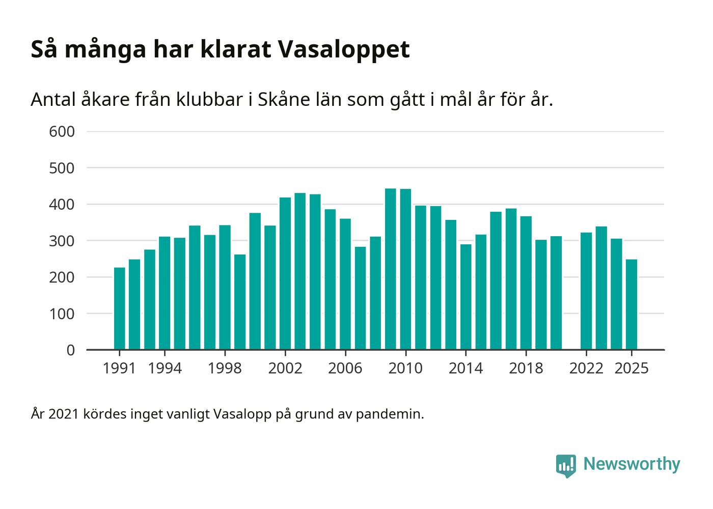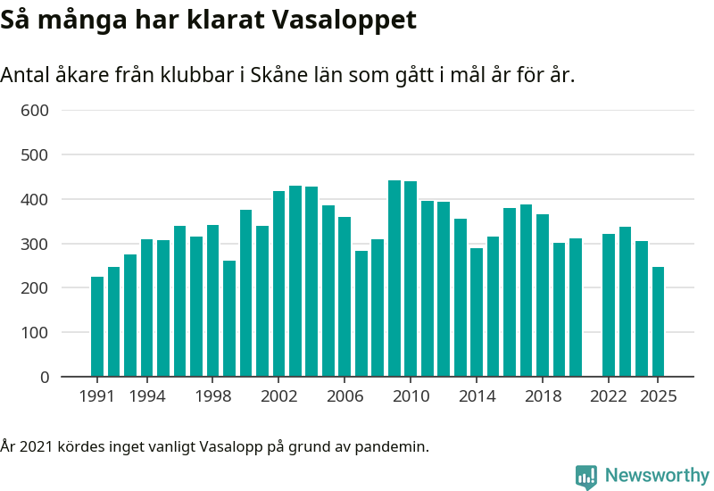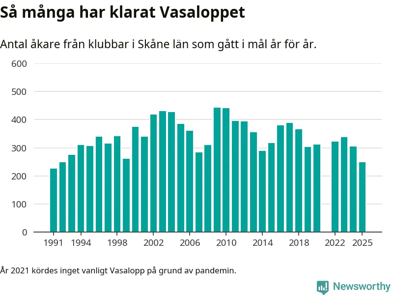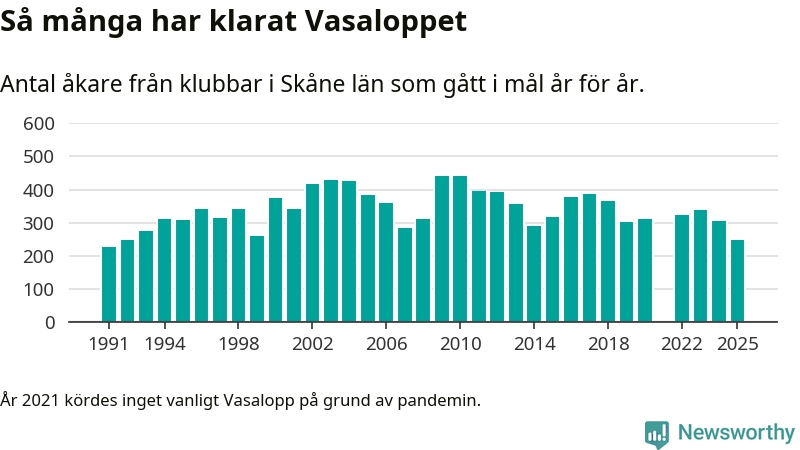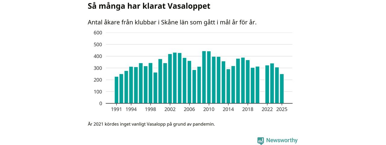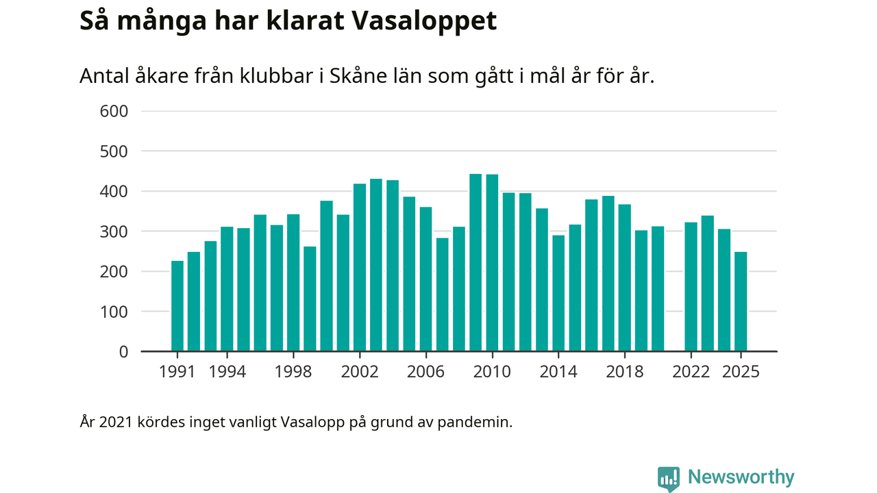 På söndag går starten för det 102:a Vasaloppet. Newsworthy har samlat in och sammanställt samtliga Vasaloppsresultat sedan 1991. Det ger en unik bild av hur skidåkare från klubbar i Skåne län har klarat sig genom åren.