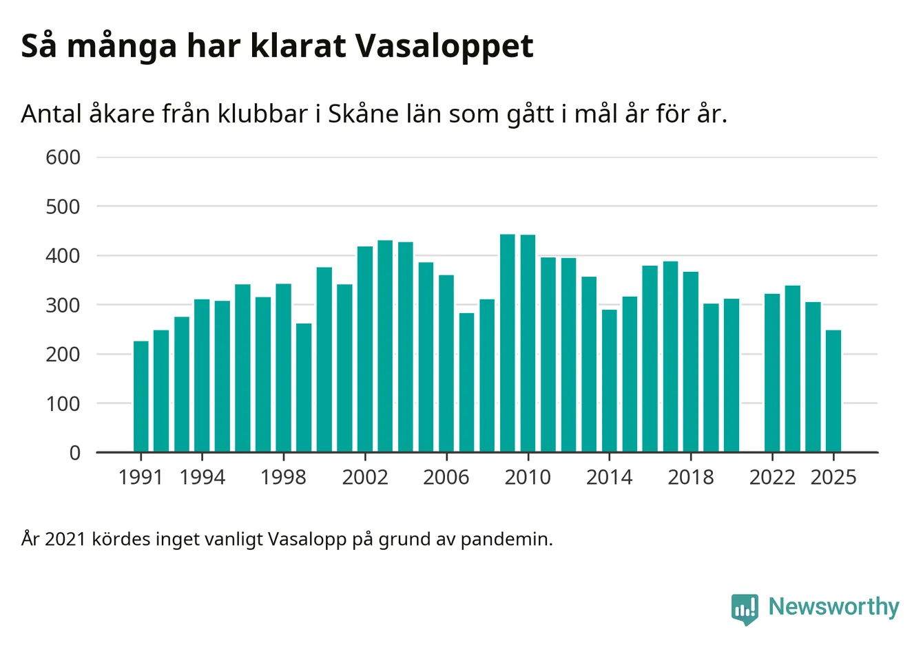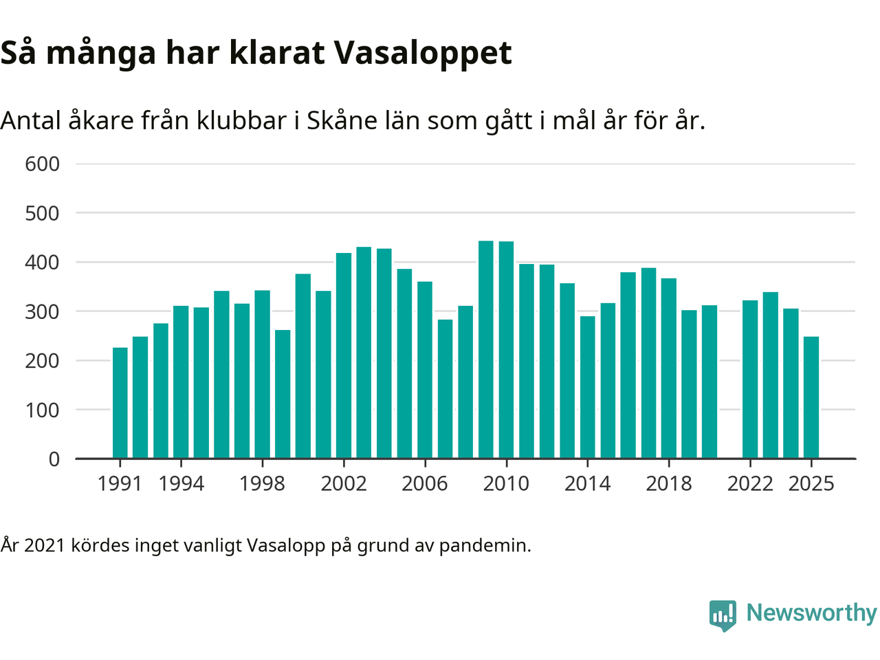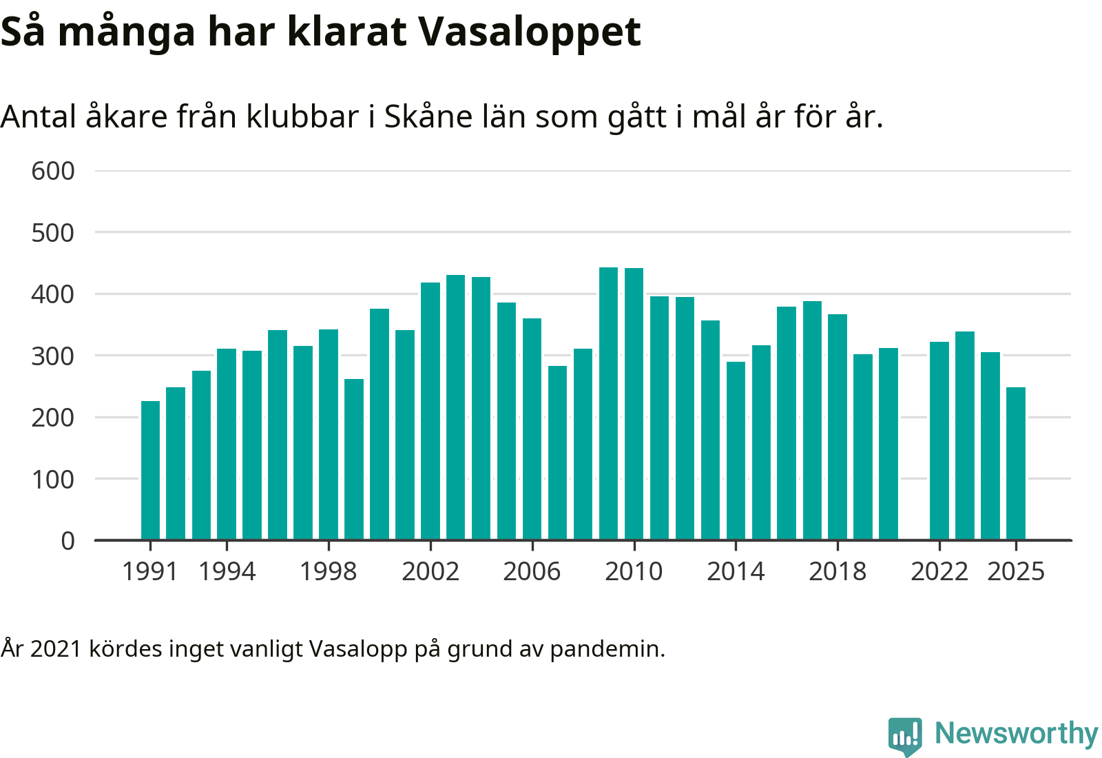 På söndag går starten för det 102:a Vasaloppet. Newsworthy har samlat in och sammanställt samtliga Vasaloppsresultat sedan 1991. Det ger en unik bild av hur skidåkare från klubbar i Skåne län har klarat sig genom åren.